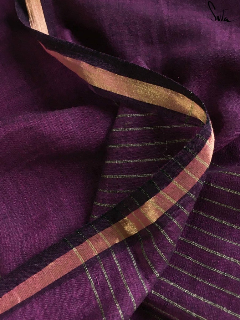 This is a made-in-heaven mul saree with Ghicha lines on the pallu and zari border.The mul cotton is what we call ˜made in heaven at Suta. Known in many parts of India as mul mul, the fabric is buttery soft, flowy and delicately beautiful. This fine 100% cotton weave of a fabric is extremely fluid! It is also very light and feels like second skin. It is also very practical as summer attire and dries easily in monsoons as well! With the right care, it becomes softer and softer with every wash and truly feels like a hug that wraps you in its love!Ghicha silk is a unique kind of silk made from silk threads obtained from the cocoons of a specific kind of silkworm, in a similar way as Tussar, except that here the fibres are made of cocoons that do not get reeled for Tussar silk due to being pierced or cut. The Ghicha detailing on the pallu and zari border bring the drape alive and it radiates prettiness!