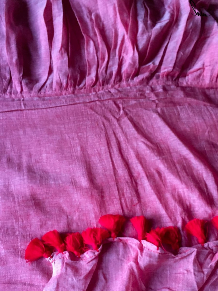 This saree is a playful splash of colour, crafted in whisper-soft mul cotton that feels like second skin. The vibrant pink hue brings instant cheer, turning every moment into a bright, blooming one.