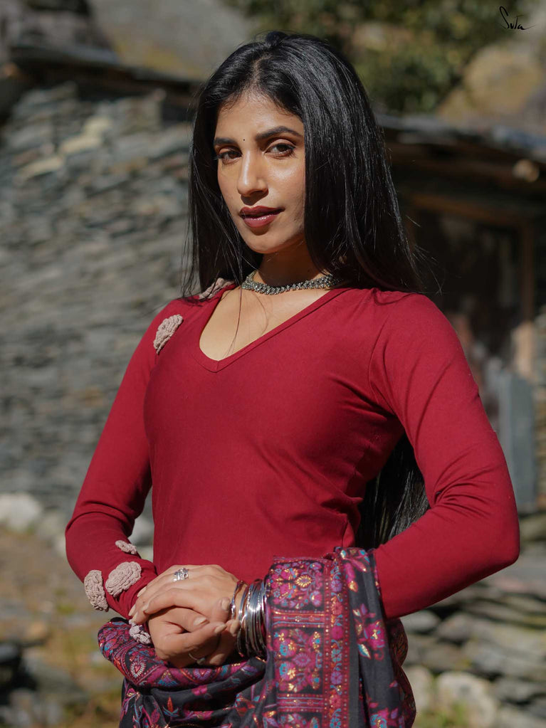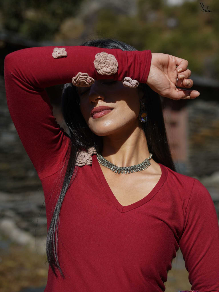 Brishti is one of our most skilled weavers. So many songs have been sung about rain, and we couldn’t think of a better way to honor her magic than in this blouse she made. This pink viscose-blend piece elevates any saree with its flattering V-neck and elbow-length sleeves. Padded and fitted with side elastic, it shapes beautifully while keeping you comfortable.