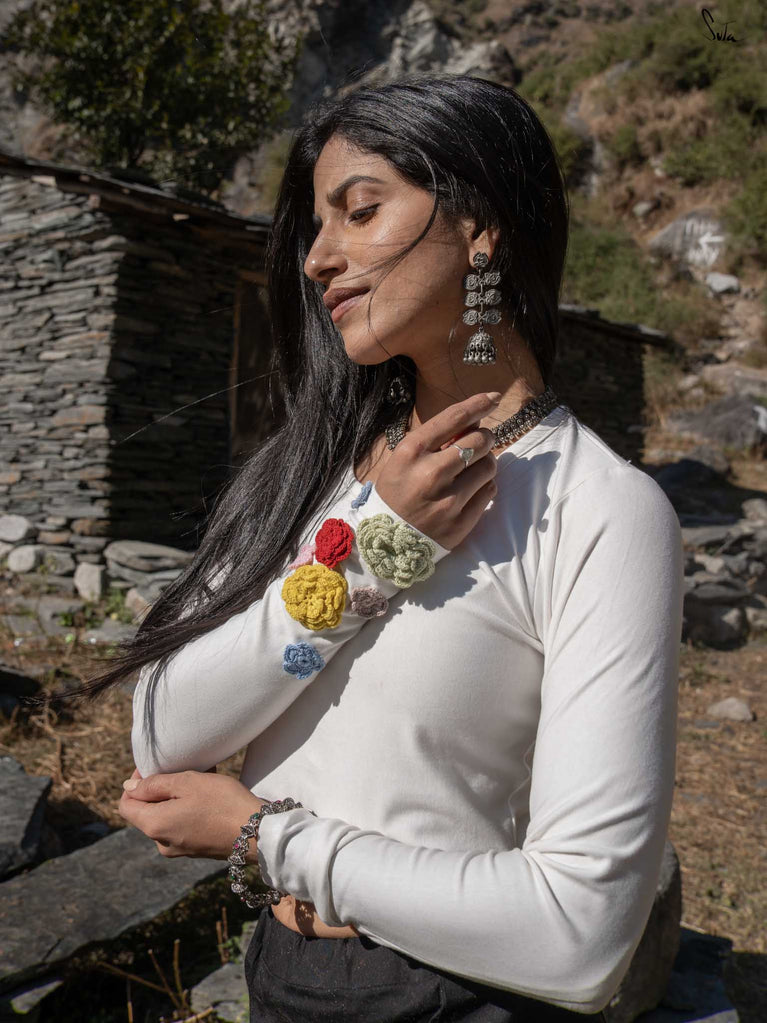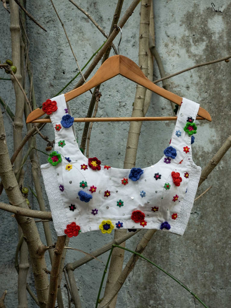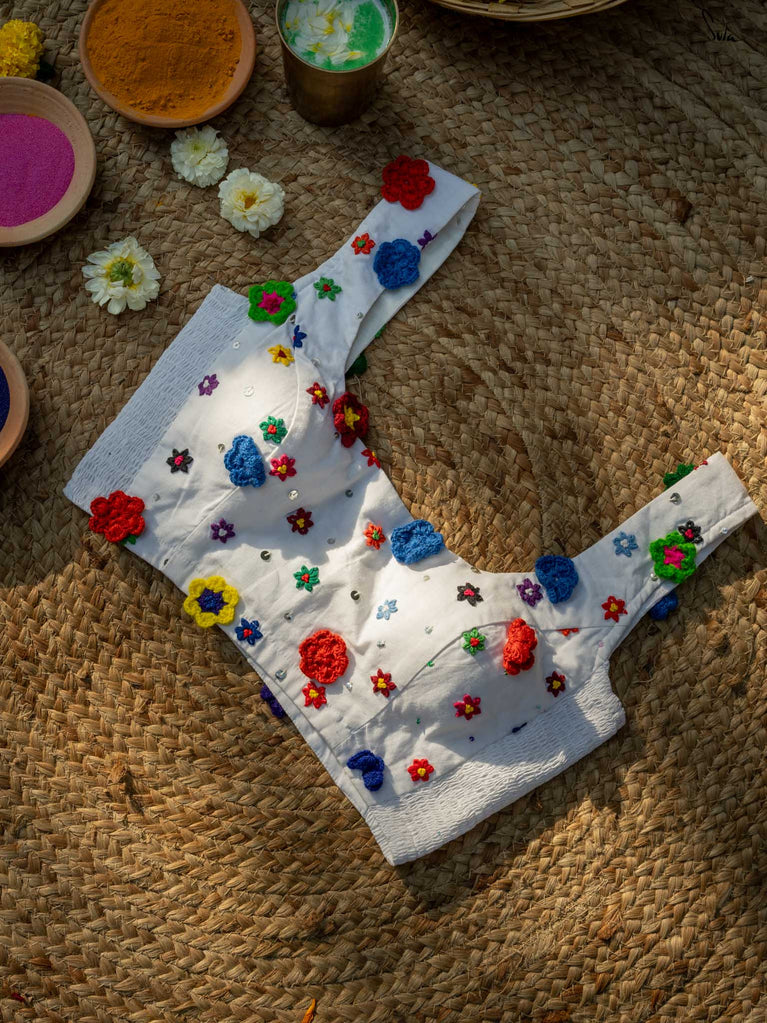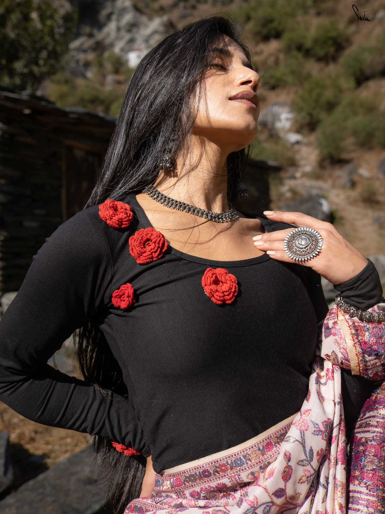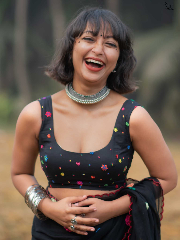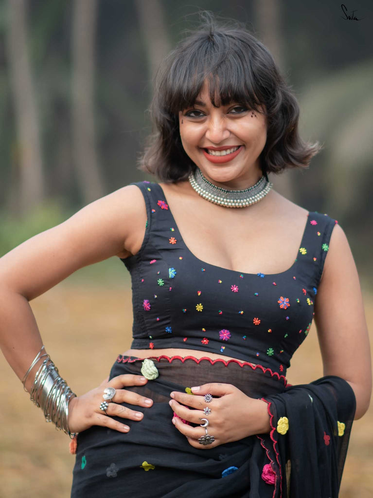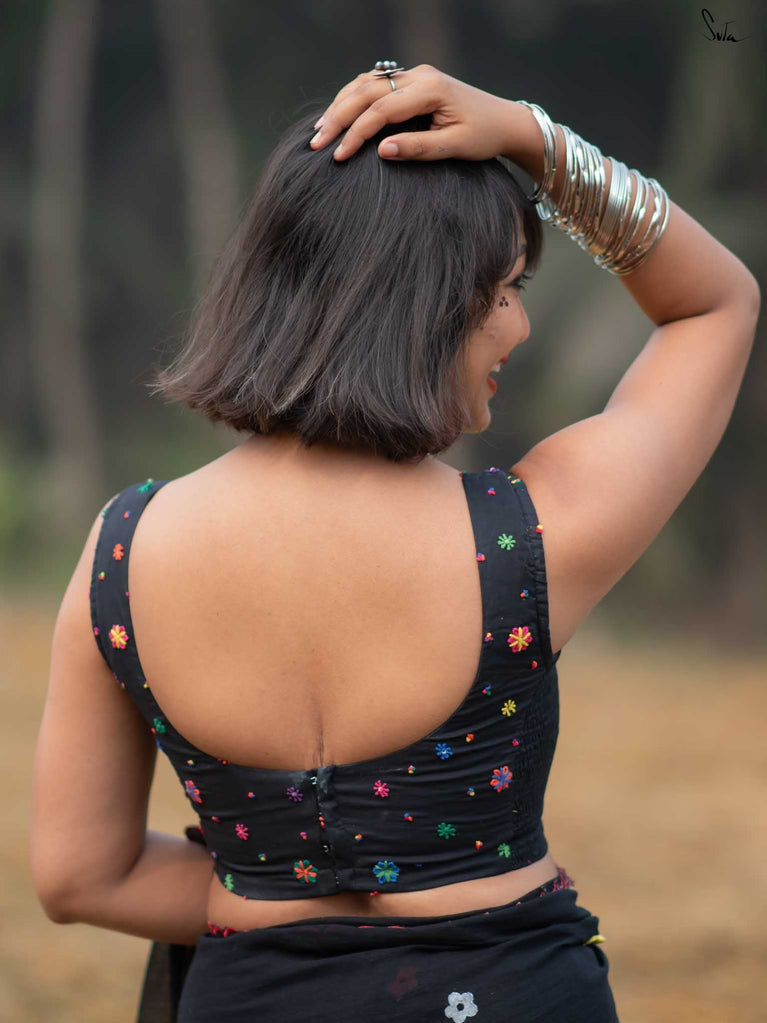 A blouse that blooms with beauty, this black sleeveless cotton piece is adorned with colorful embroidered flowers, capturing the lively spirit of Holi in every stitch. The Elas-Tech fit hugs your body perfectly, letting you move with ease and grace as you celebrate the colors of life. The elastic fabric stretches and molds to your shape, ensuring comfort and flexibility while you revel in the festivities. This blouse isn’t just a piece of clothing, it’s a moment, a memory, woven with floral joy. For the best fit, shop one size below, as the Elas-Tech expands and adapts to your body perfectly.