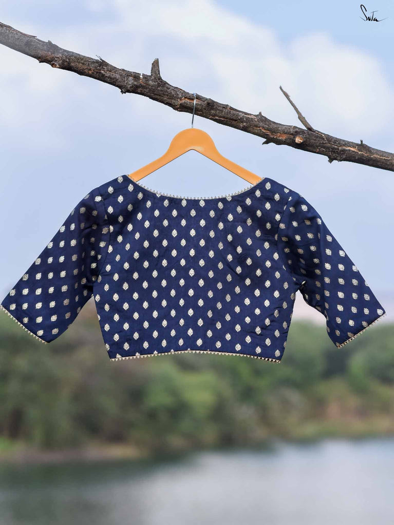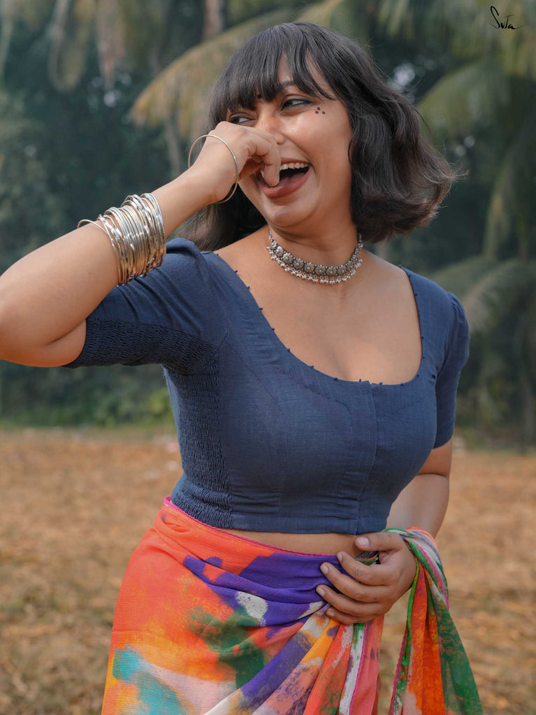 Timeless and graceful, this navy blue half-sleeved cotton blouse is your perfect partner for every Holi. The delicate French knot embroidery speaks of effortless charm, while the sleek U-neck and front hook opening make it as easy to wear as it is stunning. The Elas-Tech fit stretches to hug your body in a perfect fit, allowing you to move and revel in the festivities, wrapped in comfort and beauty. This blouse adapts to your movements, making you feel both stylish and at ease. For the ideal fit, we recommend shopping one size below, as it expands and molds to your body.