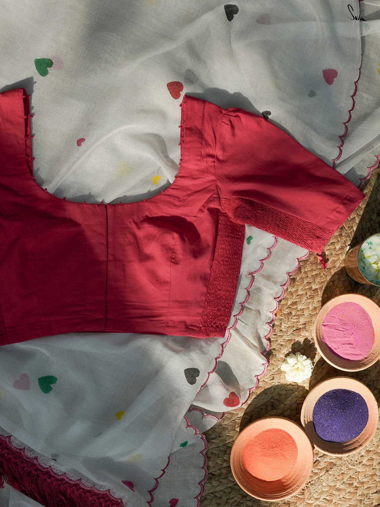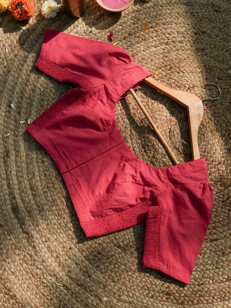 Fiery, fearless, and full of life, this sleeveless red cotton blouse is the perfect match for every Holi revelry. The bold U-neck, thick straps, and back hook opening create a structured, confident silhouette. With the Elas-Tech fit, it moves with you, ensuring maximum comfort as you dive into the festive spirit, feeling as good as you look. The 3-inch elastic shirring allows it to stretch, providing both flexibility and support.
