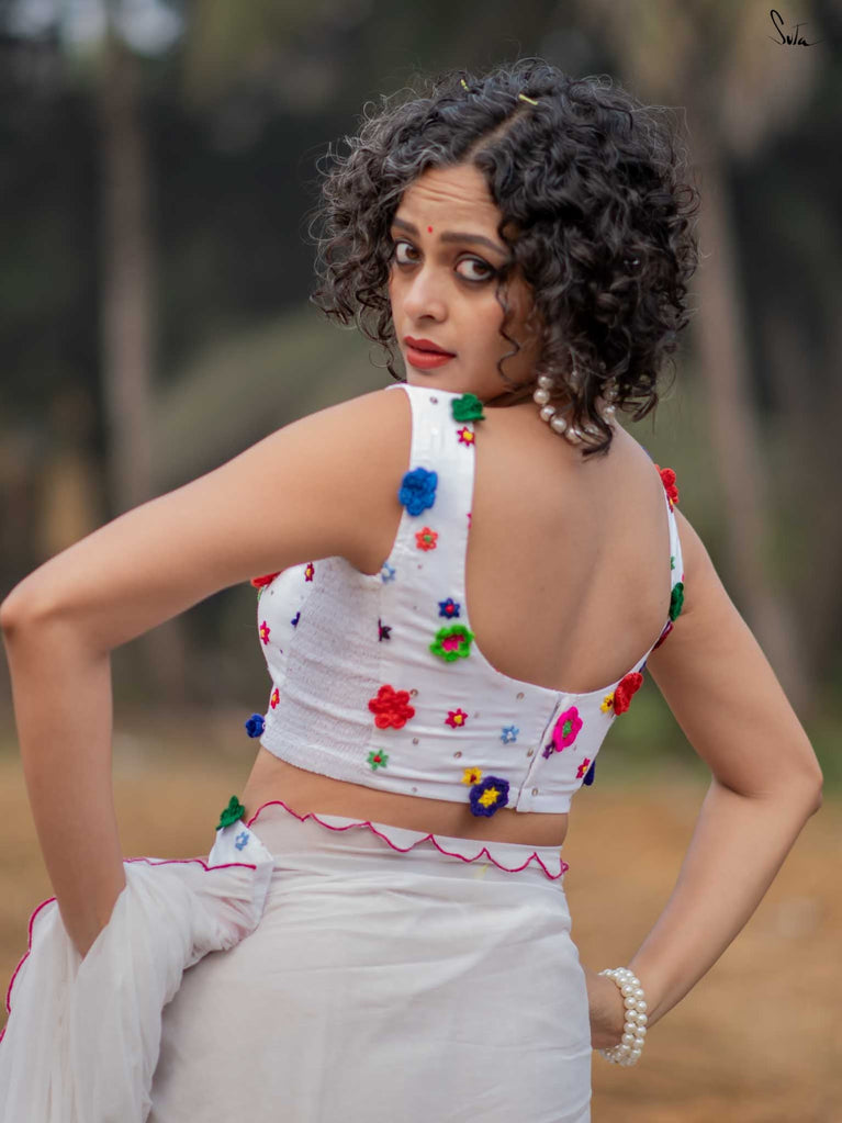 The model is wearing size S blouse and the saree is Dipped in Dreams