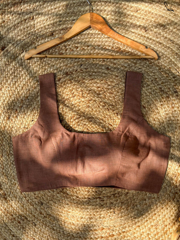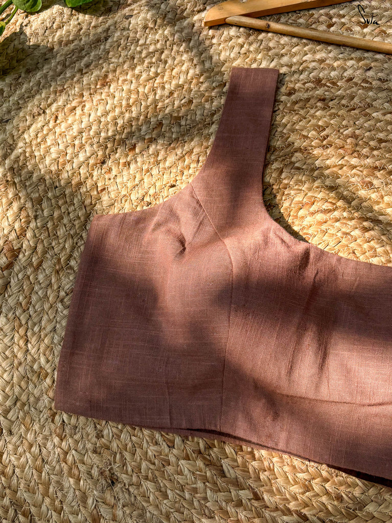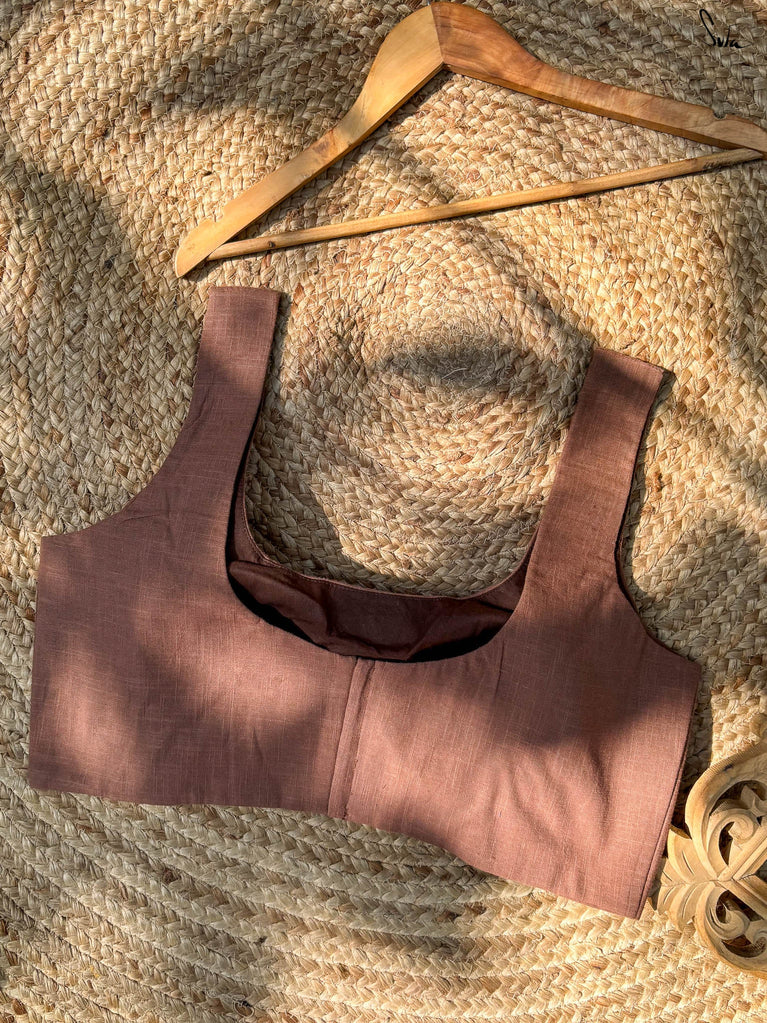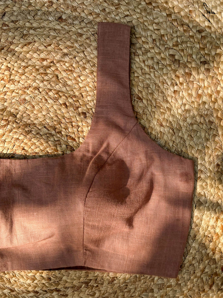 A little shimmer, a little sass, Uski Chaandi is all heart. This purple linen blouse is a playful take on timeless elegance, featuring delicate machine embroidery that glows like starlight. The V neckline and sleeveless cut lend it a modern, flattering silhouette, perfect for drapes that call for a hint of bold charm. It’s that one blouse you’ll reach for again and again when grace needs just a touch of mischief.
