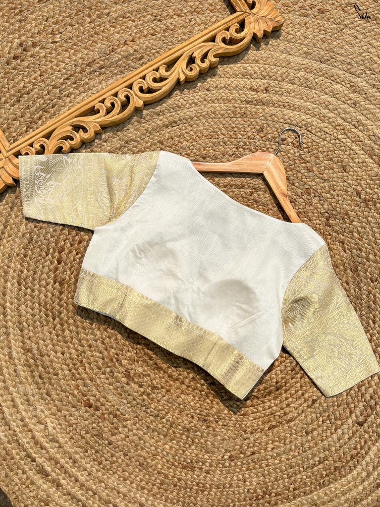 This off-white silk organza blouse features delicate gold zari stripes that lend it a subtle shimmer and graceful texture. Designed with a sleeveless silhouette and a striking halter V-neckline, it brings a modern elegance to the classic blouse. The padded structure offers shape and comfort, while the front opening ensures ease of wear.