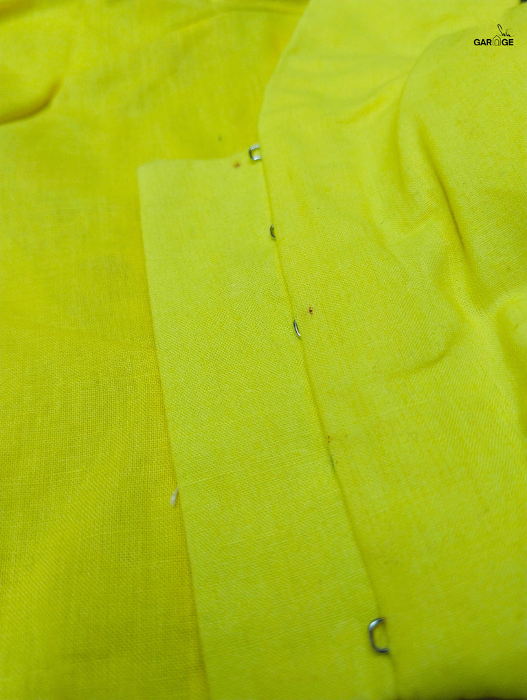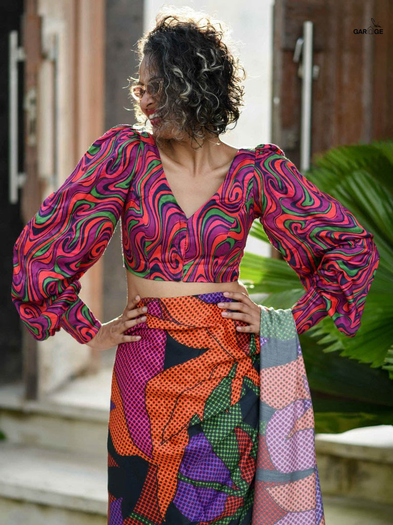 Cotton fabric dates back to some of the most ancient civilisations and it has a strong presence in the modern wardrobe as well. The incredible softness and lightness of cotton combined with its strength and versatility makes it one of the most popular choices, especially for the Indian climate. The comfort and the amazing feel that cotton offers in unparalleled! The fabric used for this blouse is a machine-embroidered cotton fabric which is also known as Hakoba cotton.The ruffle detailing on the blouse is made of organza fabric.Organza is a type of weave that creates light-weight, breathable, dreamy, translucent fabric that brings a certain ethereal charm to apparel. This weave also renders a characteristic stiffness, which beautifully comes together with the overall fluidity of the fabric. Organza can be made with different types of fibres. For this blouse, the organza weave is made of polyester.