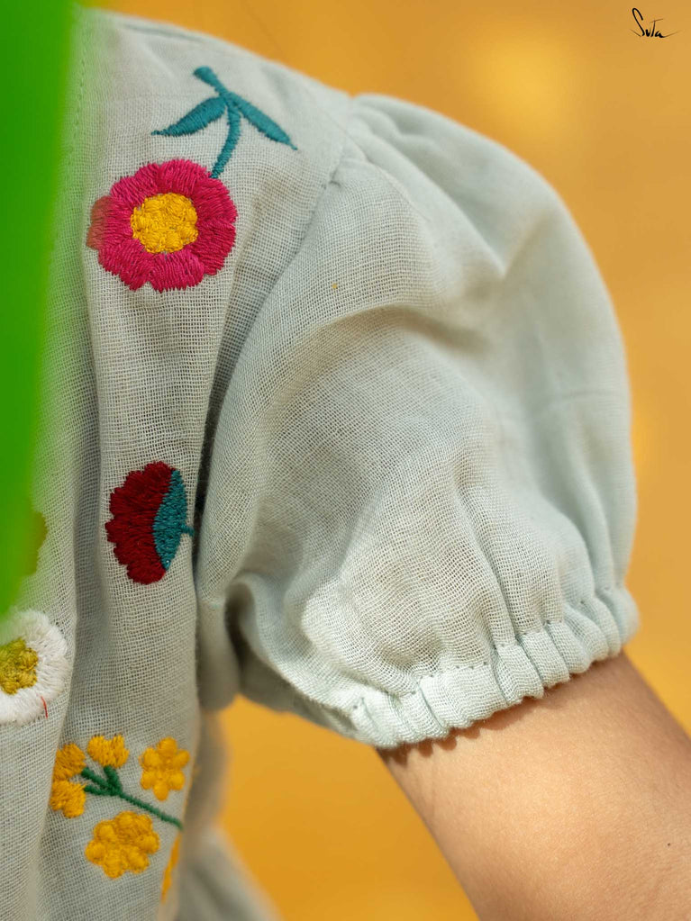 “It’s raining clouds, not cats and dogs!” Say hello to this little bunch of clouds stitched into a frosted mint daydream. This fully embroidered dress floats in with a sky full of whimsy, crafted from cloud-soft double-cloth cotton and sprinkled with magic from top to hem. Delicate buttons peek from the back like hidden stars, perfect for moonlit pirouettes and twinkly bedtime tales.