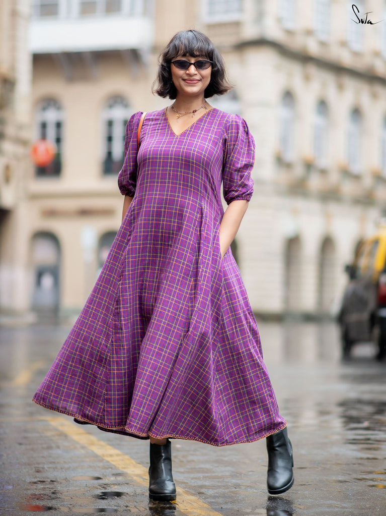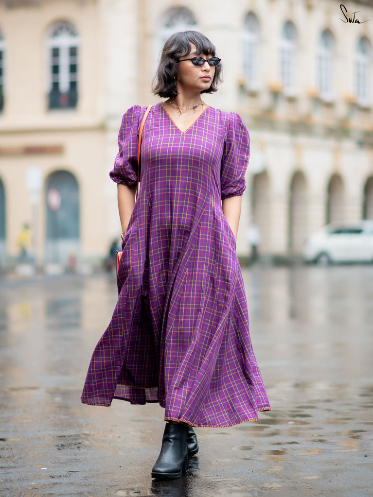 Checks with a twist! This purple cotton midi dress redefines a classic in V-neckline with contrasting mustard blanket stitches, a design detail that subtly draws attention. The breathable cotton keeps it summer-ready, while the puff sleeves and easy flare make it an all-day comfort pick. It’s your go-to for market strolls, casual catch ups, or just feeling cute on a weekday.