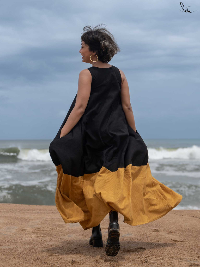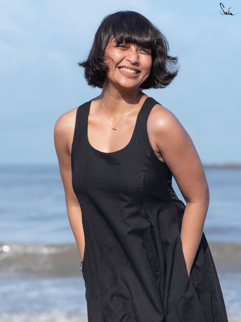 Own the spotlight with a dash of drama, draped in the stylish "Ebony Escape". The black sleeveless cotton dress consists of a chic U-neckline and back button opening, inviting freedom of movement. Its sleek silhouette and sophisticated details evoke a sense of calm, making it a perfect choice for events that demands effortless elegance!