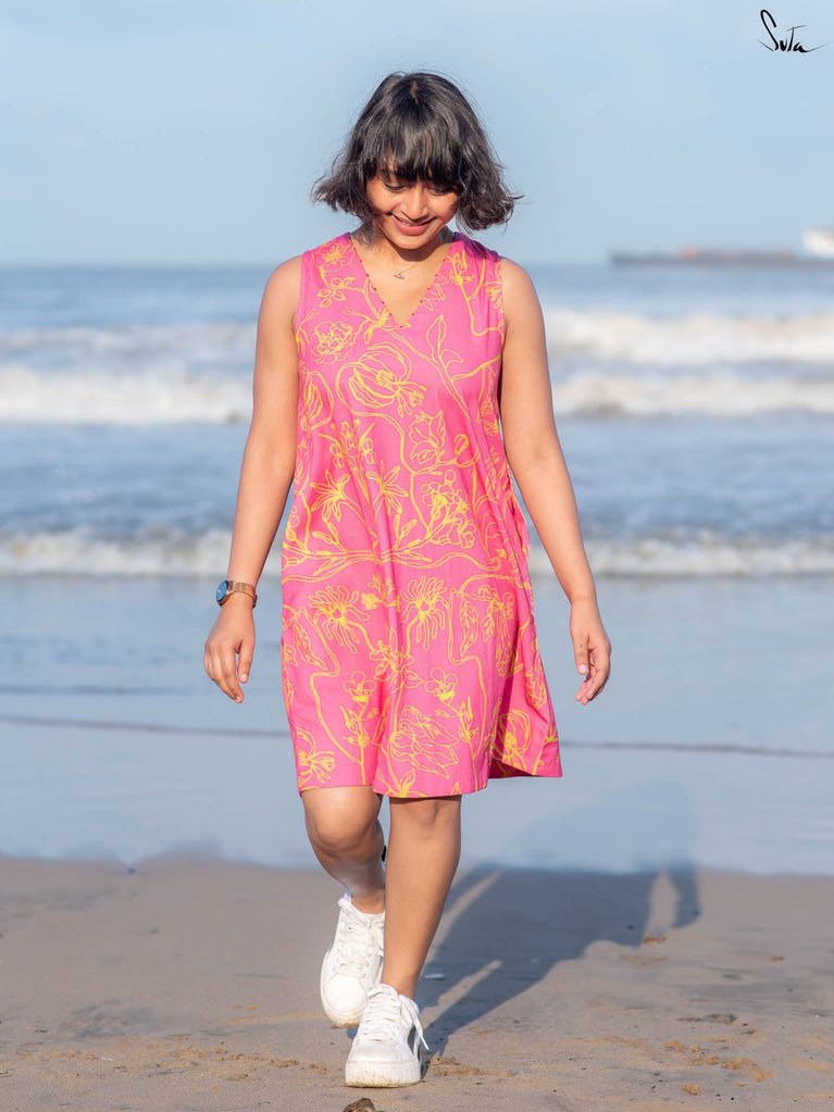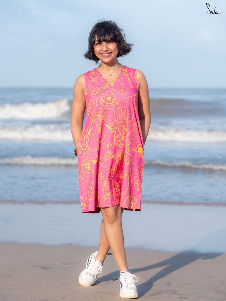 This digitally printed cotton dress is vibrant but wearable, think tropical florals with a sunlit edge. Cut in a sleeveless, V-neck silhouette with French knots stitched along the neckline, it pairs bold prints with subtle detail.