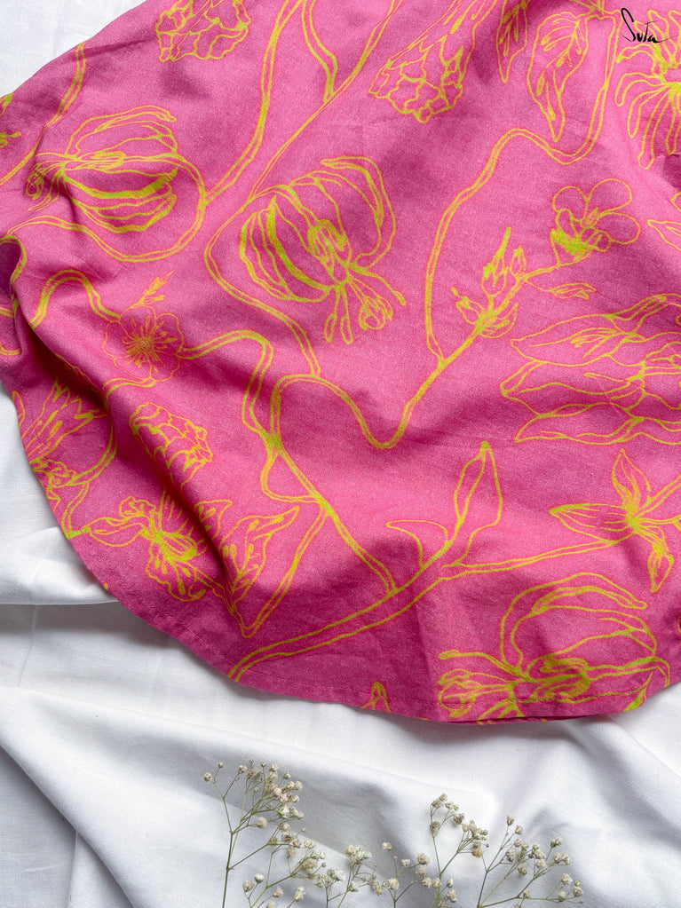 Like a sleepy seaside morning wrapped in sunshine, this breezy cotton dress is a daydream stitched with love. The in-house print, a bloom of summer flowers in soft peachy tones, sways gently like they’ve caught the scent of sea salt and freedom.