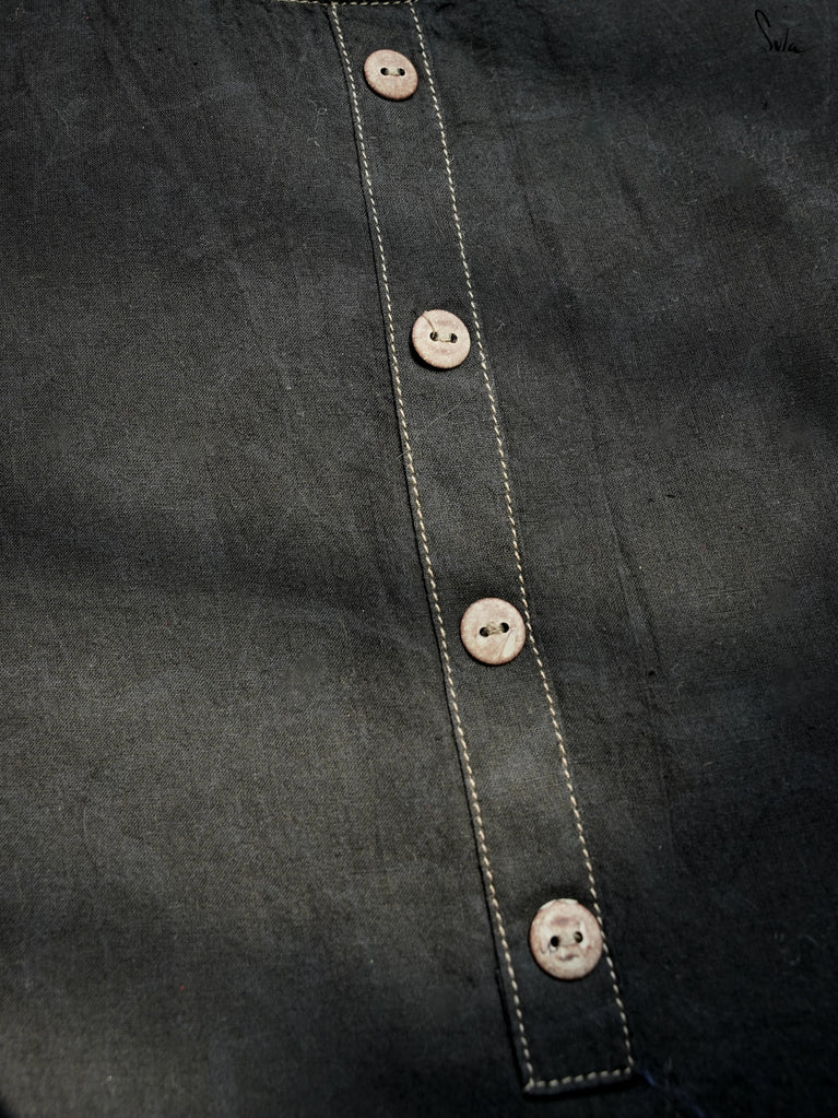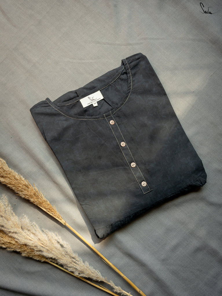 The handloom cotton garment is naturally-dyed using plant-based dyes. The overlap allows for more freedom of movement and comfort.
