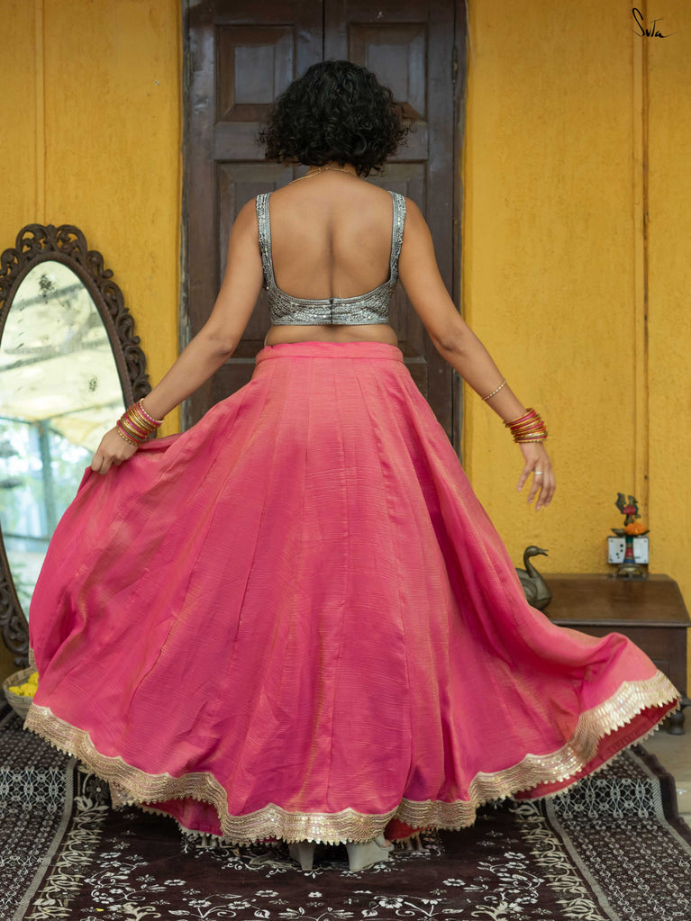 A lively mix of pink and red - bold, joyful, and made for celebrating your people. This crushed viscose lehenga is designed for wedding days that are all heart and movement. Light on the body with a soft festive sheen, it flows easily from laughter to dancing without missing a beat. Scalloped gold lace adds a gentle shimmer, while tassels keep things playful and fun. Style it with a blouse, drape it with a saree, or wear it as a skirt with your favourite crop top. Because when it’s yaar ki shaadi, you dress up, show up, and celebrate hard.