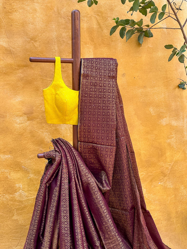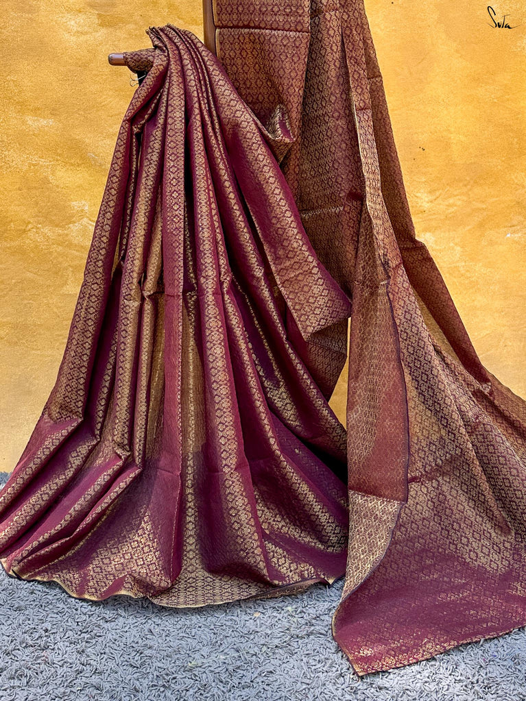 A deep wine hue that feels festive, warm, and quietly striking. This crushed viscose lehenga is made for wedding days that stretch into late nights, when comfort matters as much as celebration. Light, fluid, and softly lustrous, it moves with you through every hug, step, and dance. The scalloped gold lace adds a touch of glow, while tassels bring in that little hint of fun. Wear it with a blouse for a classic festive look, drape it with a saree, or style it as a skirt with your favourite crop top. Because mama ki shaadi calls for joy, without the heaviness.