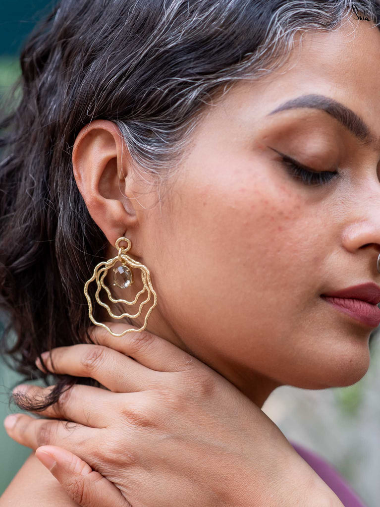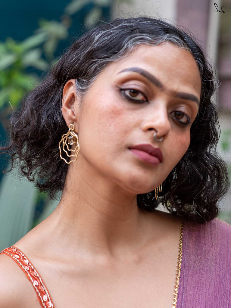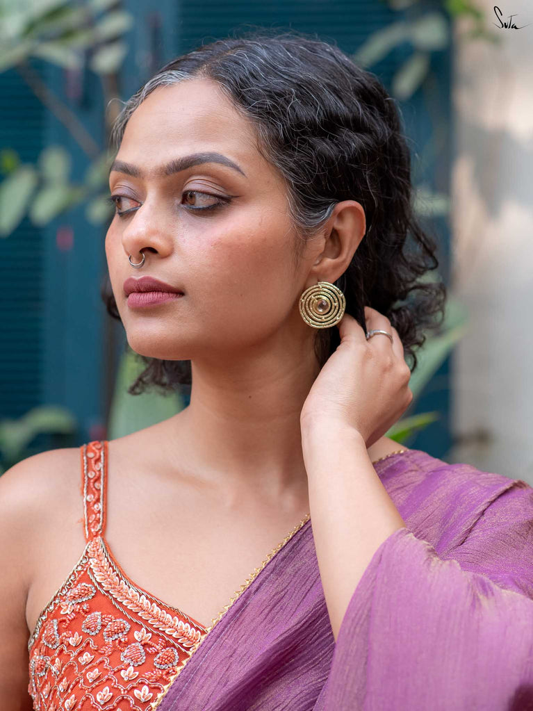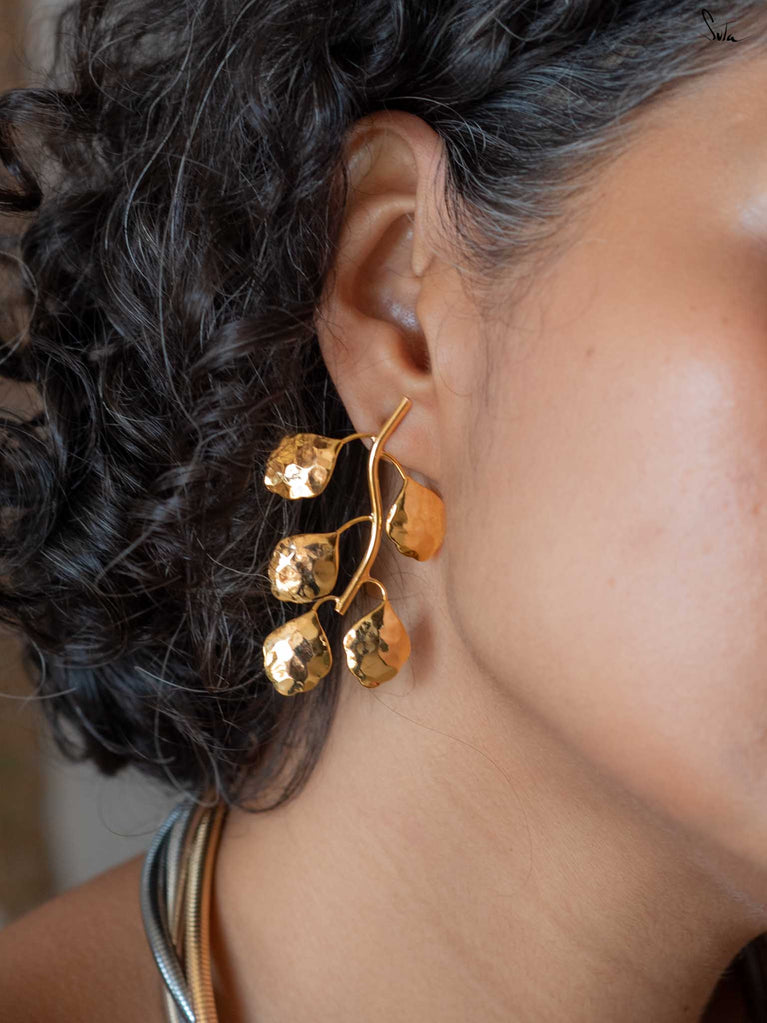 Like the mystical folds of the lotus, a symbol of enlightenment, resilience and rebirth, this collection of hammered brass jewellery is versatile, multi-faceted and mesmerising. Each unexplored frond of our stunning floral designs unravels a delightful new dimension of its wearer. Each little detail draws us back to the beauty of the little things. Painstakingly crafted by hand, resplendent in the most elegant matte gold, Padmini is the crowning glory of all of Suta’s creations. These pieces are perfectly suited to our gorgeous sarees, our statement blouses, our beautiful kurta sets, and our breath-taking lehengas. Put together, they create an aesthetic that is unmistakably Suta. A vibe that is unmistakably YOU.