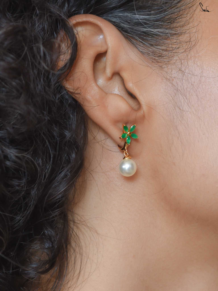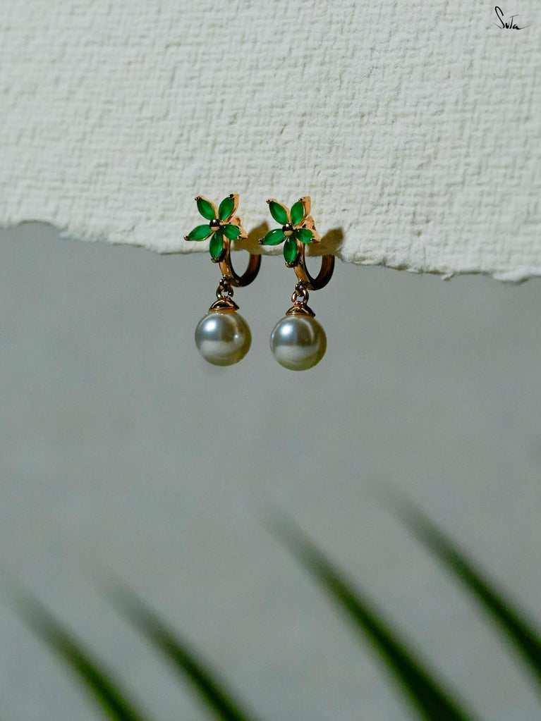 Screw earrings in silver-brass alloy with pearl and emerald. A bloom mid-whisper, petals wrapped around hope.