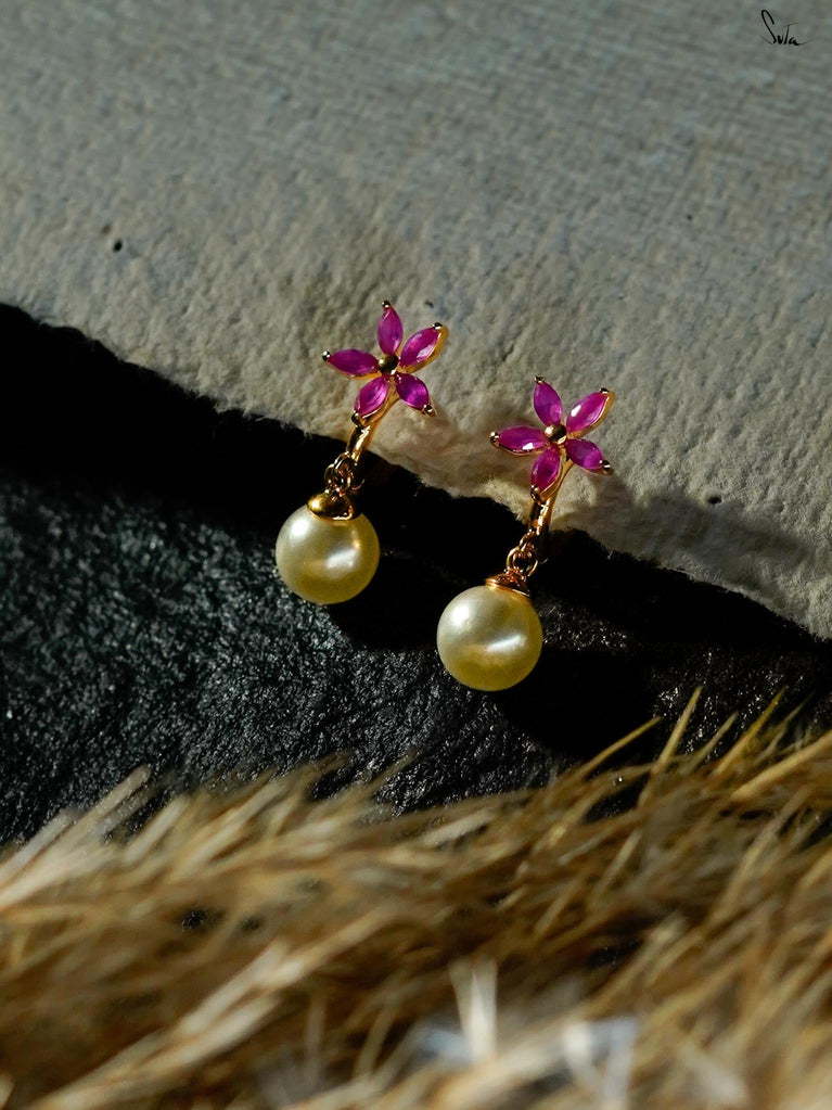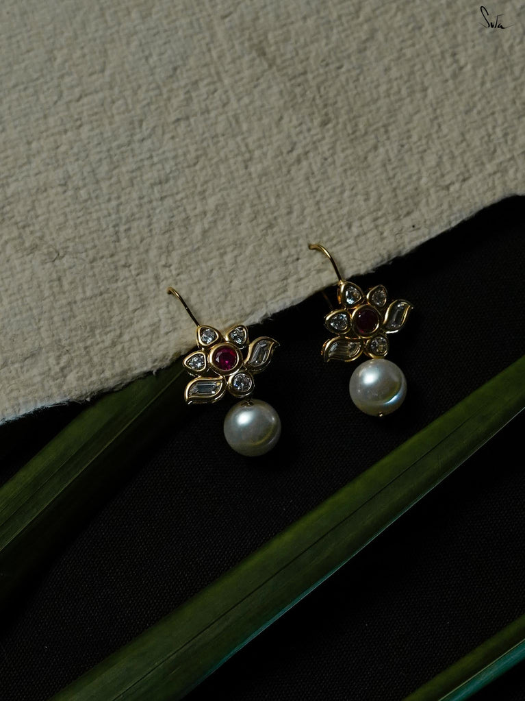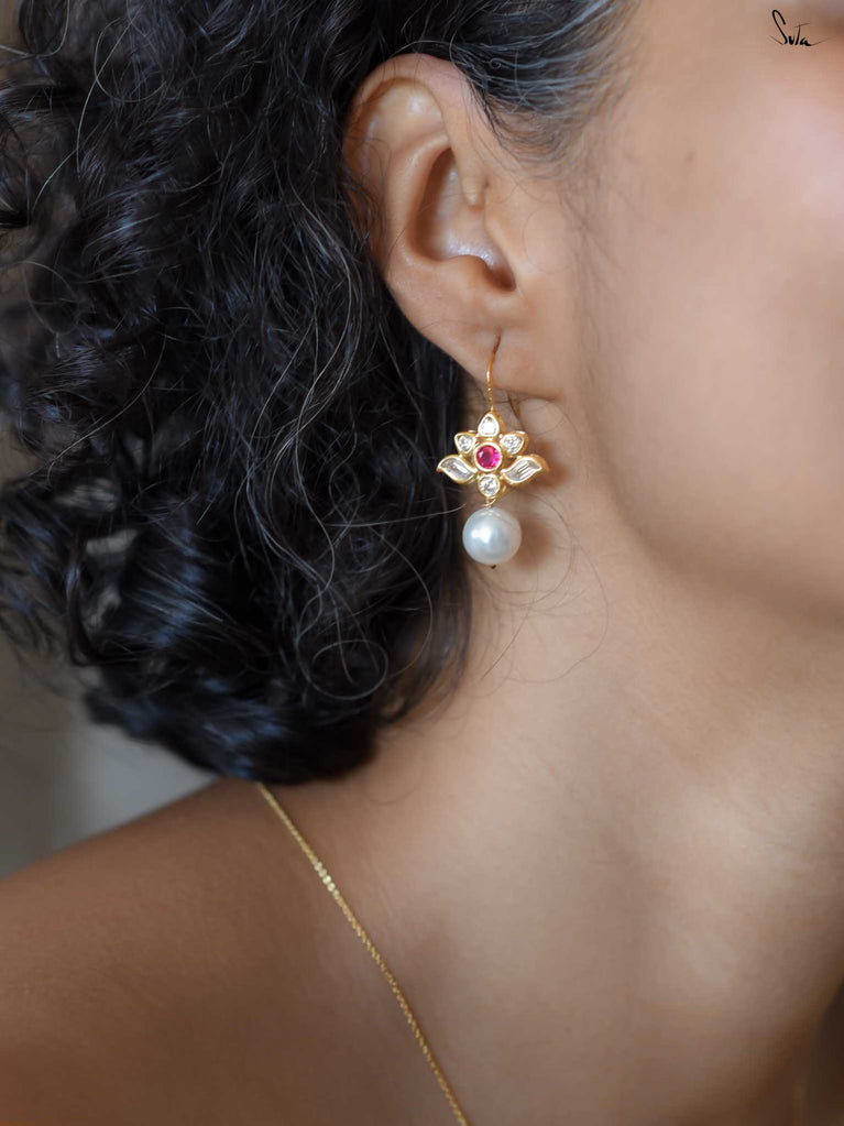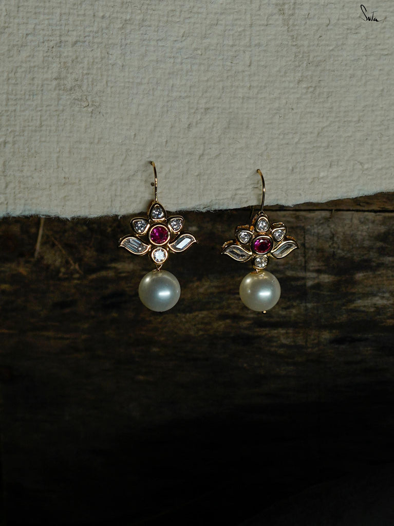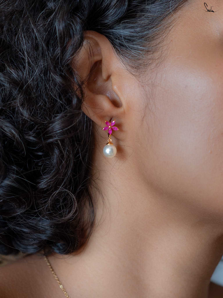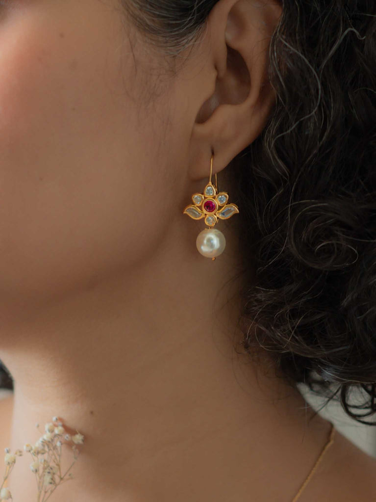 Fish hook earrings in 92.5 silver with a micro-gold finish, pearl, AD, and ruby. A gentle spark of red where warmth meets grace. A pearl wrapped in spark. Warmth with edge.
