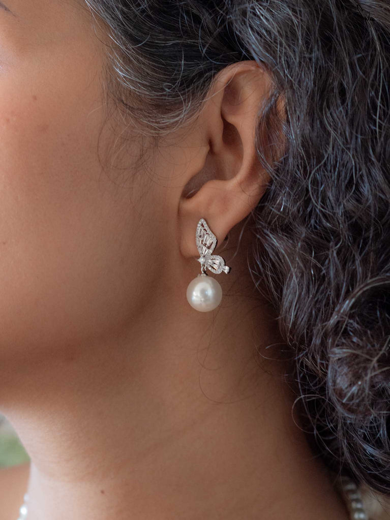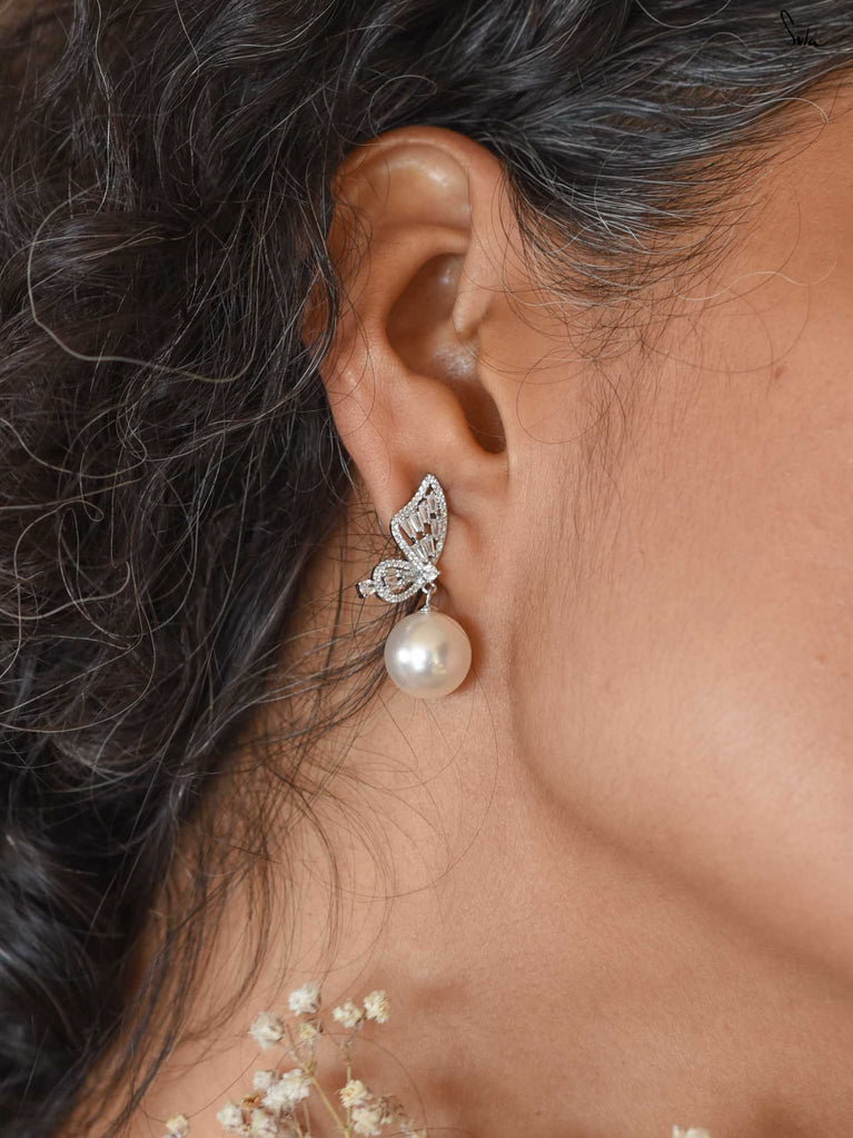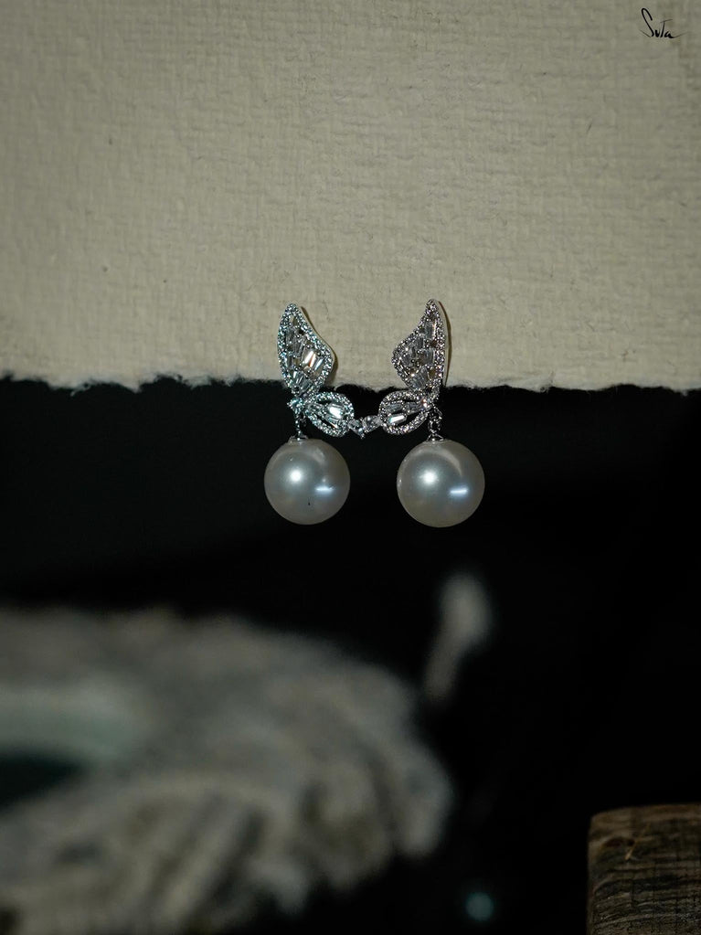 Inspired by the delicate moment before flight, transformation held in stillness. Screw-back earrings with pearl and cubic zirconia, crafted in 92.5 silver with a chrome finish. Wear all day, every day!