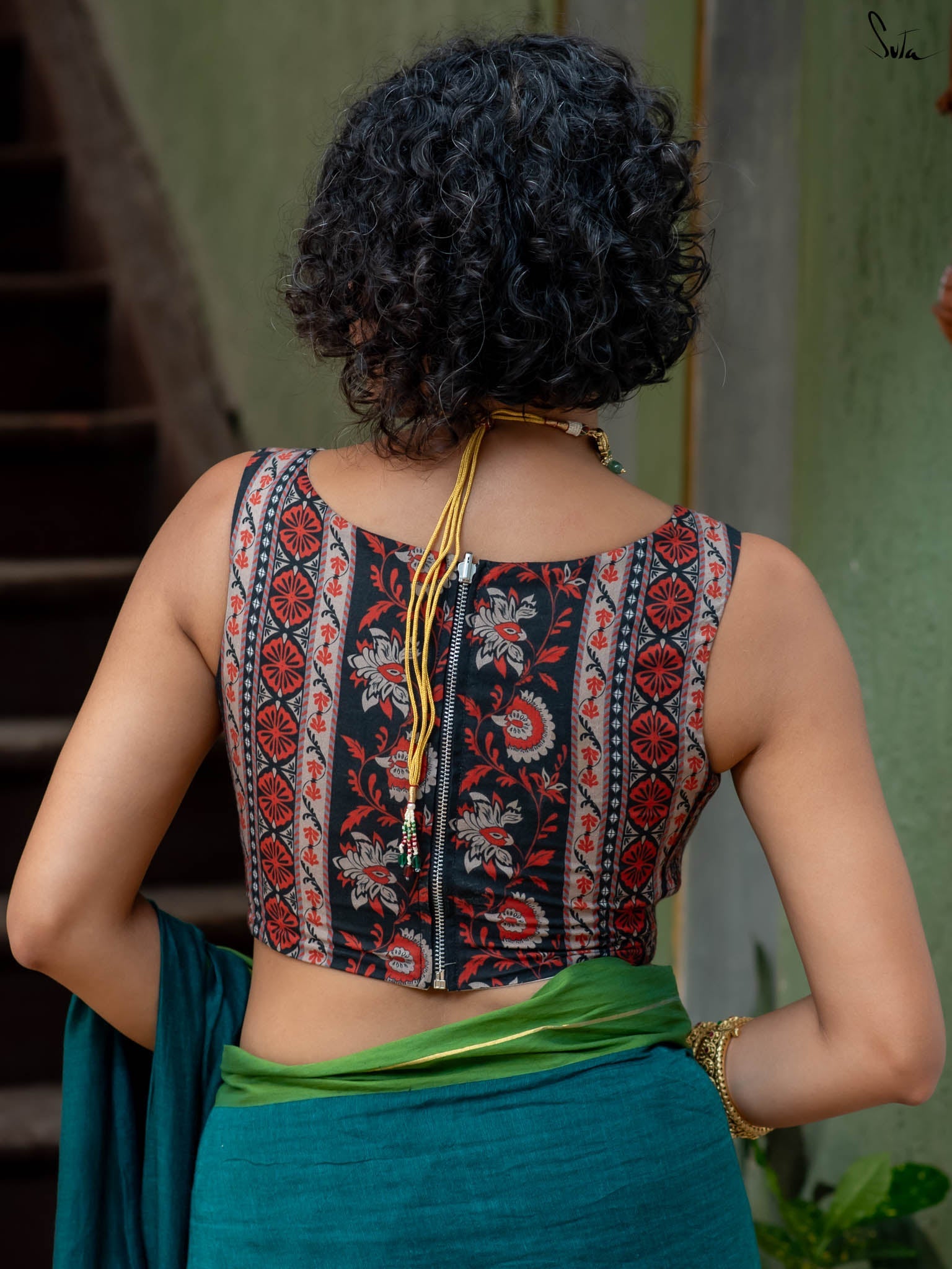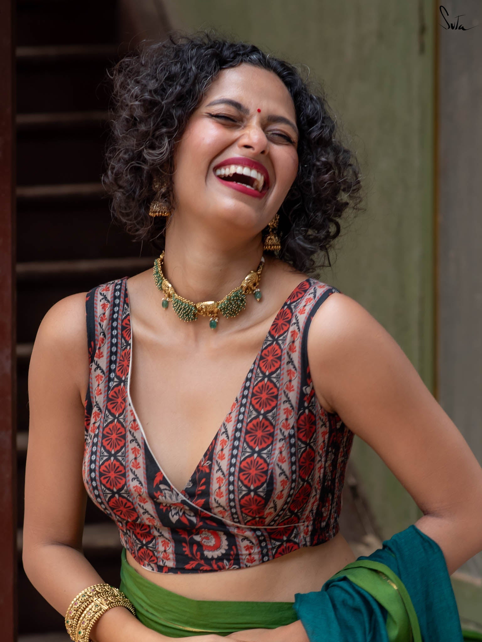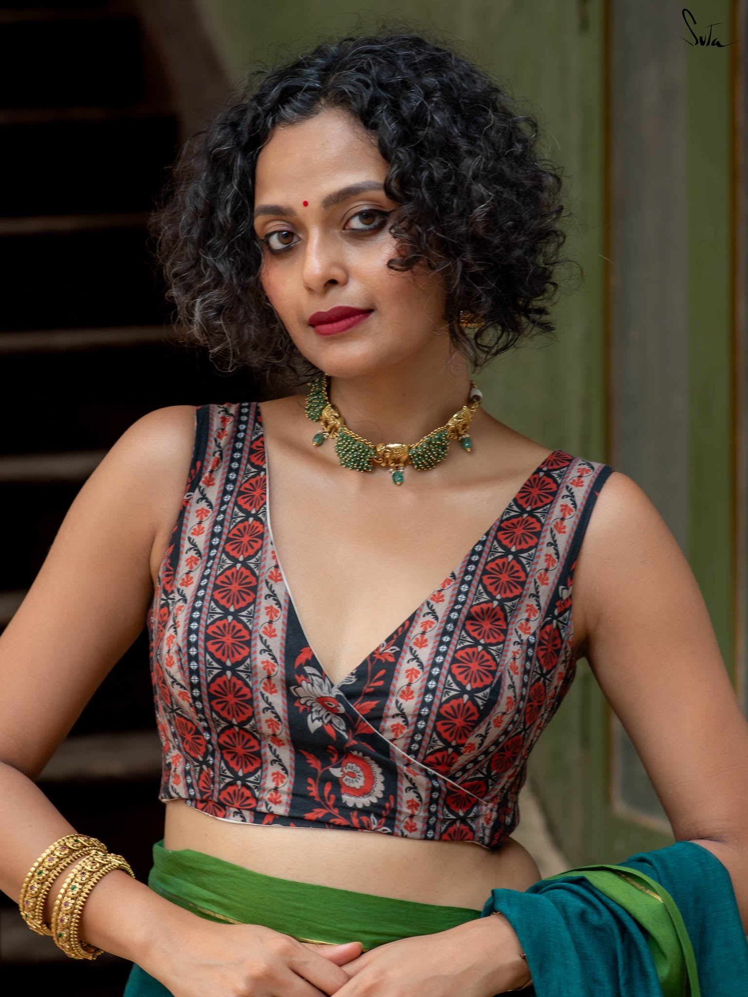 Comfort and style blend together in black and white. Alat Palat Malai is a sleeveless cotton blouse with a comfortable elastic fit. The V-neck front adds a modern edge. Great for layering or styling as a statement piece