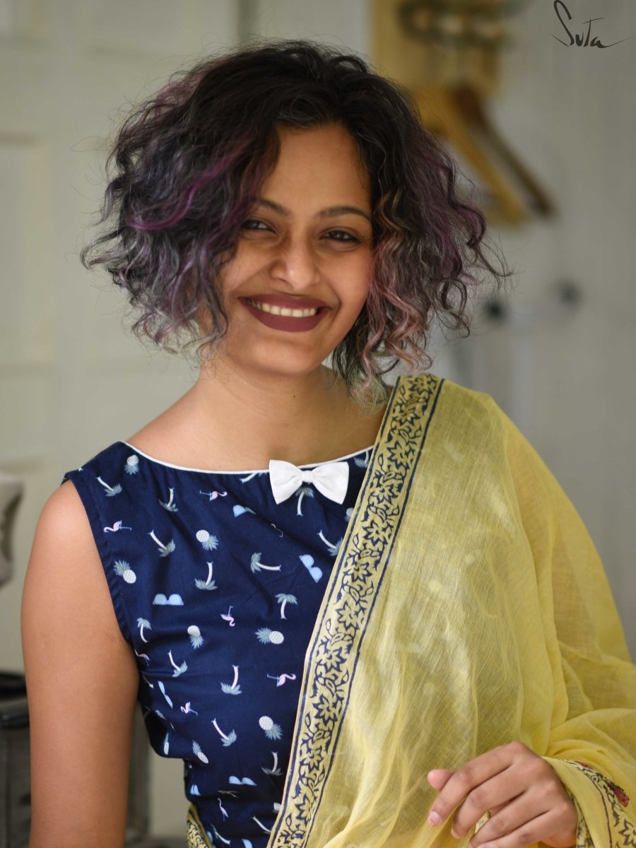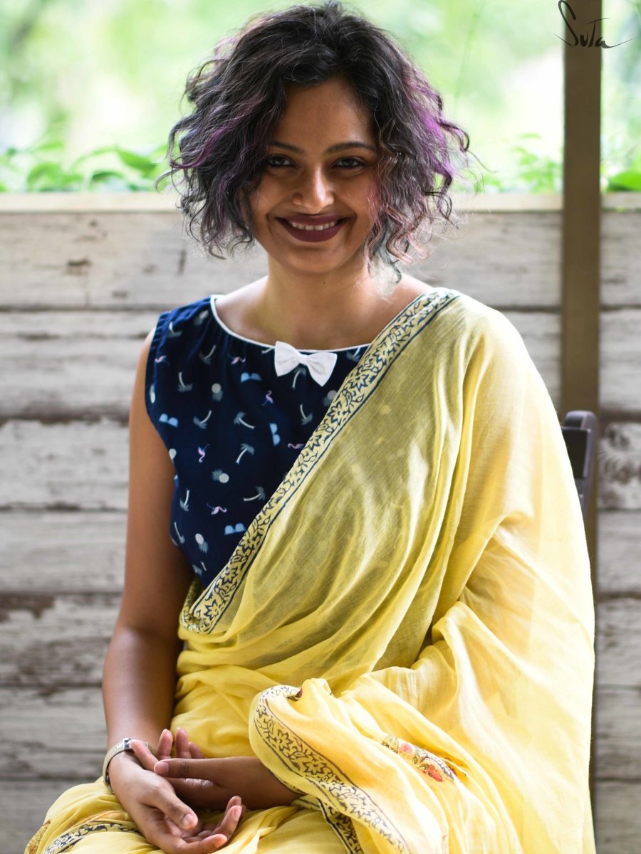 Su, the model is wearing size S blouse and saree link is : https://suta.in/collections/made-in-heaven-mul-cotton/products/rosa