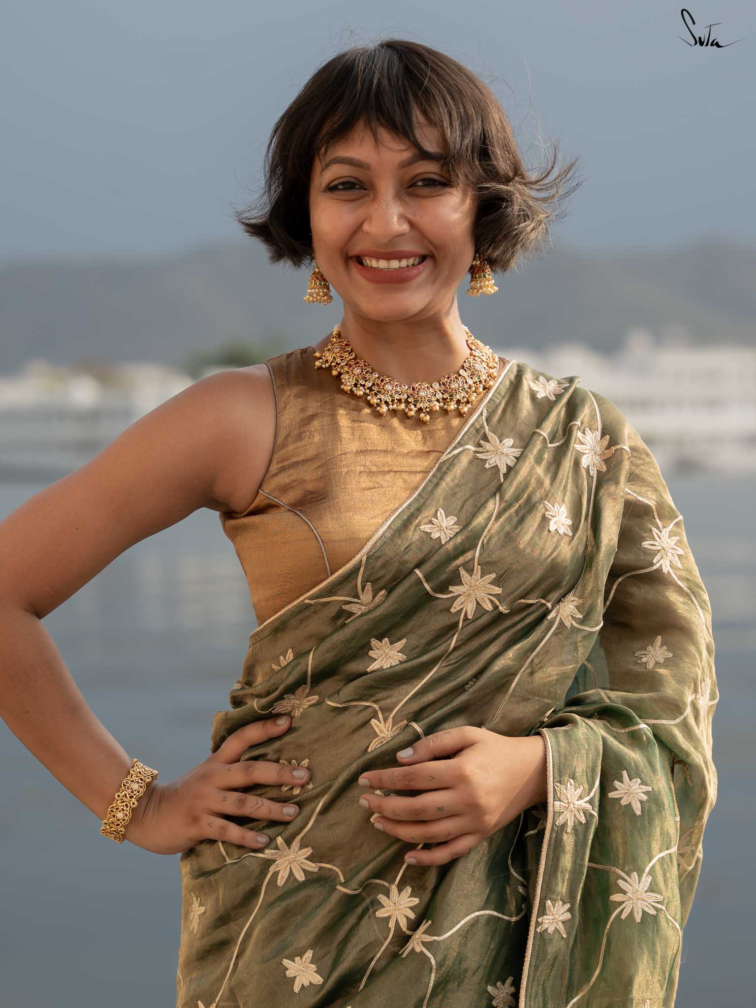 Every star needs the right canvas to shine, just like Amini needs you. This sleeveless gold blouse from Suta’s Taara collection is crafted from rich cotton silk chanderi blending excitement and modern style. The back hook-hole adds a contemporary edge, while the silver piping along the neck, armholes, and hem subtly complements your saree. Let your inner brilliance shine through with this Amini Blouse.