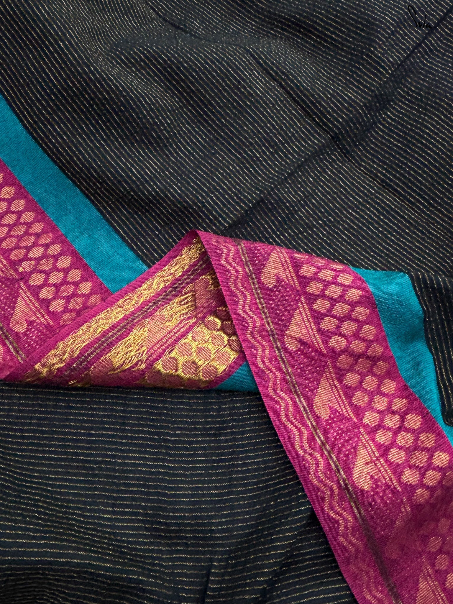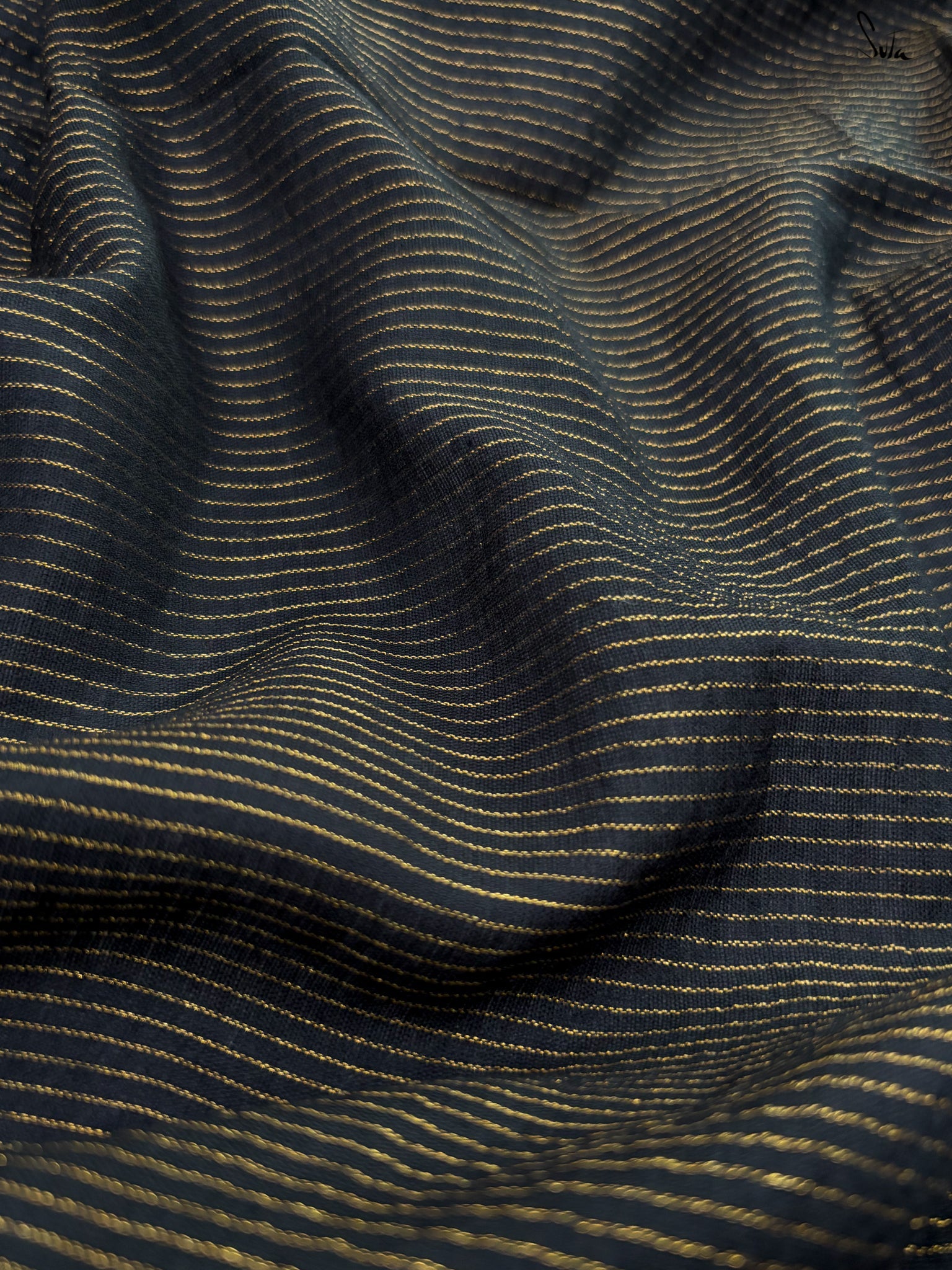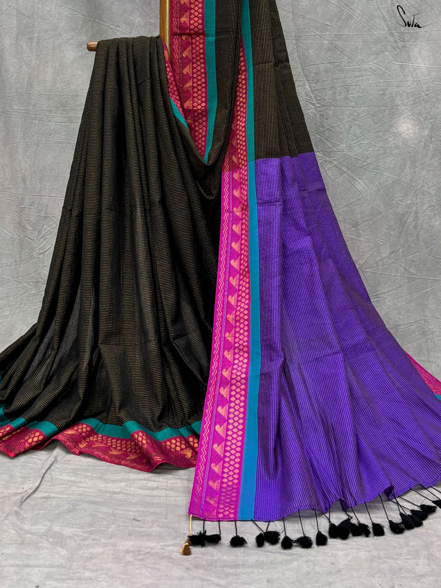 The exquisite 'Andheri Raat' saree is crafted from rich acrylic cotton with zari and features a contrasting pallu that playfully complements the black base. A contrasting thick zari border adds an extra layer of charm to this beautiful ensemble. Pair it with Suta's 'Surabhi' blouse and experience the colorful magic behold!