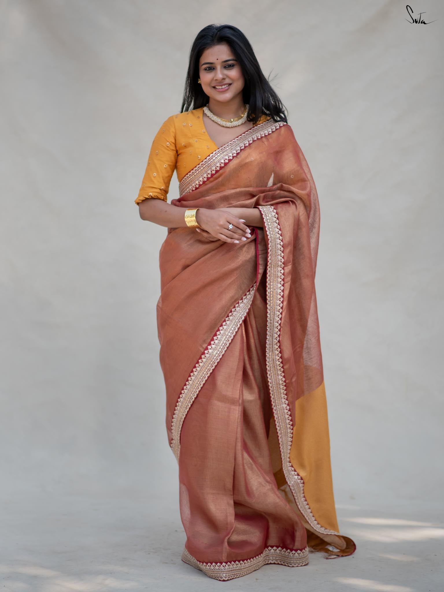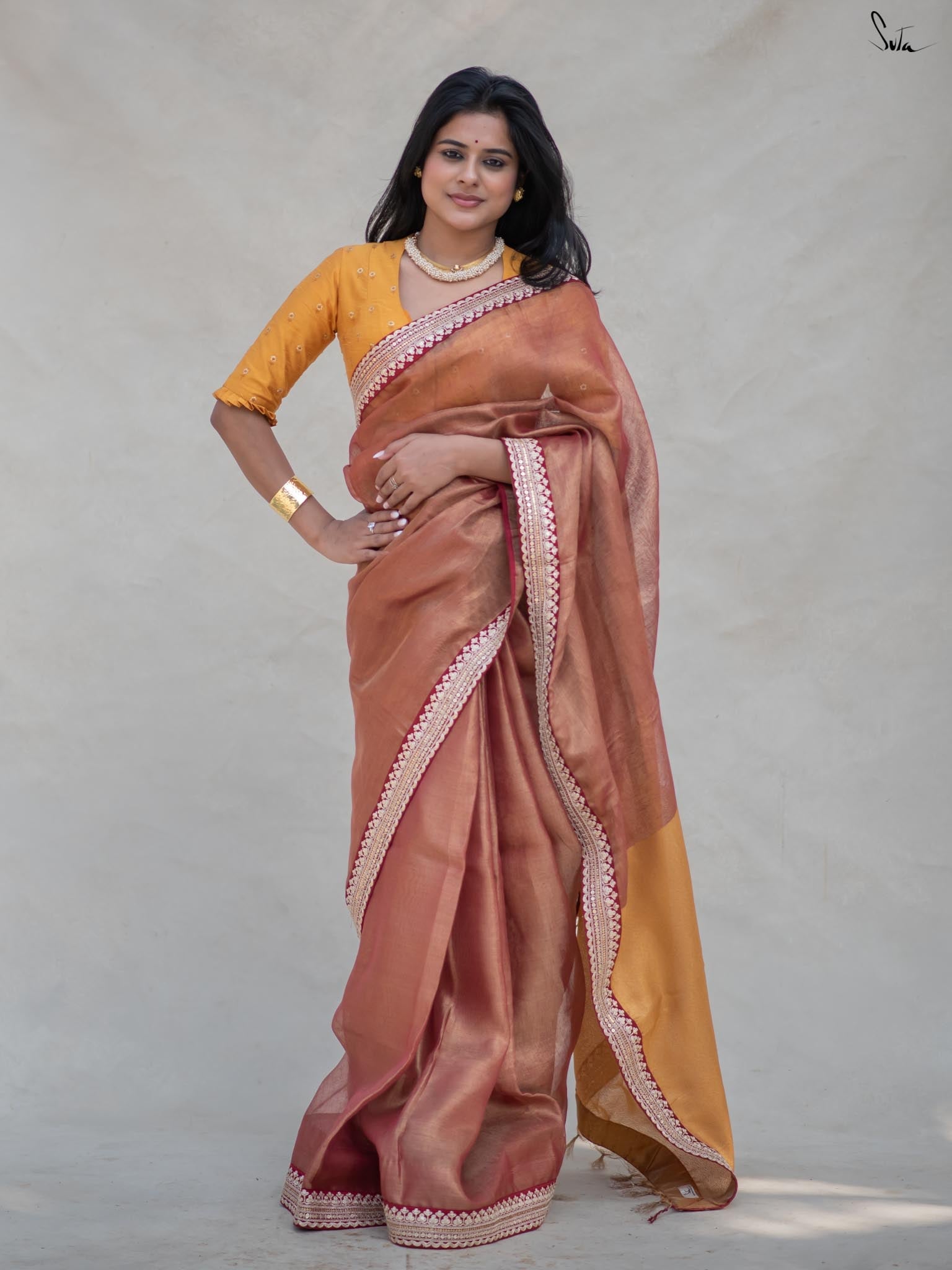 Step into the magic of Aurora Ascension, a saree that embodies the first light of dawn. Crafted from lightweight Linen Zari, this stunning piece features an embroidered border that adds a touch of glamour. Paired with a matching blouse piece, it’s the perfect ensemble to elevate your style. Let Aurora Ascension light up your soul and surroundings with its radiant beauty.