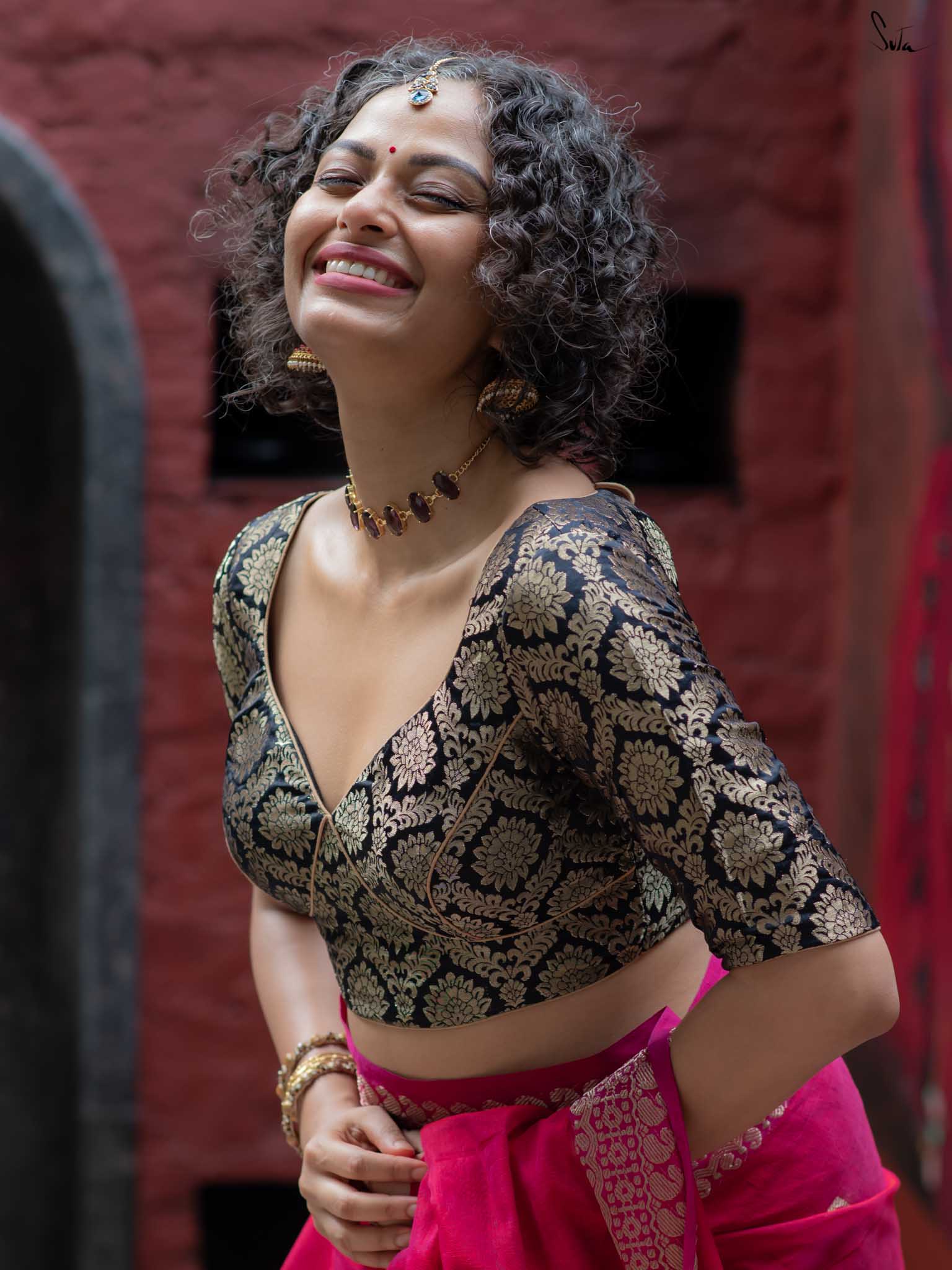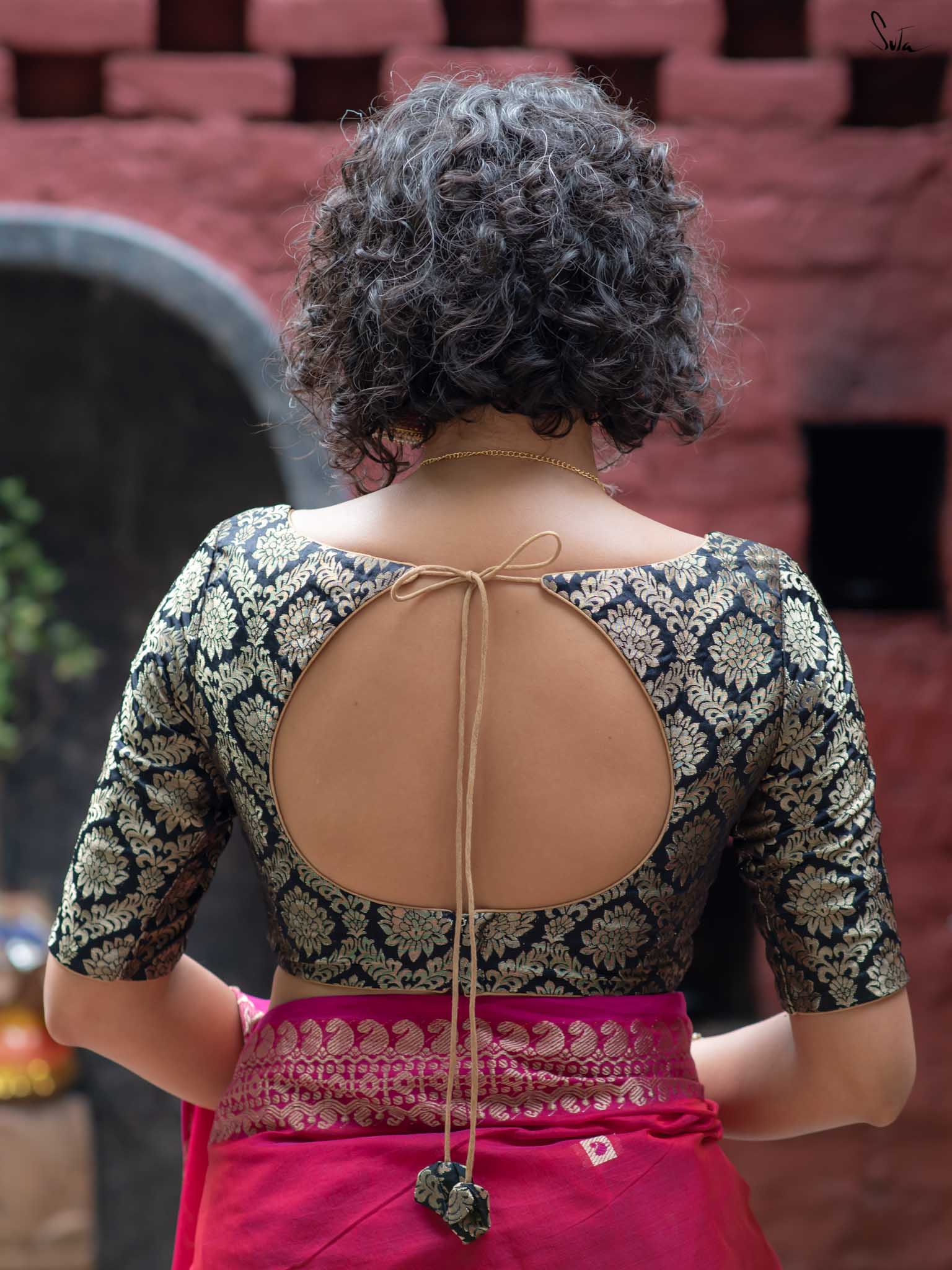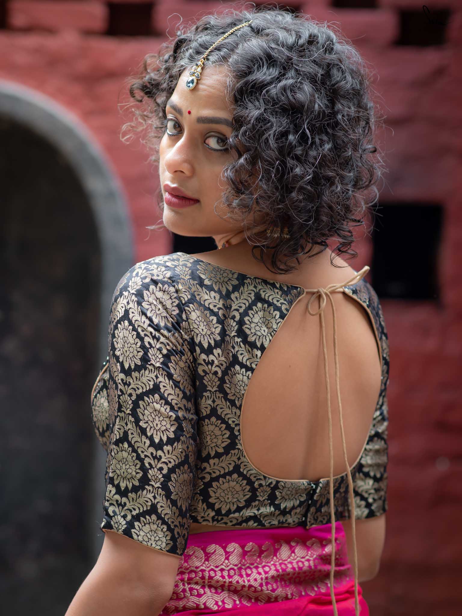 Black brocade blouse woven with rich, raised patterns. Luxurious fabric features intricate jacquard designs that catch light. Structured fit that sharpens your silhouette with style.