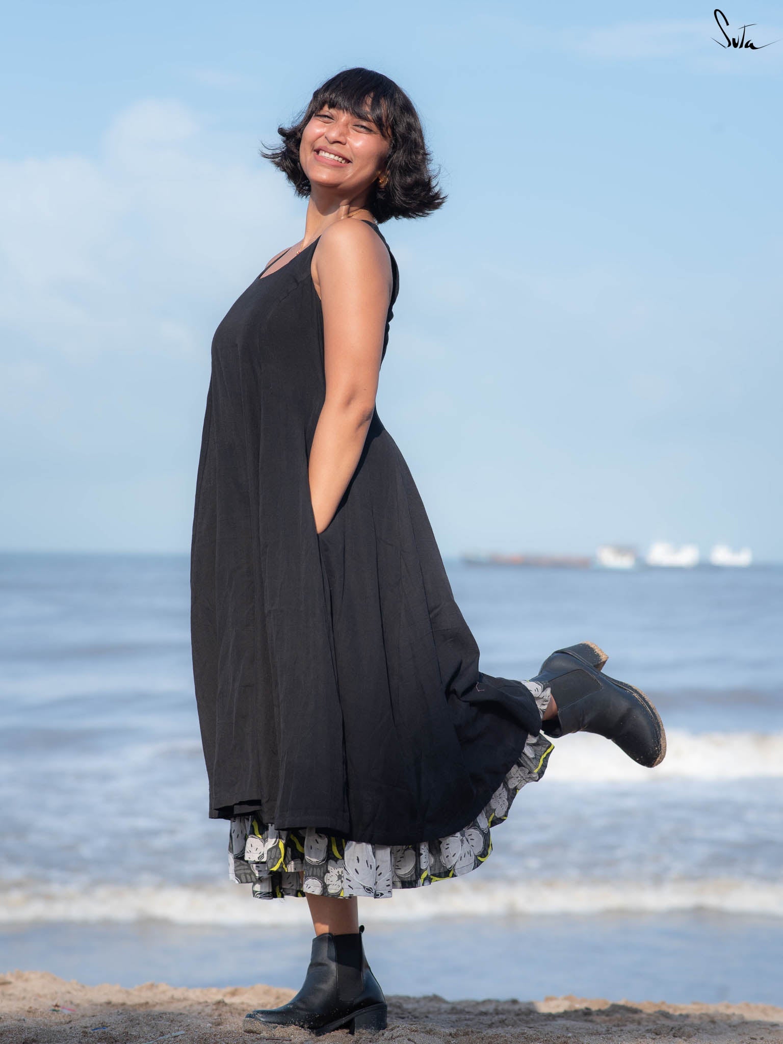 A blend of solid panels and floral print, this dress channels a carefree spirit rooted in balance. The digital artwork adds bursts of color without overwhelming, while soft frills at the hem bring gentle movement.