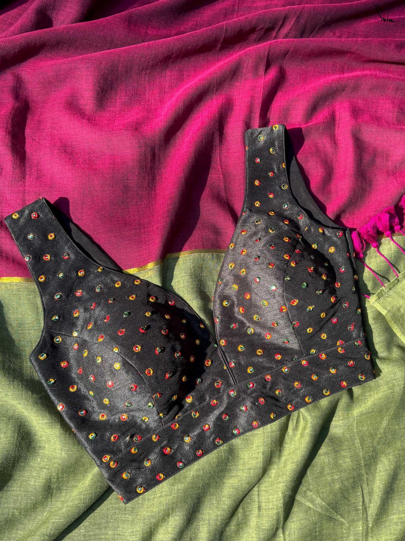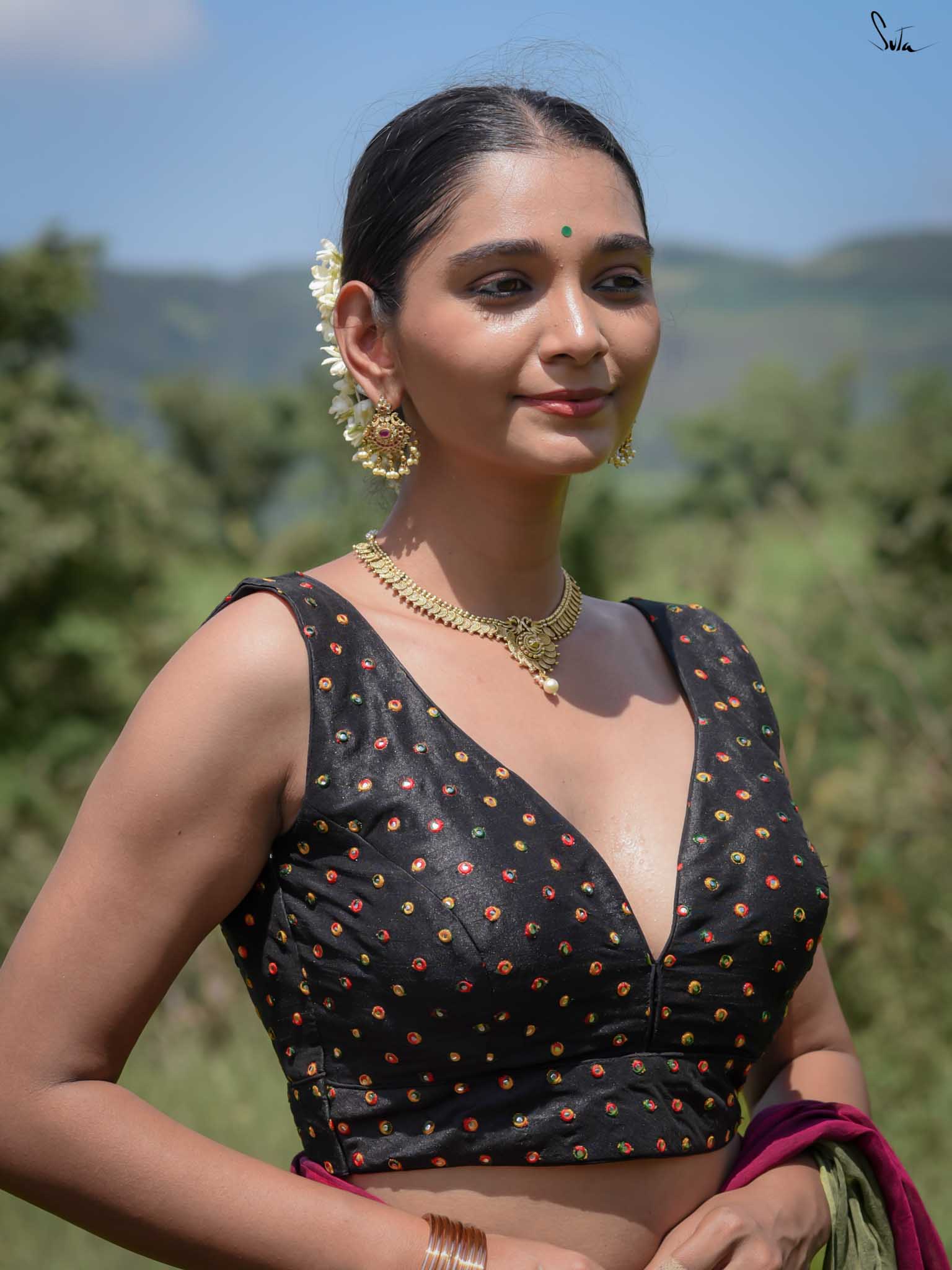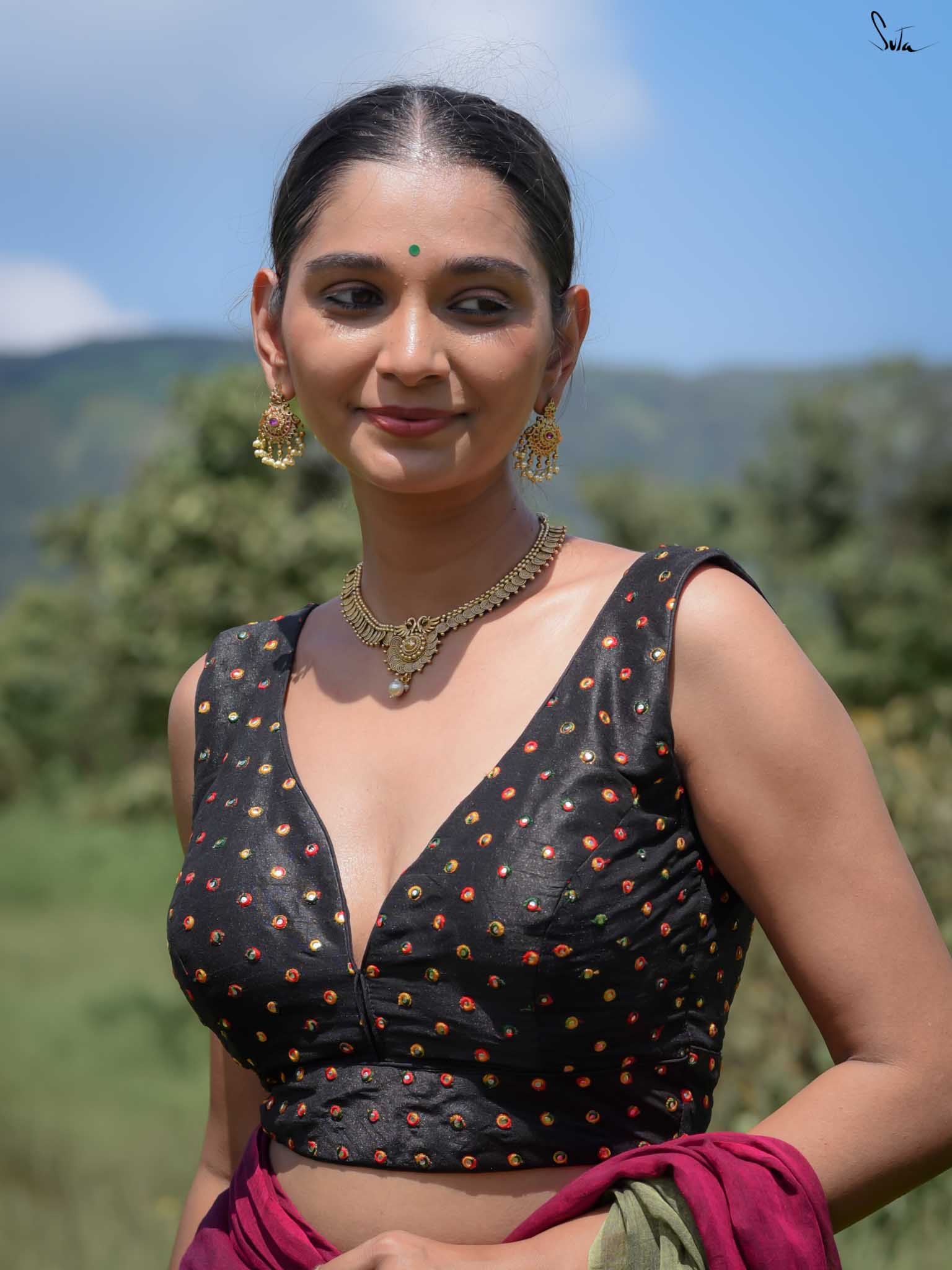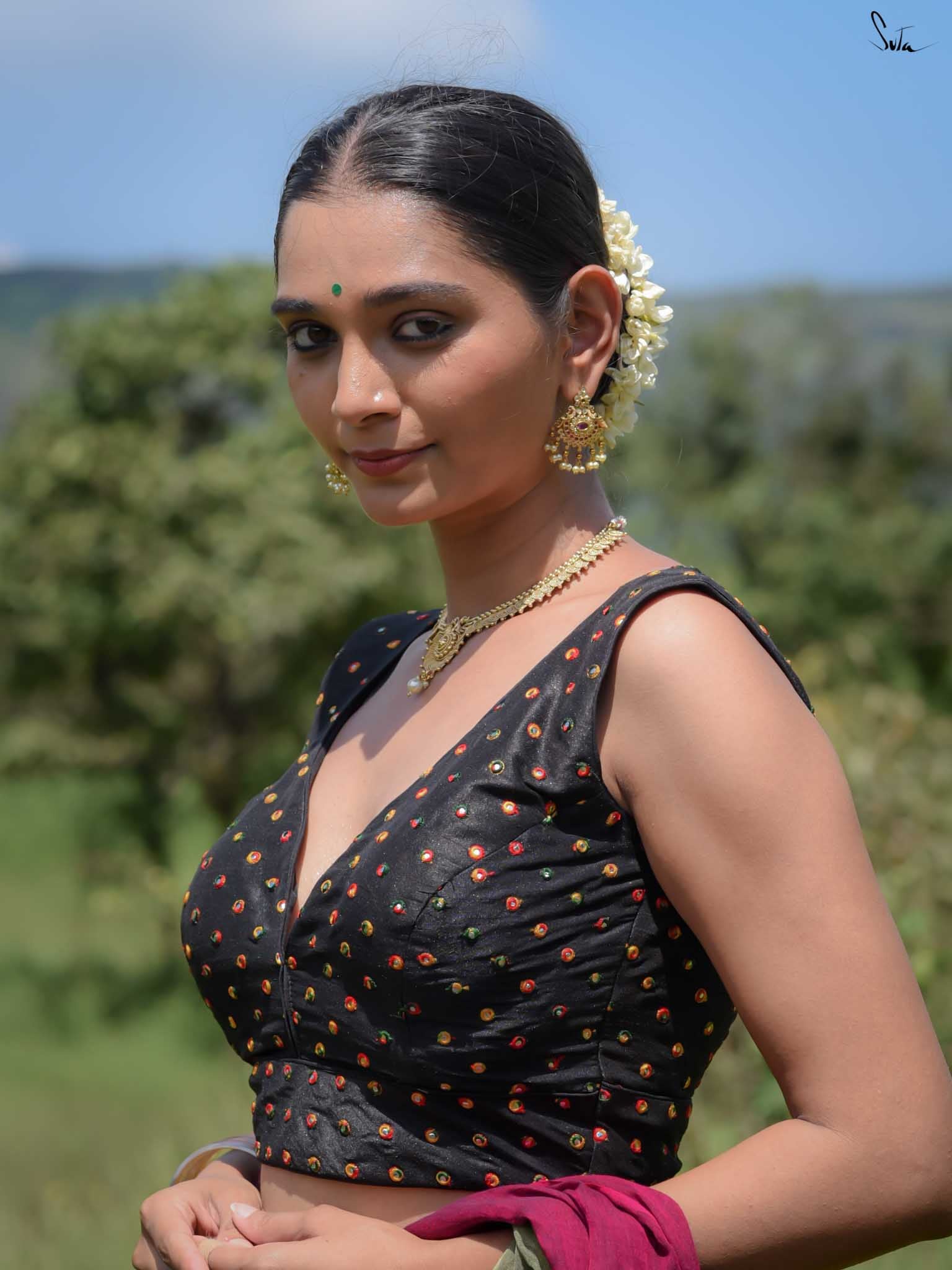 Chic, elegant, and effortlessly festive, the Carbon Gold is a striking addition to your saree wardrobe. Crafted with intricate machine embroidery in playful polka motifs, this sleeveless blouse features a sophisticated dome neckline and a back-open hook closure for a comfortable, flattering fit. Perfect for pairing with festive, wedding, or evening sarees, it brings a touch of glamour and modern charm to any celebration.