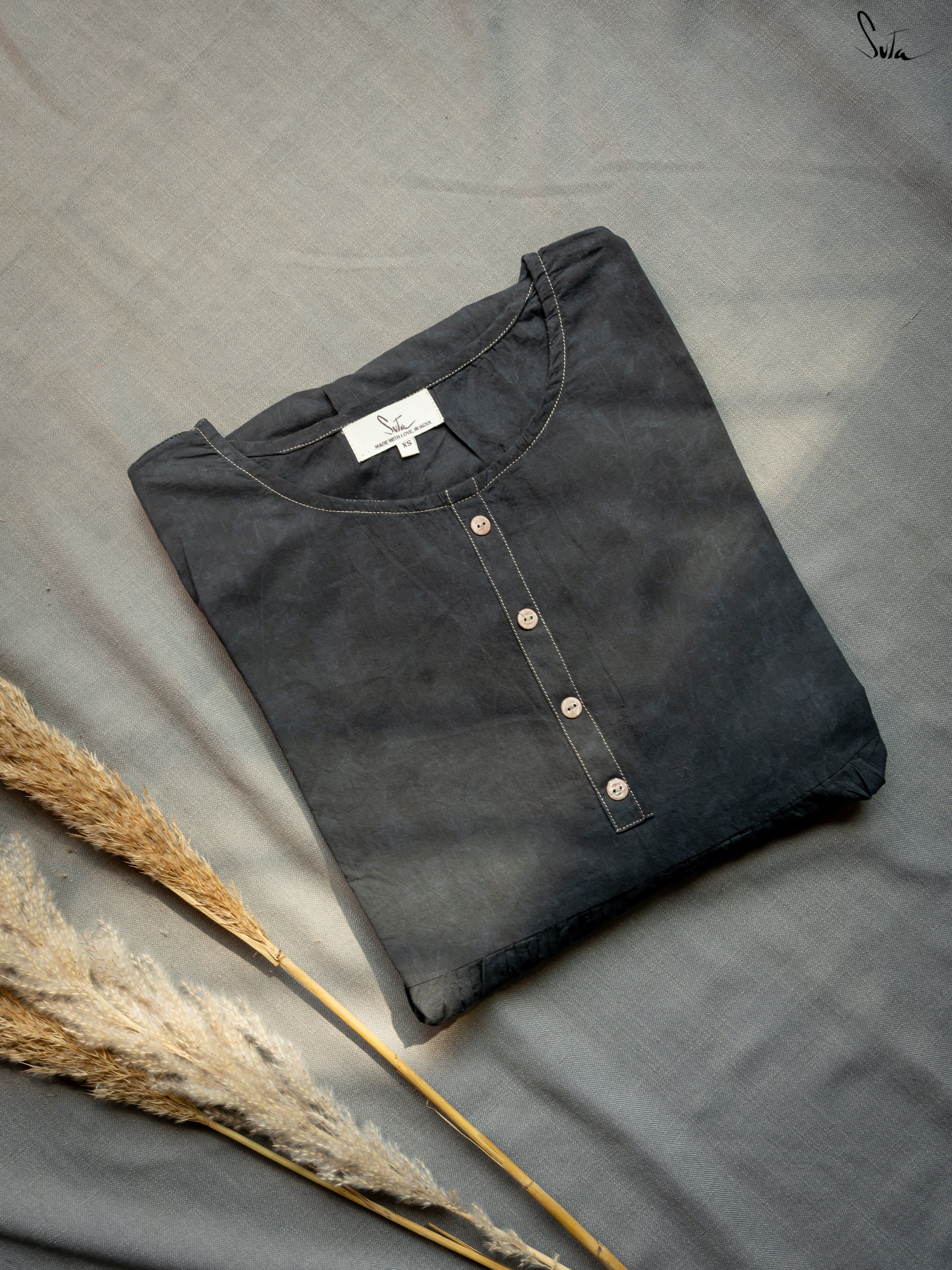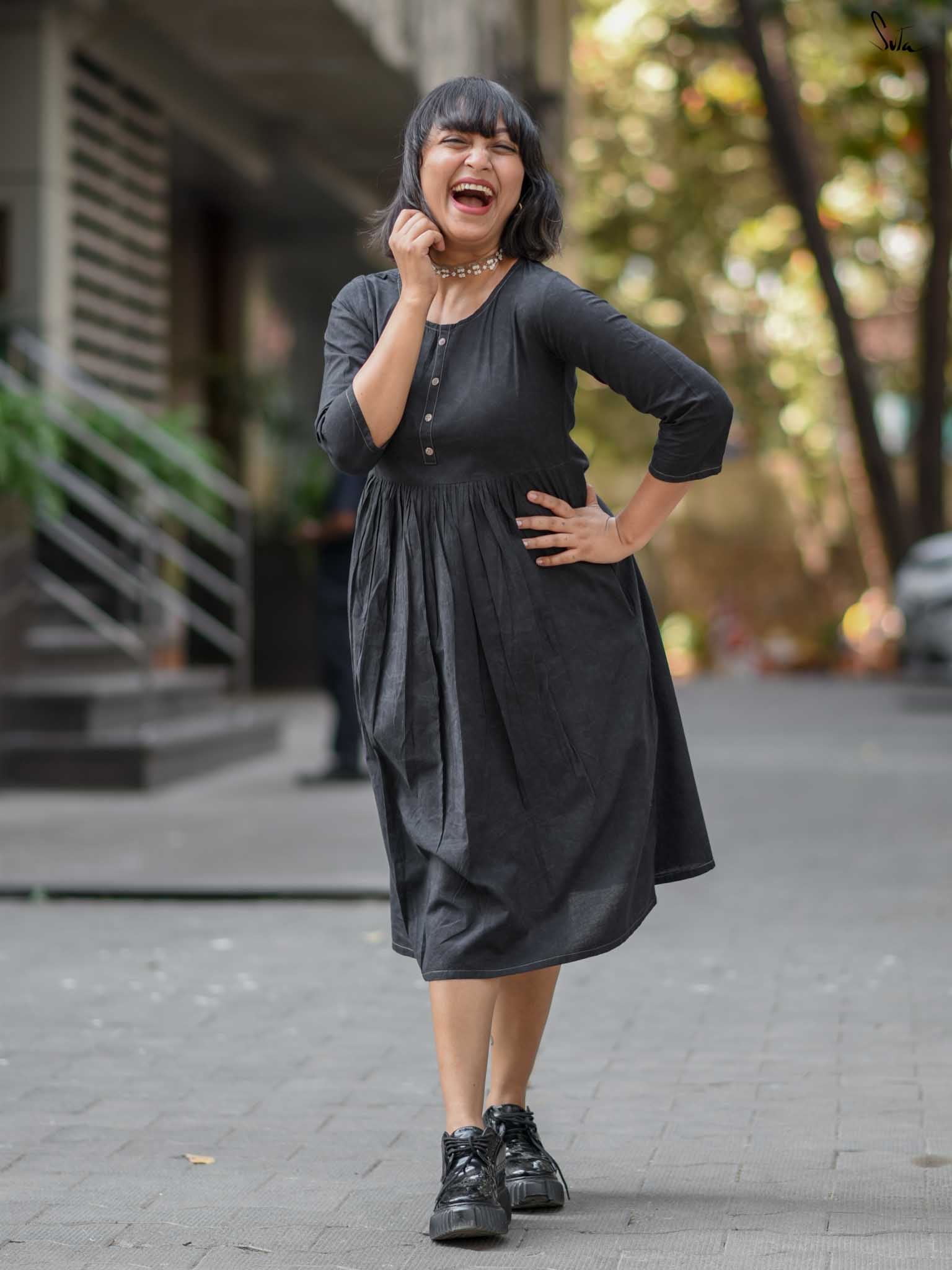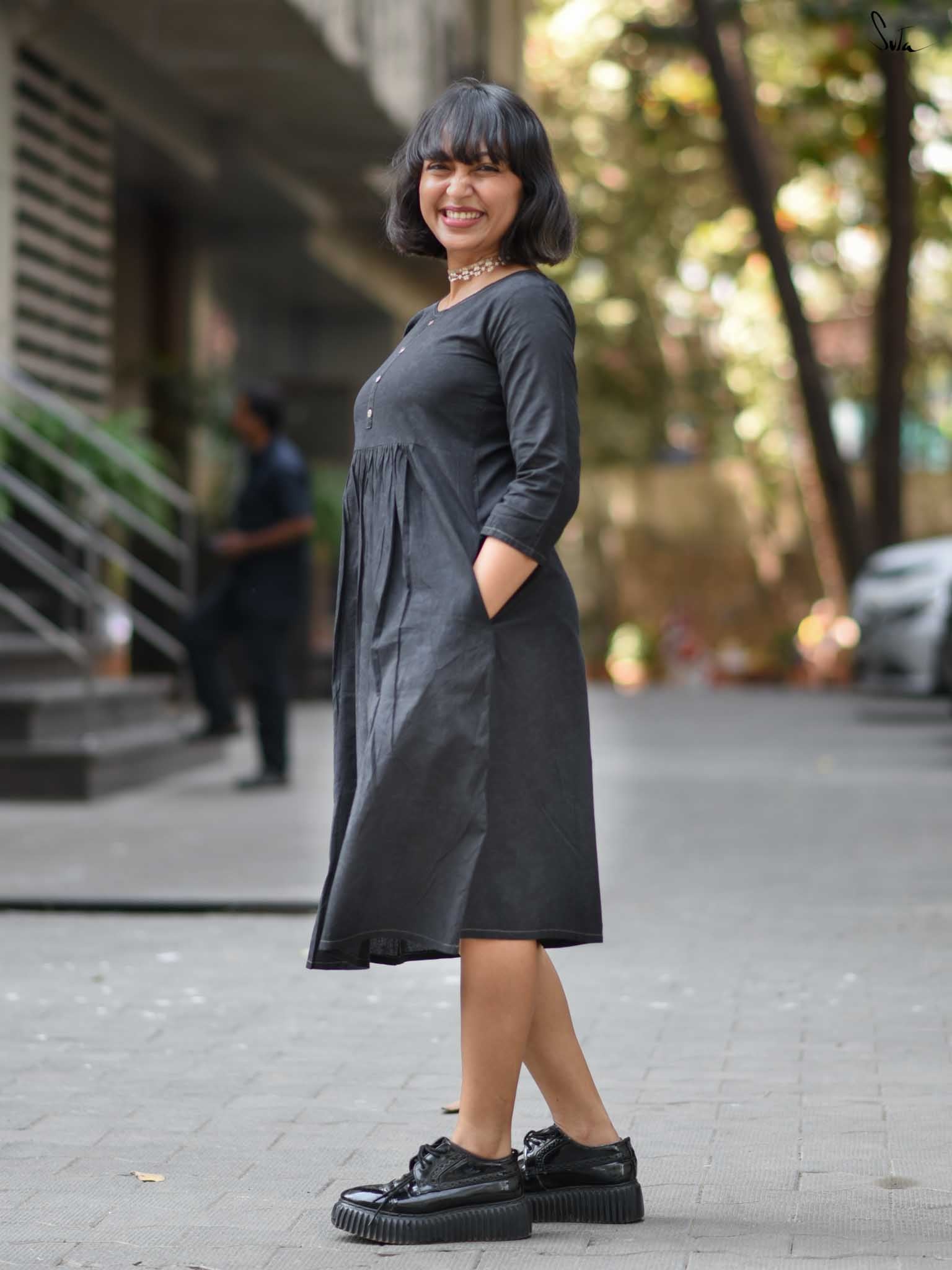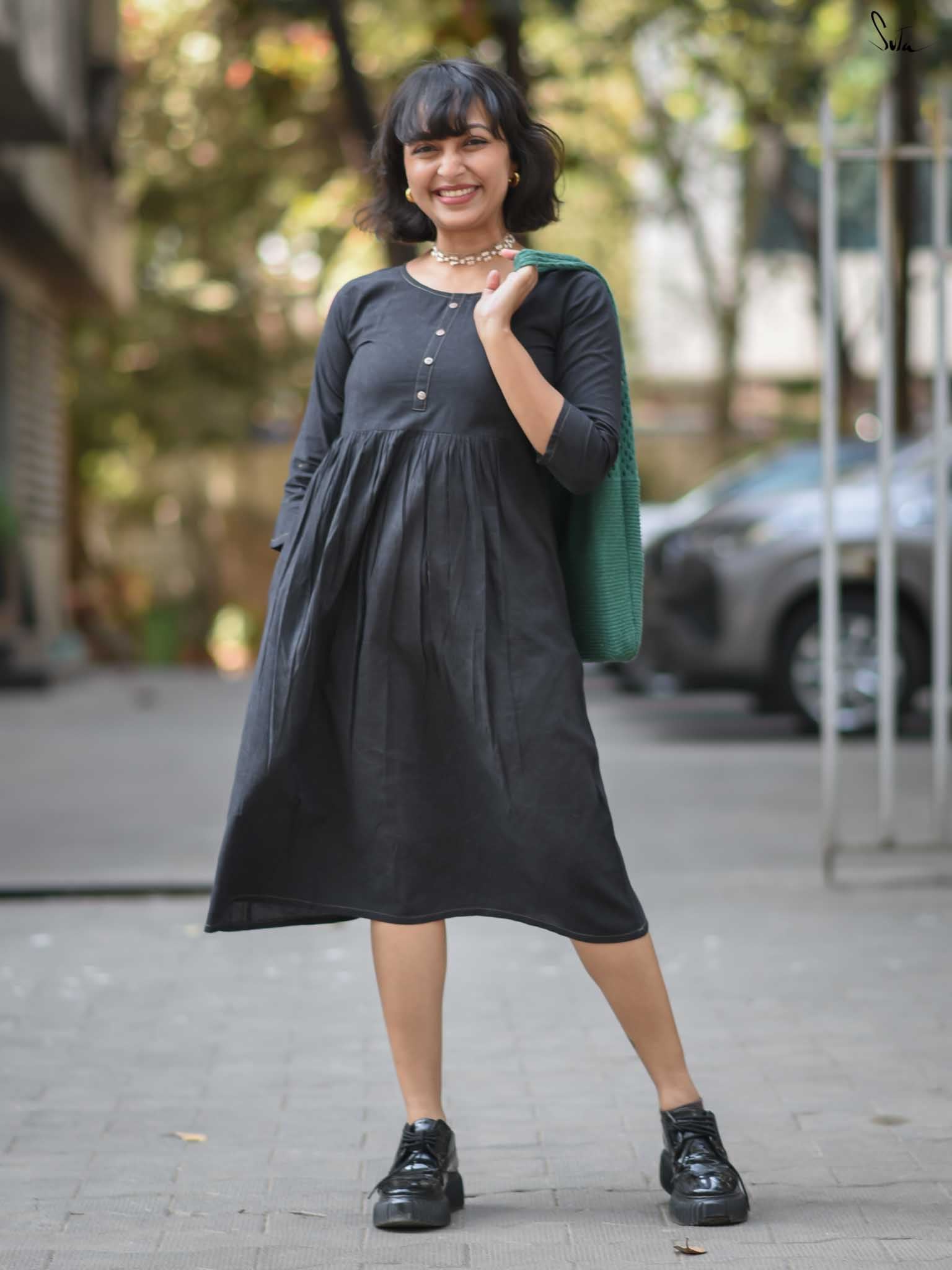Slip into comfortable elegance and make every day a breeze with Electrical Eclipse. The sleek black dress is curated from soft, breathable cotton and features a stylish U-neckline. Elbow length sleeves and two sleek side pockets infuses the ensemble with added ease, making it perfect for a night out in the town. Take on the world with a lot of swagger, wrapped in the warm, soothing hug of Electric Eclipse.