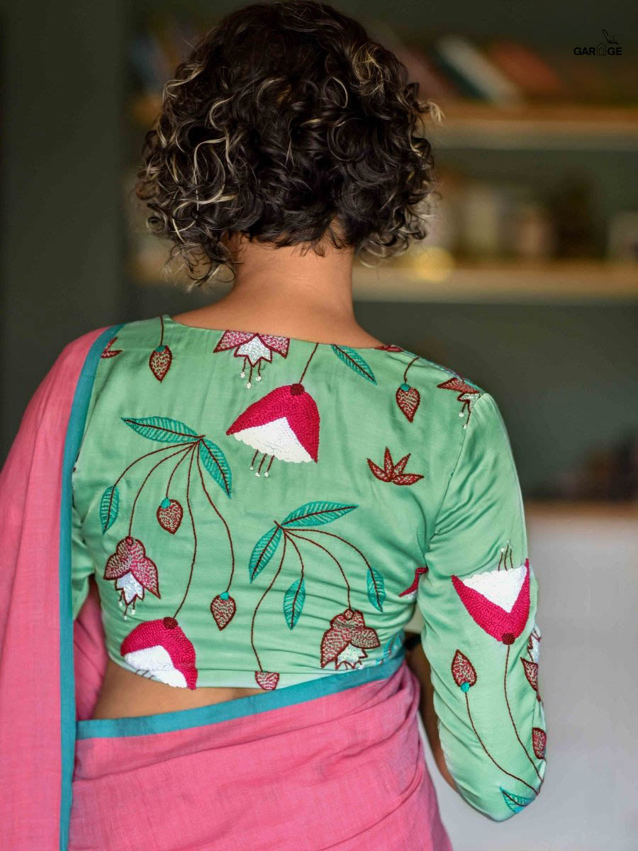 Su, the model is wearing size S blouse and the saree link is Infused Berry Waters