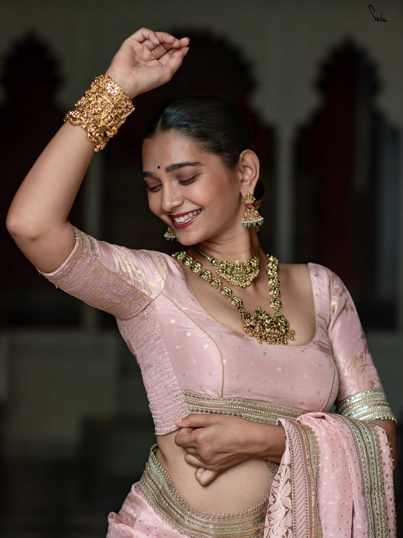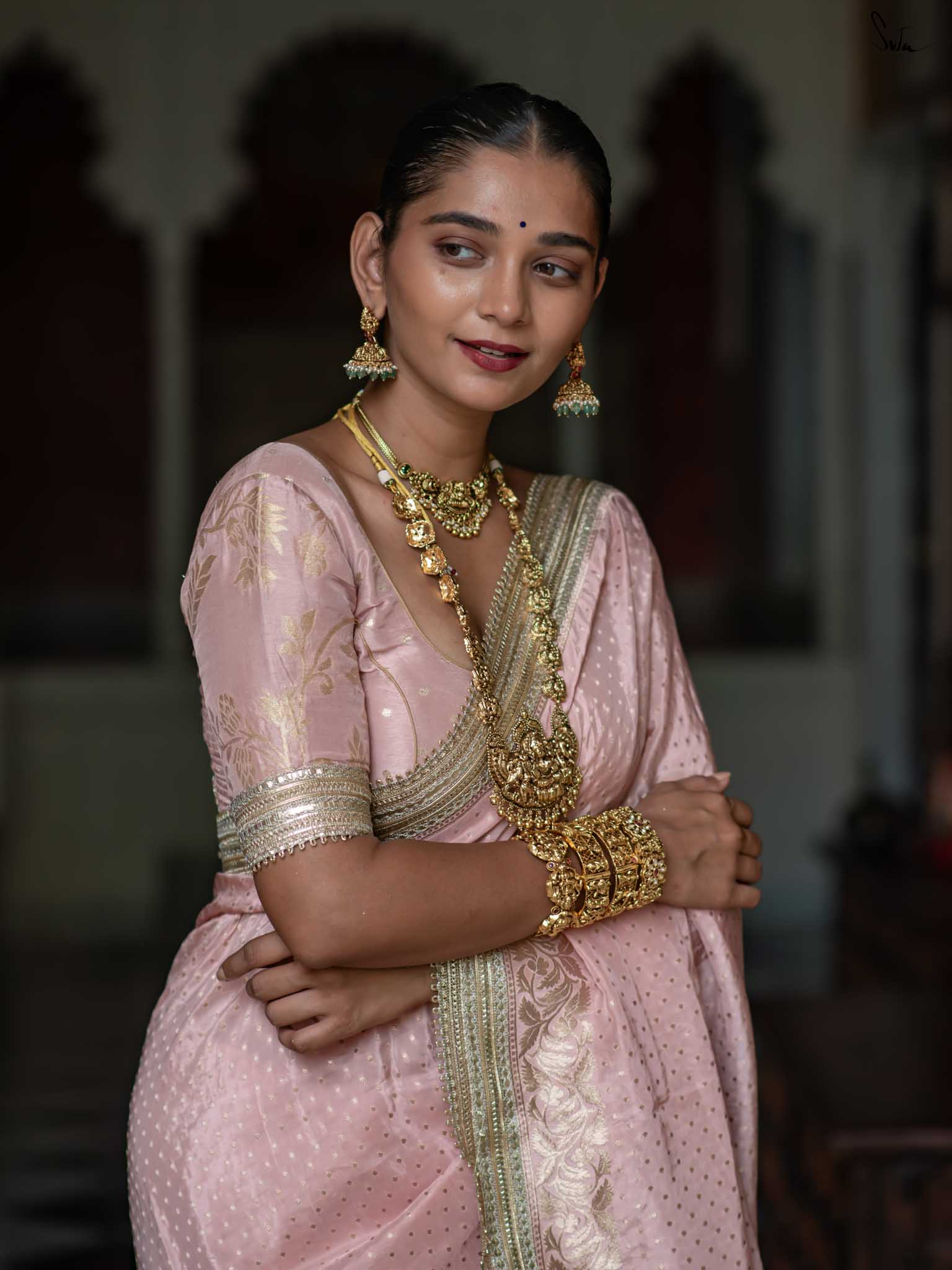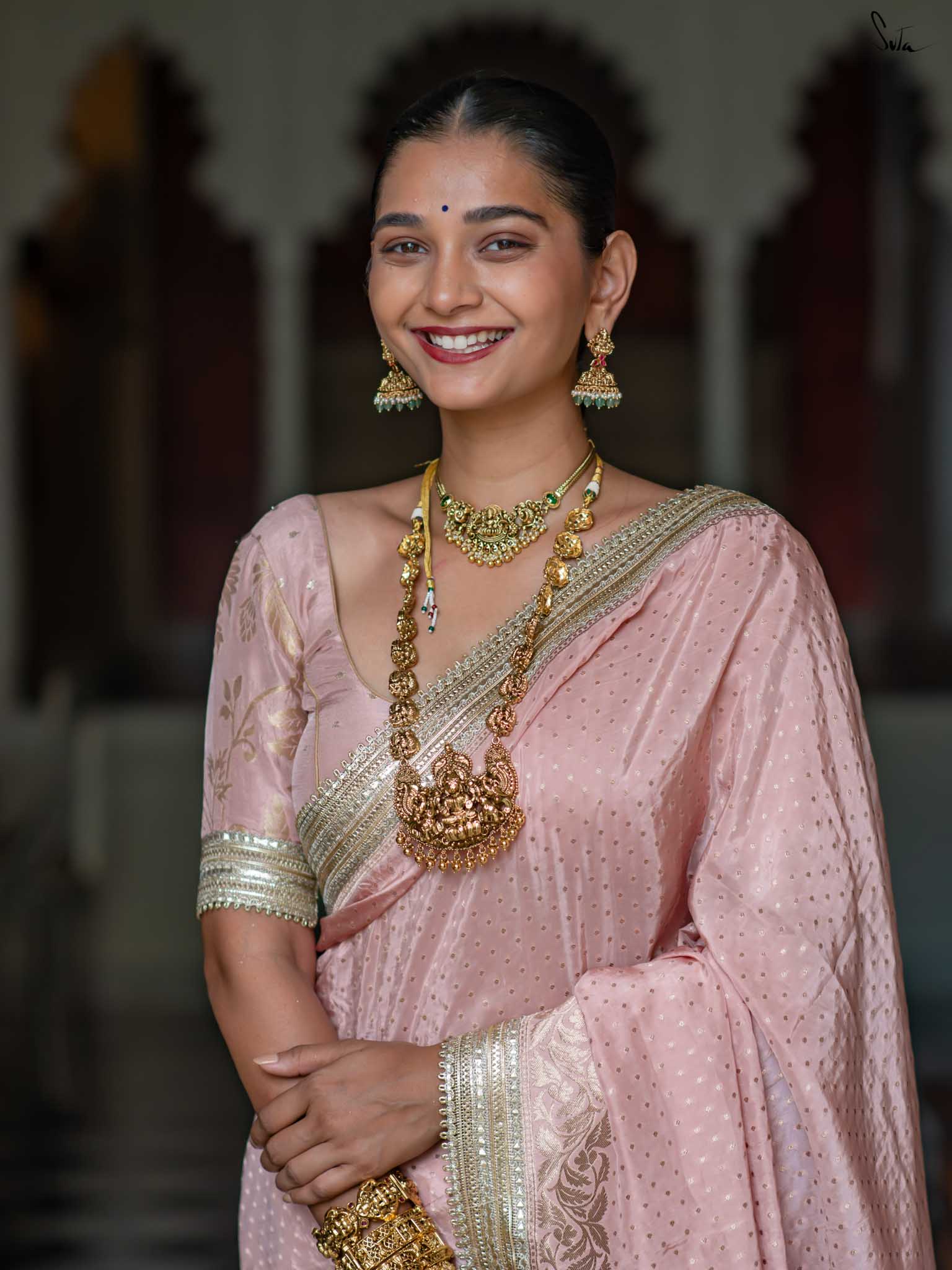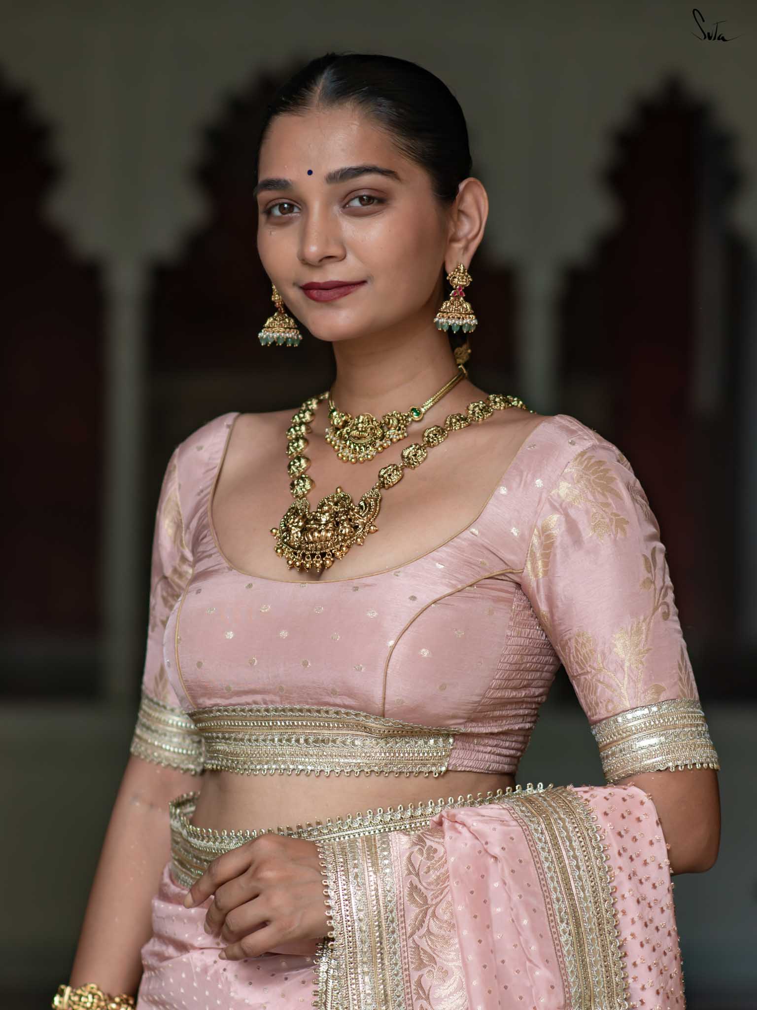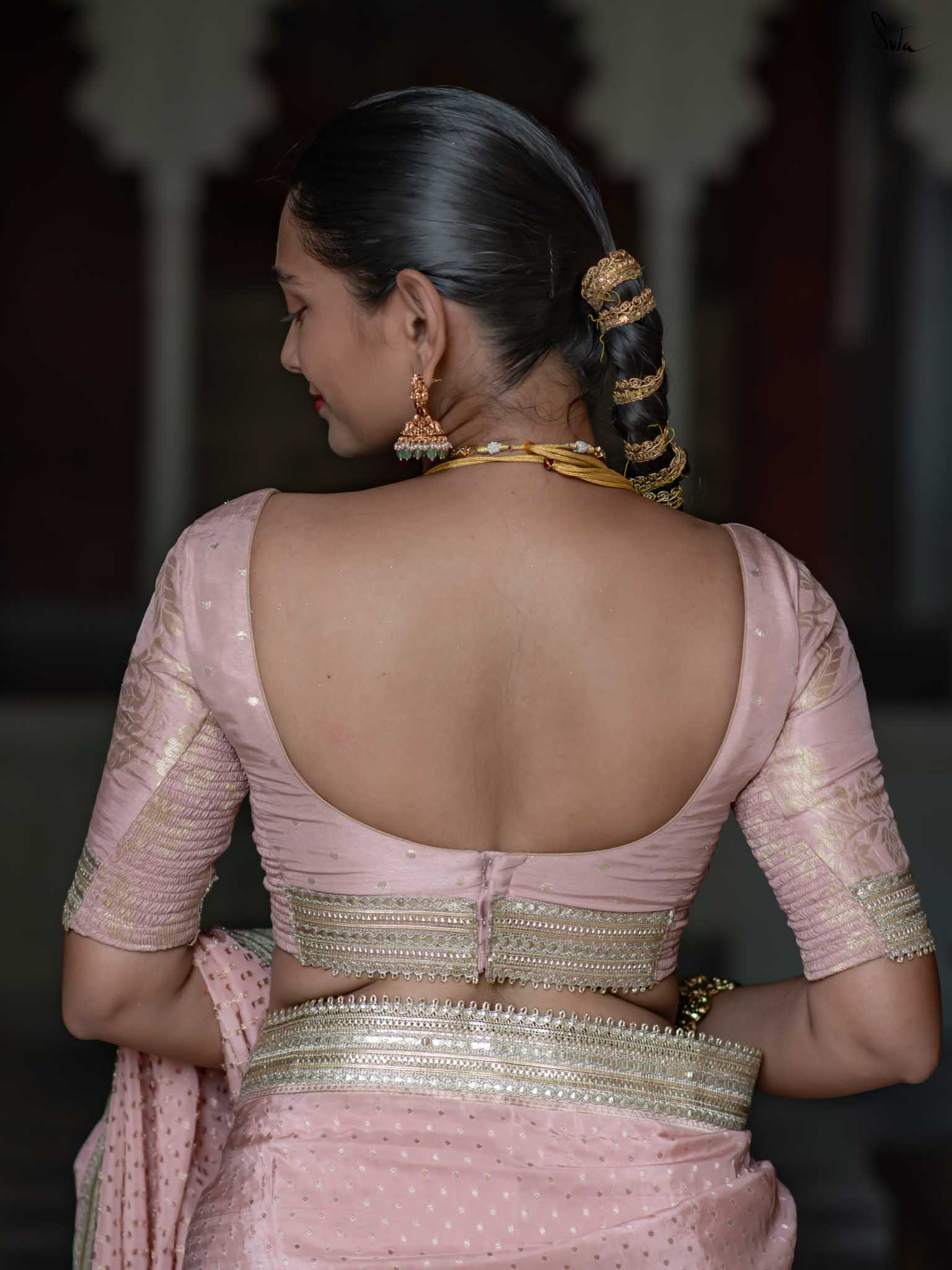 The model is wearing size S blouse and the saree is Sehra Hai