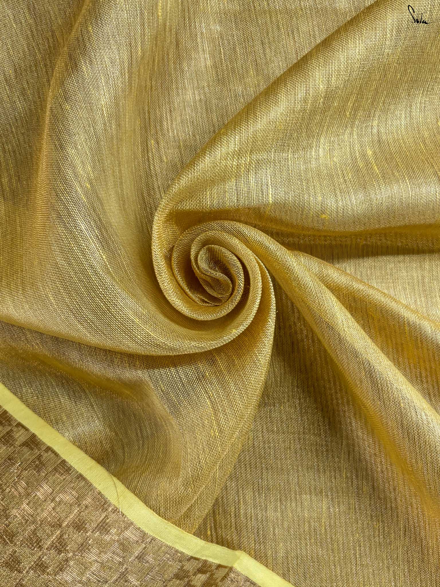 A yellow saree that feels like pure sunshine. The colour radiates warmth and optimism, lighting up every room you walk into. The geometric zari border adds structure and shimmer, keeping the look festive yet refined. Perfect for weddings and joyful celebrations. Comes with a matching blouse piece, no fall.