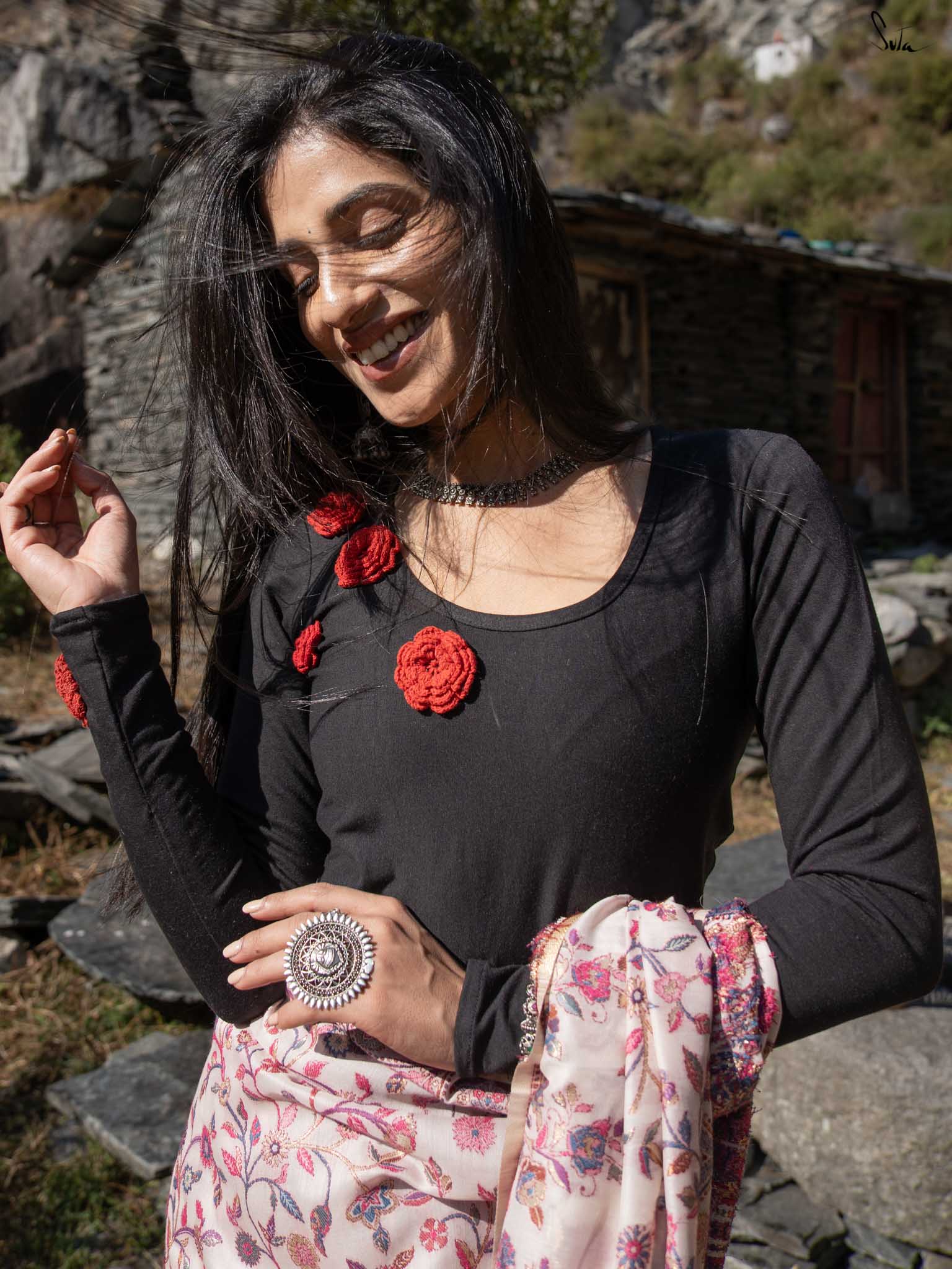 The round neckline and full sleeves give it timeless grace, while delicate crochet flower embellishments on the neck and cuffs add a handcrafted touch of beauty. Elegant yet effortless, it pairs seamlessly with sarees, skirts, or even trousers, your go-to for style that feels like second skin.