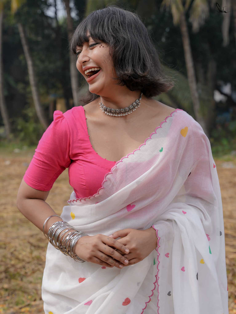 This saree is a playful splash of colour, crafted in whisper-soft mul cotton that feels like second skin. The vibrant pink hue brings instant cheer, turning every moment into a bright, blooming one.