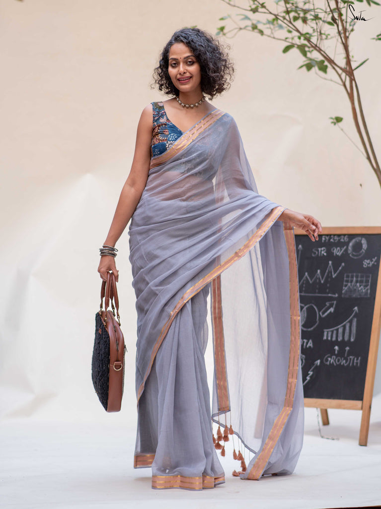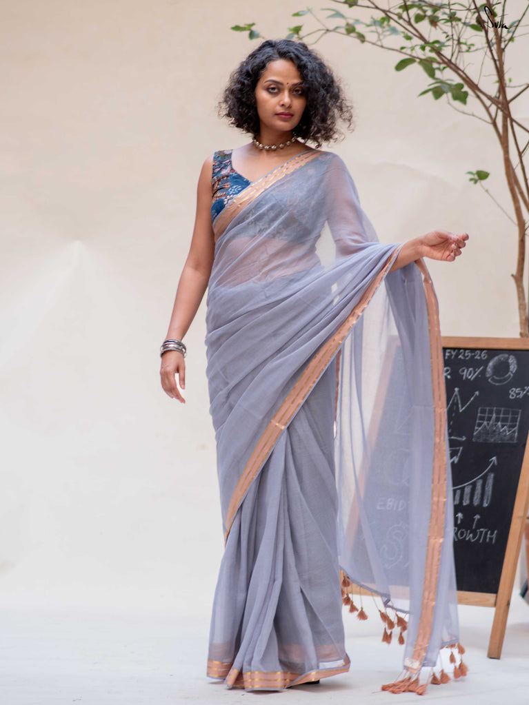 Calm, composed, and quietly elegant - Ash Phool is summer cotton at its most understated. Crafted in soft mul cotton, this bluish grey saree drapes lightly and feels feather-soft on the skin. A classic gold zari border adds a gentle shimmer, keeping the look timeless and refined.Perfect for long days, subtle dressing, and effortless repeats, Ash Phool is comfort with a touch of glow.