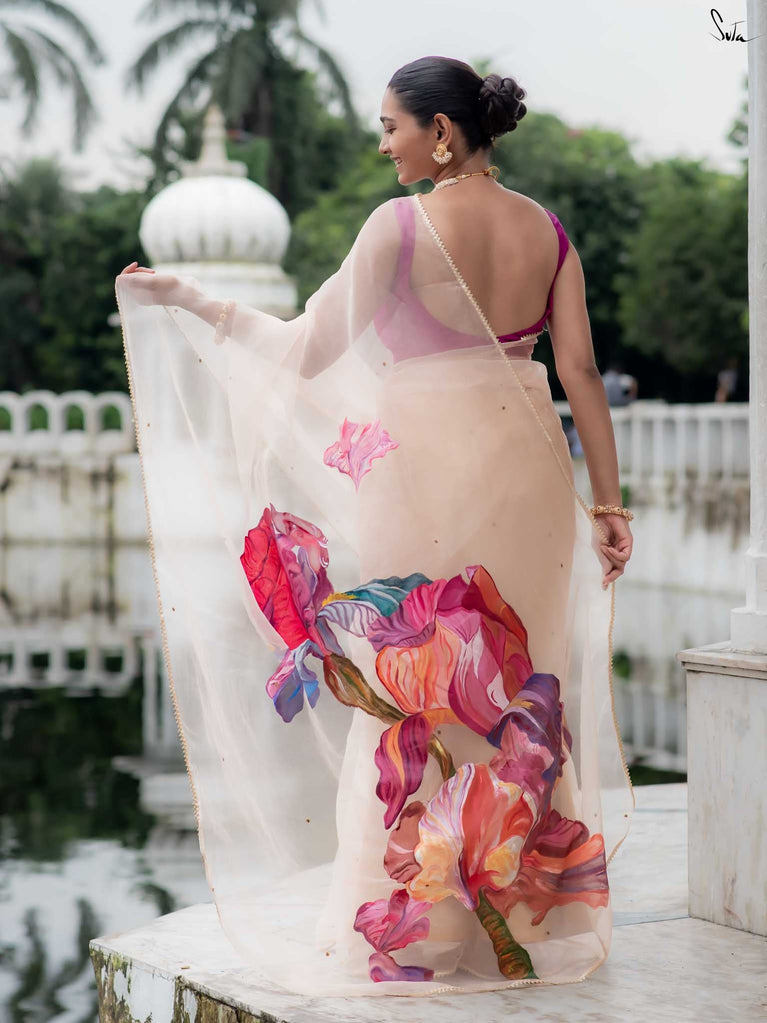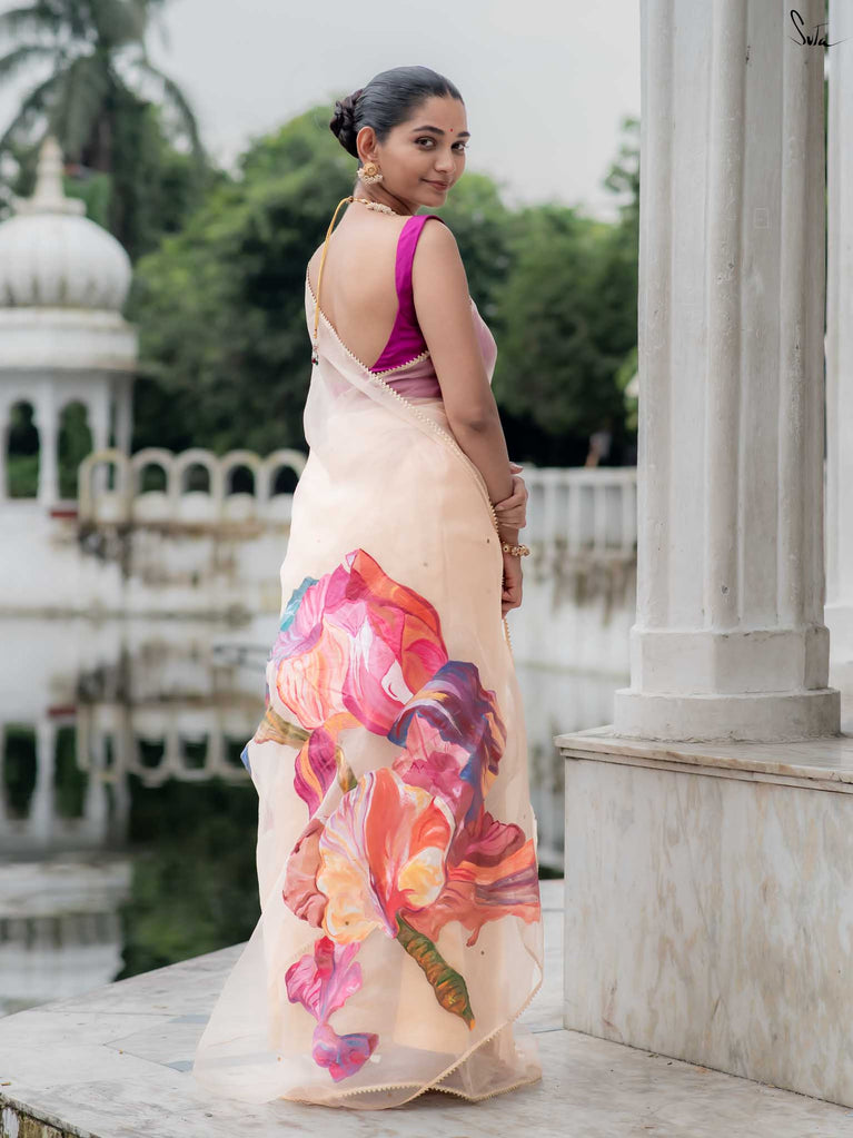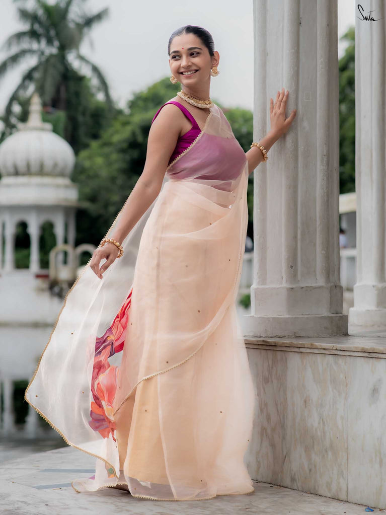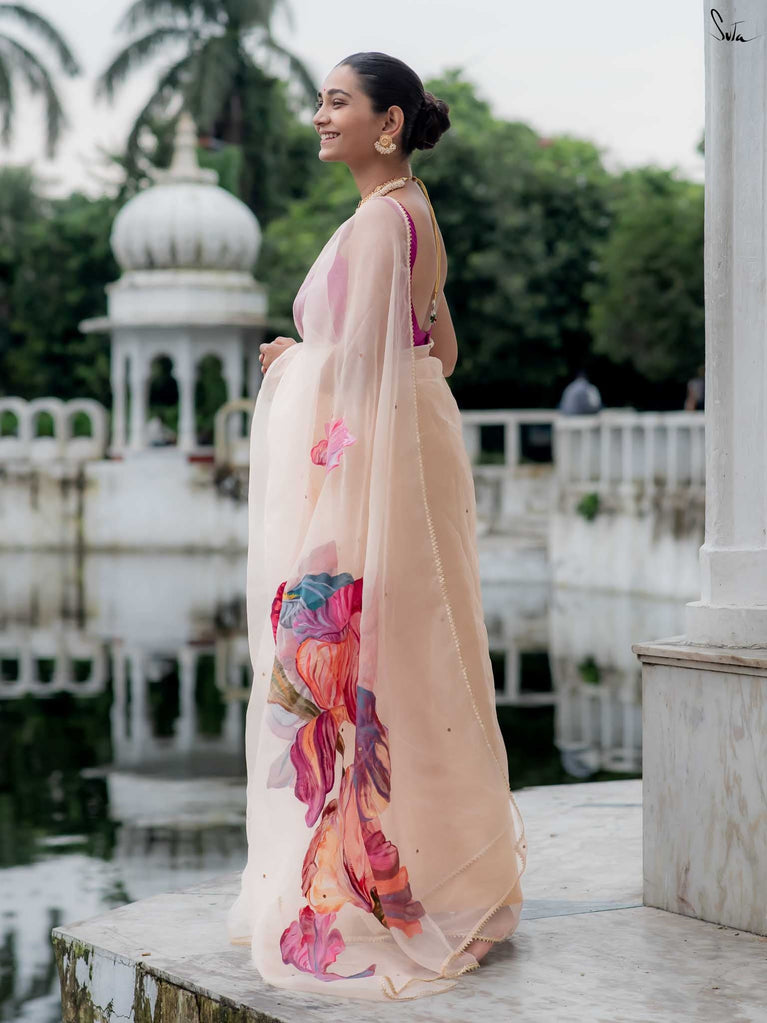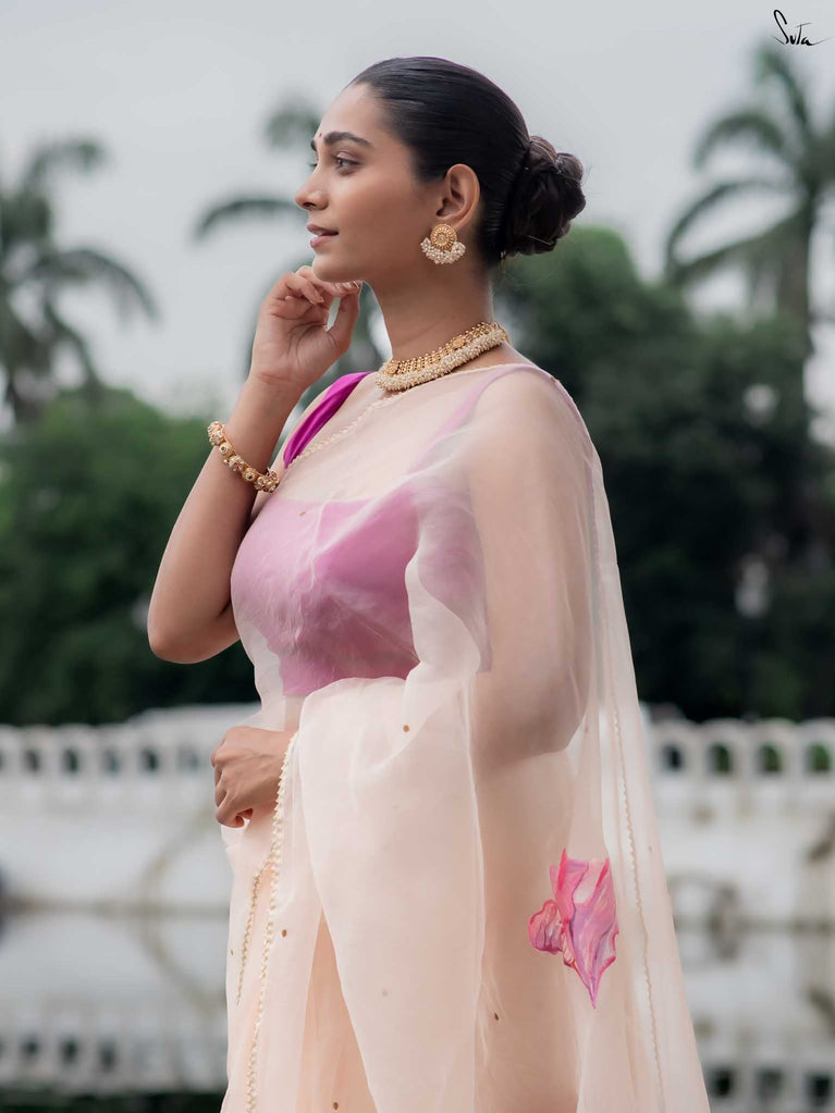 It’s a saree that feels grounded yet glowing - quietly beautiful, effortlessly wearable, and forever in bloom.