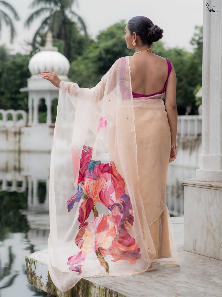 A hand-stitched 3D organza sunflower blooms gently along the drape, brought to life with intricate cording and placed with thoughtful artistry. It’s a motif that doesn’t just sit on the saree - it rises, glows, and adds a touch of handcrafted magic.