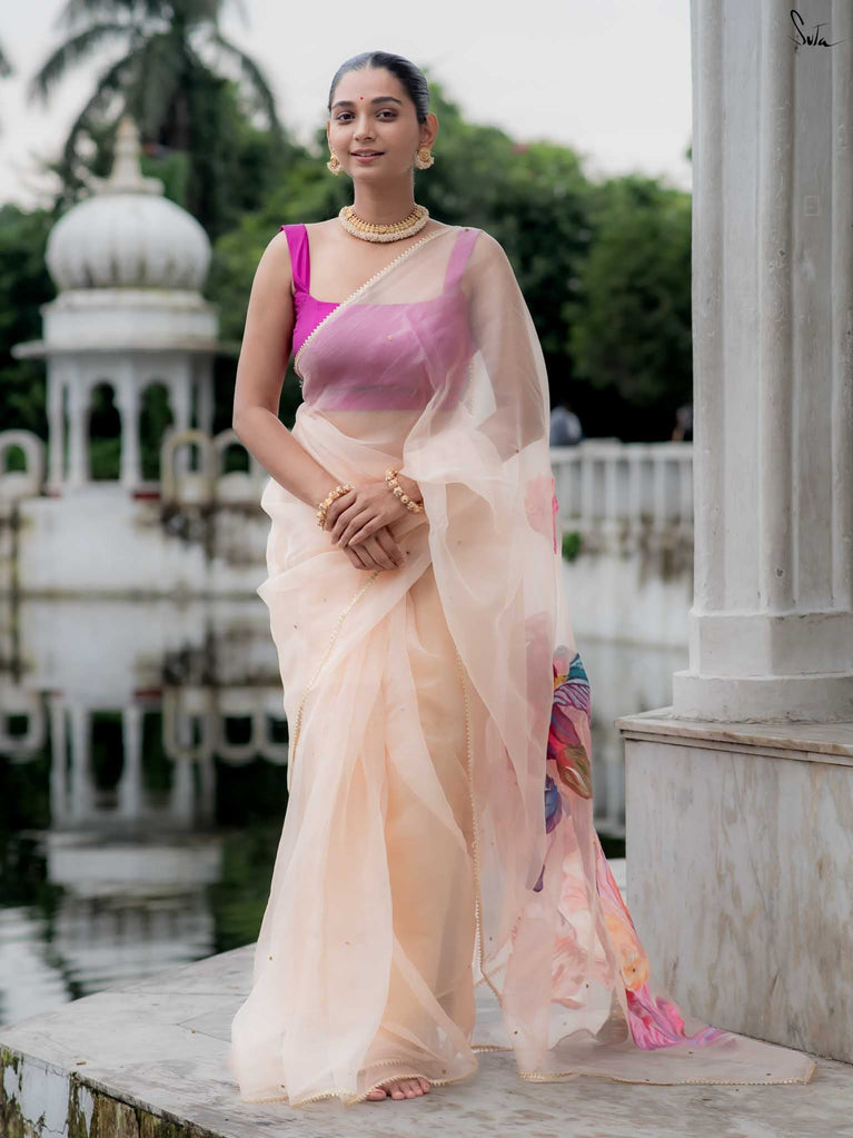 Light as air and translucent like a rainbow, organza silk is a fabric that exudes delicate grandeur. Woven with twisted silk yarn on the warp as well as the weft, this fabric is hailed for its slight transparency and its slightly stiff and yet fluid texture. The slight sheen adds to its charisma, making it the perfect saree to drape for both festive and formal occasions.
