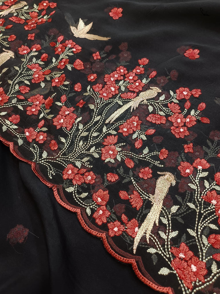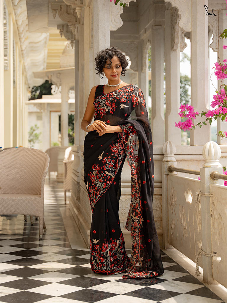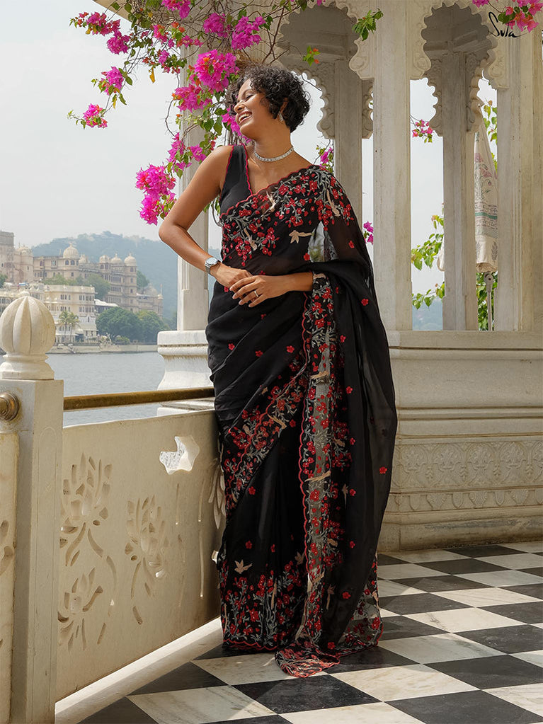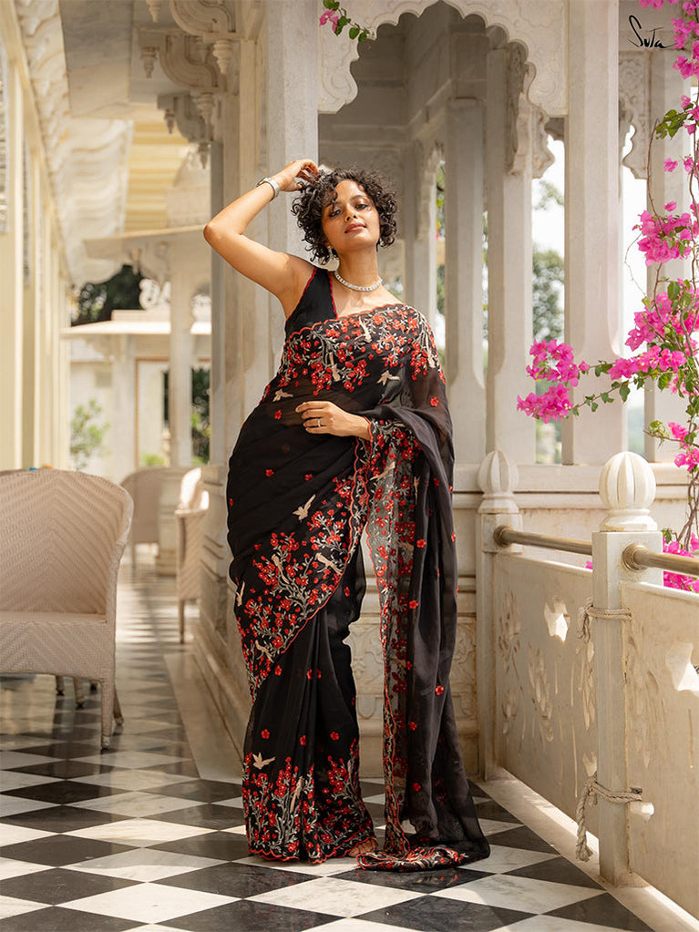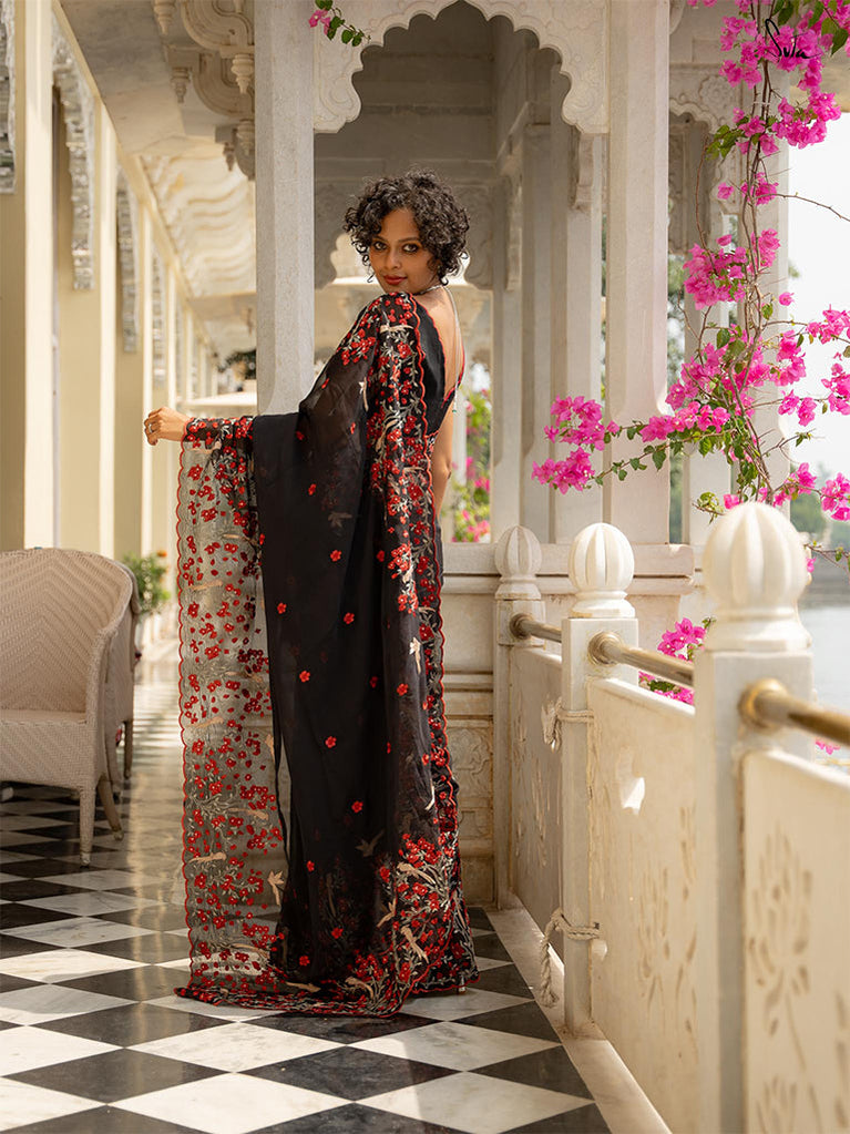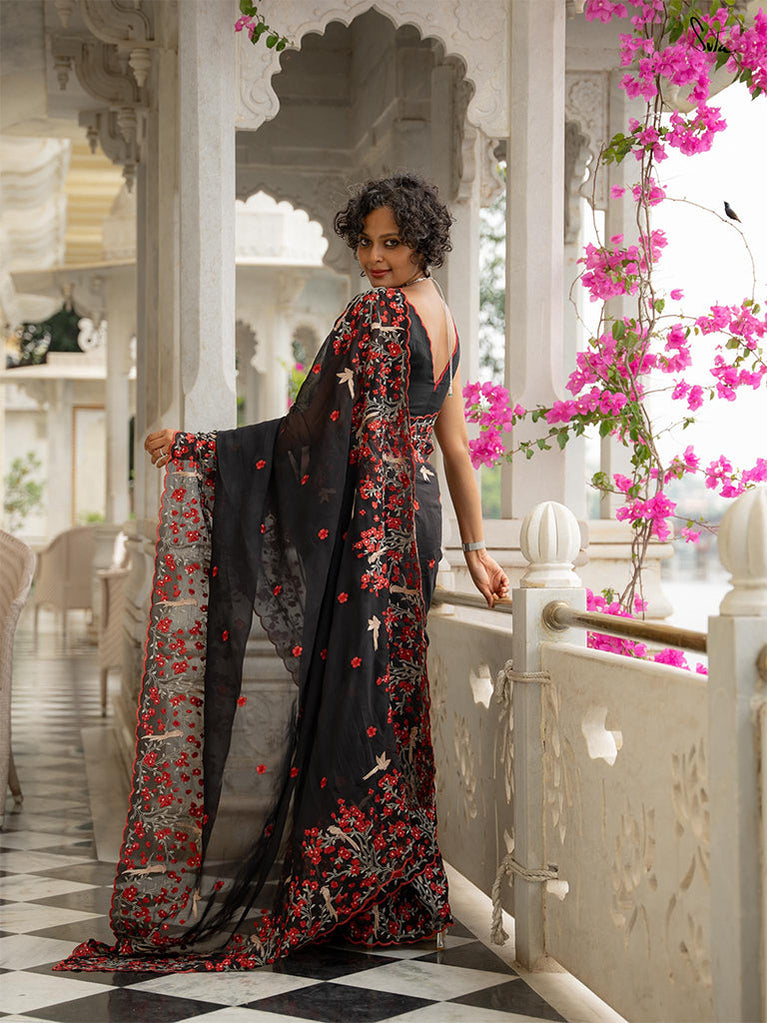 This black saree is crafted from viscose organza fabric with intricate embroidery, depicting soothing scenes of cherry blossom trees and birds. The tiny red flower buttis dancing all over the saree is the optimal final touch.