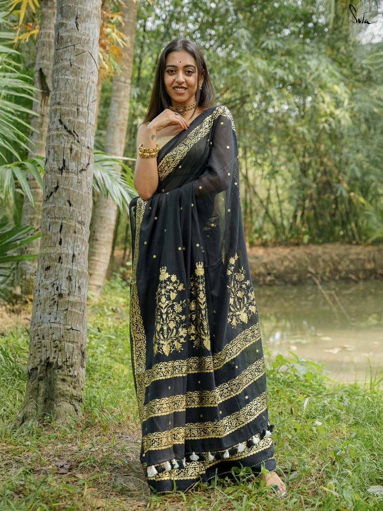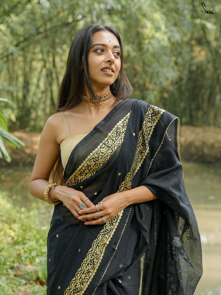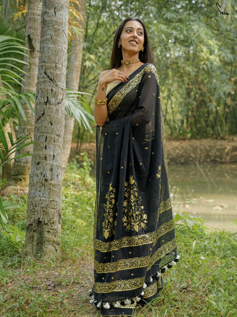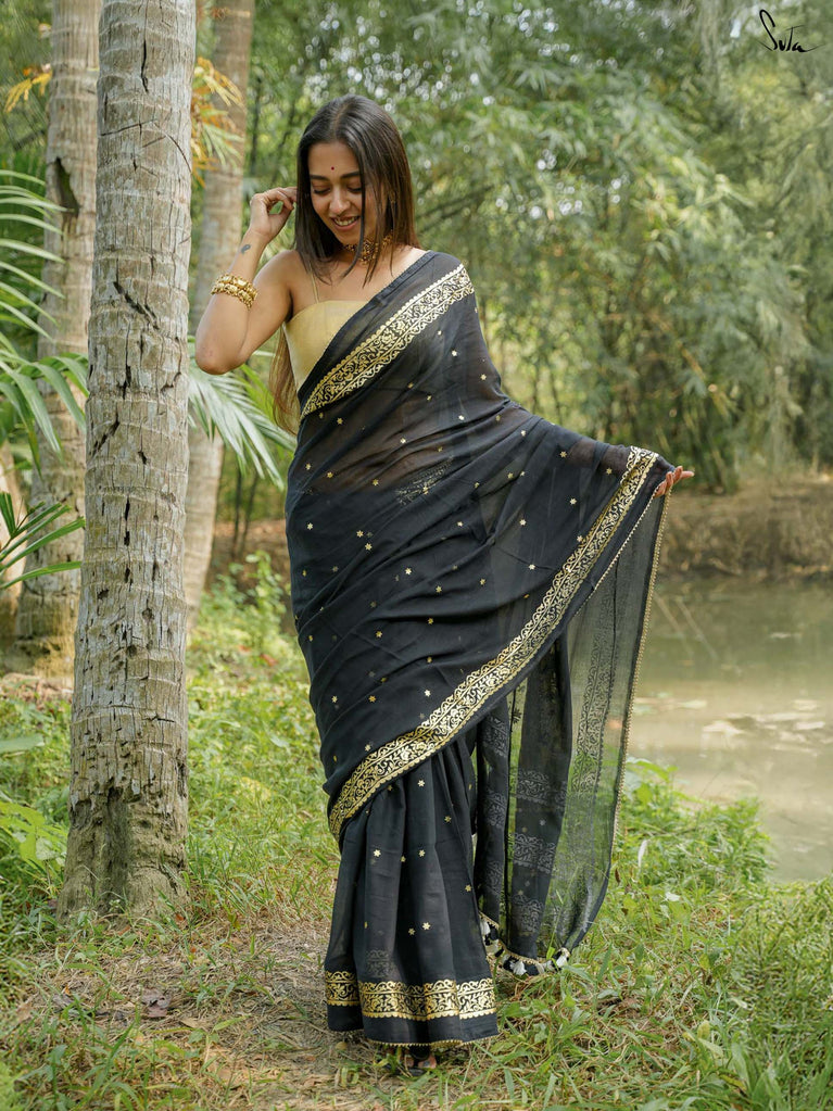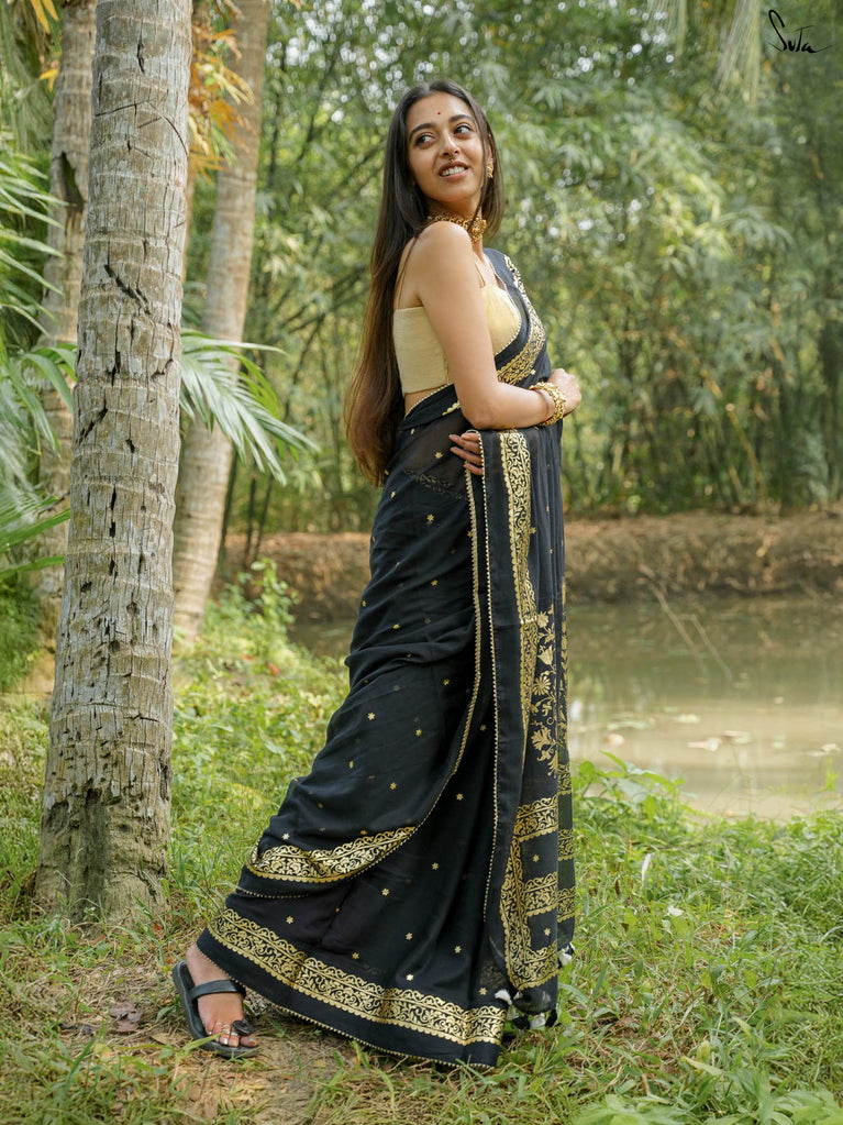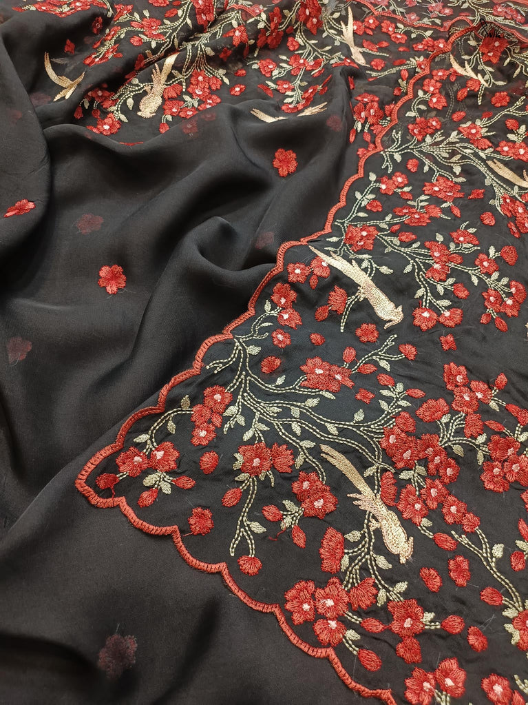 This black saree is crafted from viscose organza fabric with intricate embroidery, depicting soothing scenes of cherry blossom trees and birds. The tiny red flower buttis dancing all over the saree is the optimal final touch.