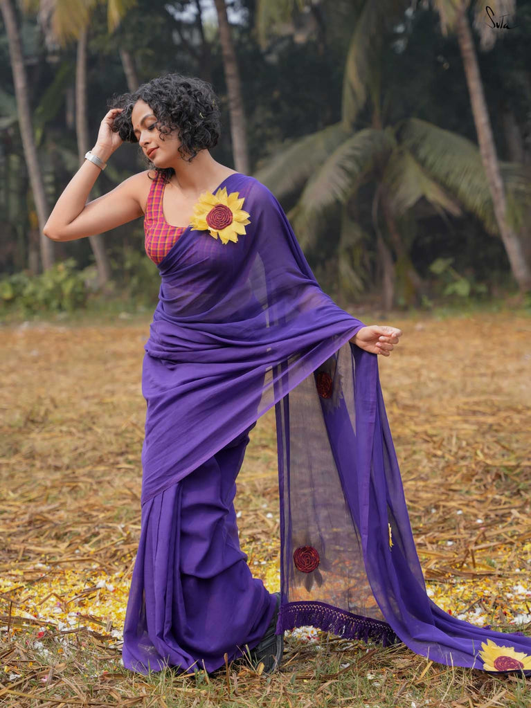 Like a golden ray of sunshine, this deep purple mul cotton saree is adorned with 3D handmade organza sunflowers, their bright yellow blooms bursting with life. The placement motifs and fine cording bring this floral masterpiece to life, like the sun emerging from behind the Holi clouds, ready to shine. The gentle jhalar tassels swing with a soft elegance, like petals floating in a breeze. A saree that feels like the warmth of the sun, wrapped in radiant hues.