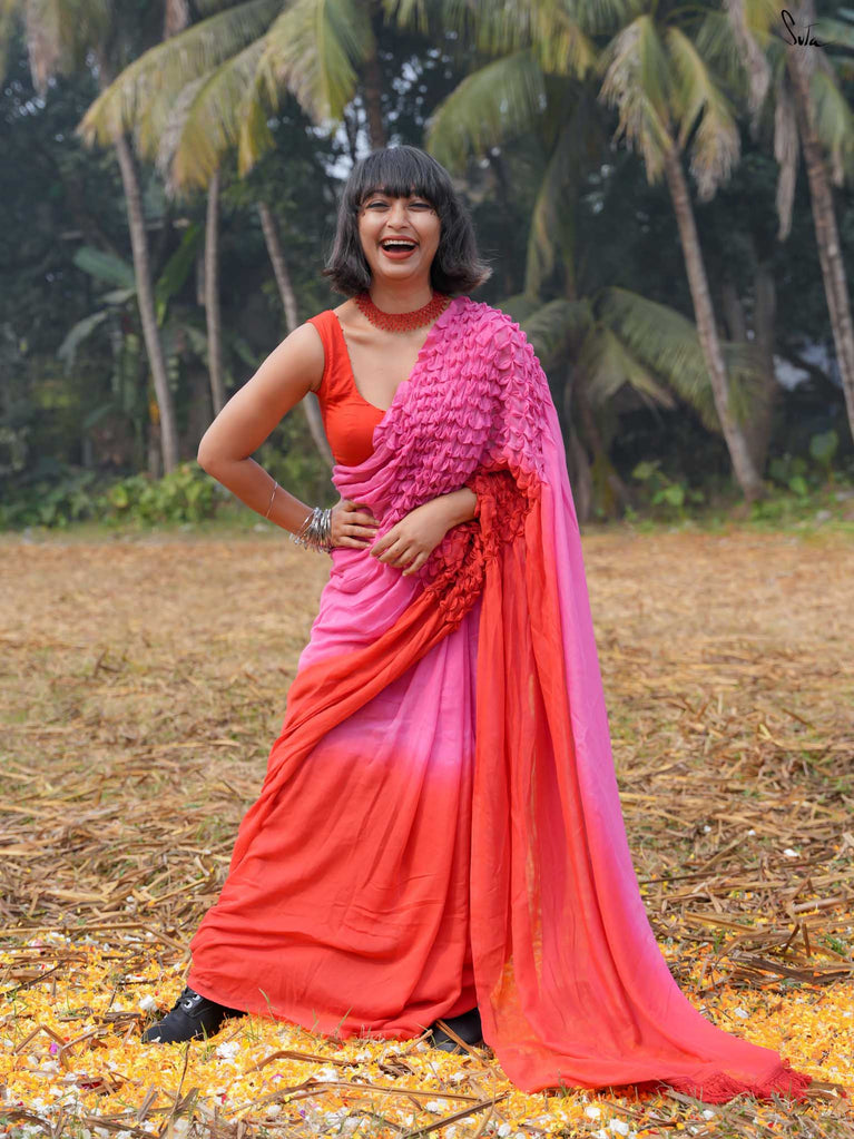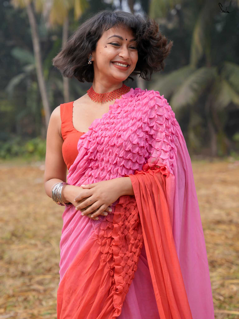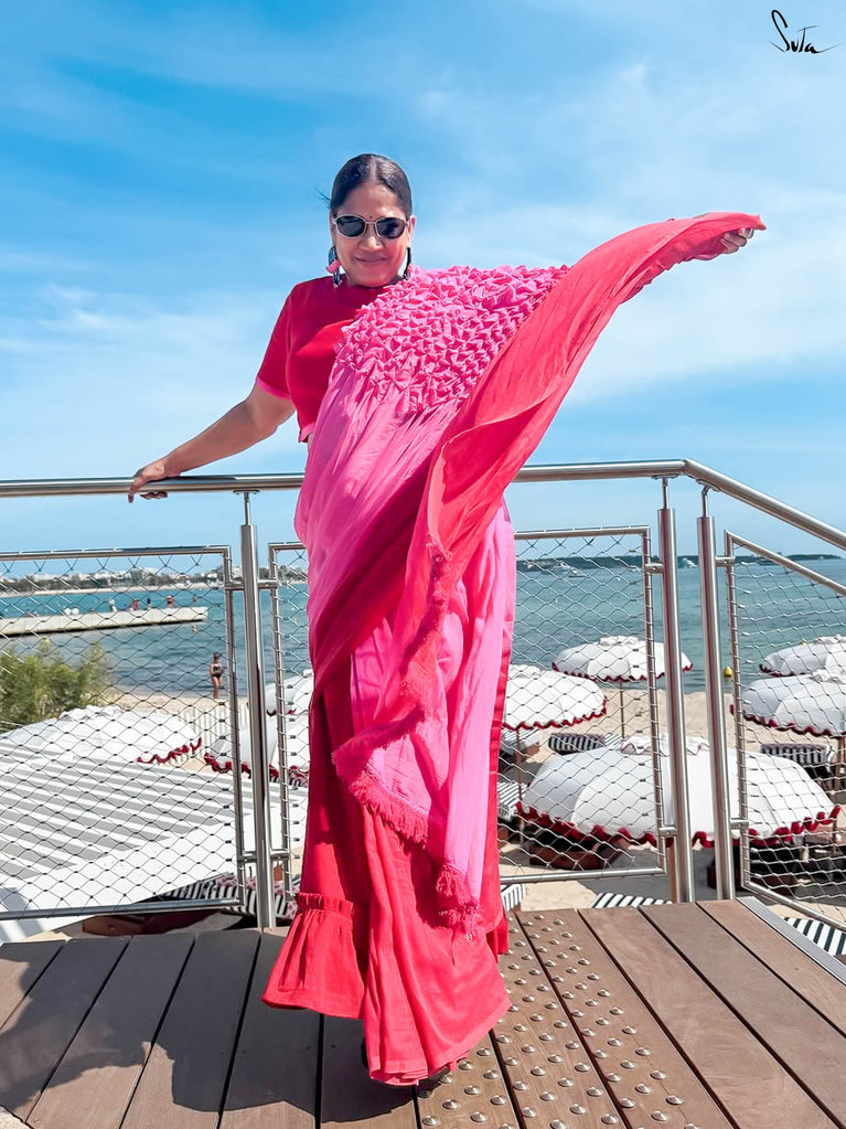 As vibrant and radiant as the festival itself, this red and pink ombre tie-dye mul modal saree is an explosion of color and joy. The tie-dye swirls like a splash of gulaal in the air, capturing the spirit of Holi with every turn. The intricate smocking technique weaves a story of festivity, while the jhalar tassels bring the essence of playfulness into the fabric. This saree isn’t just worn, it’s experienced, like a dance of colors that never ends.