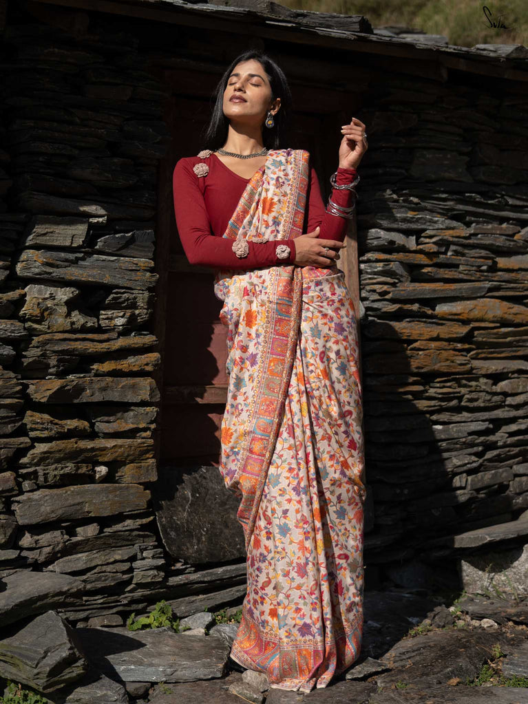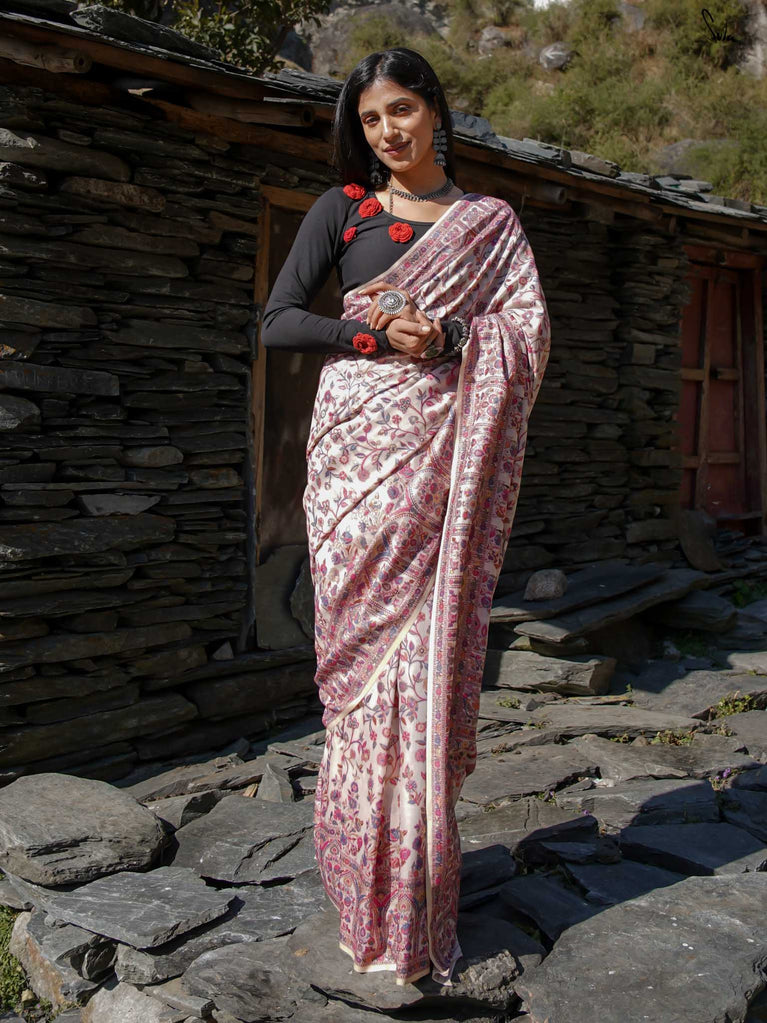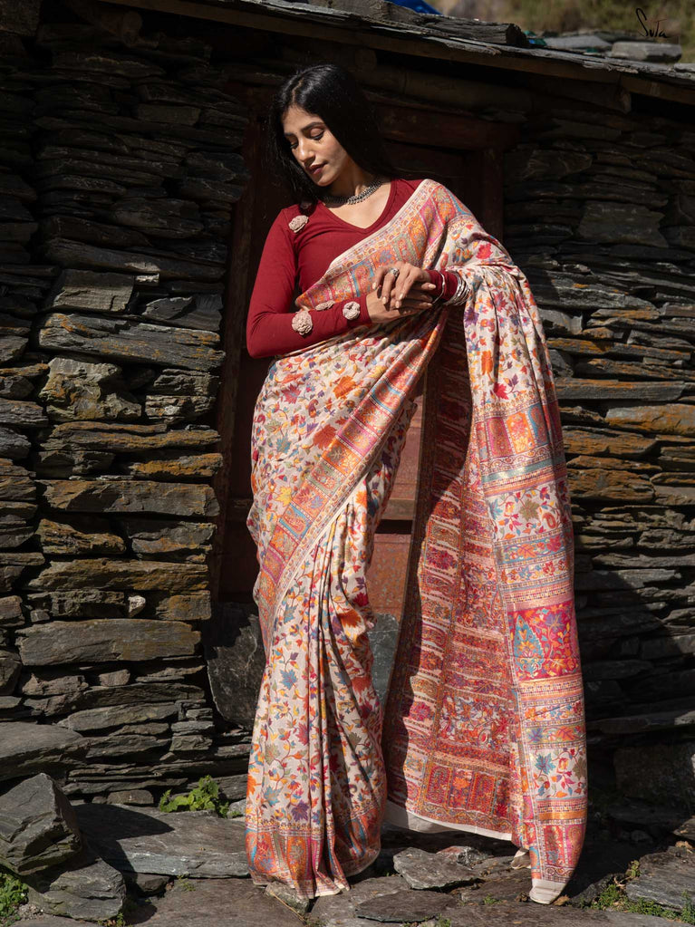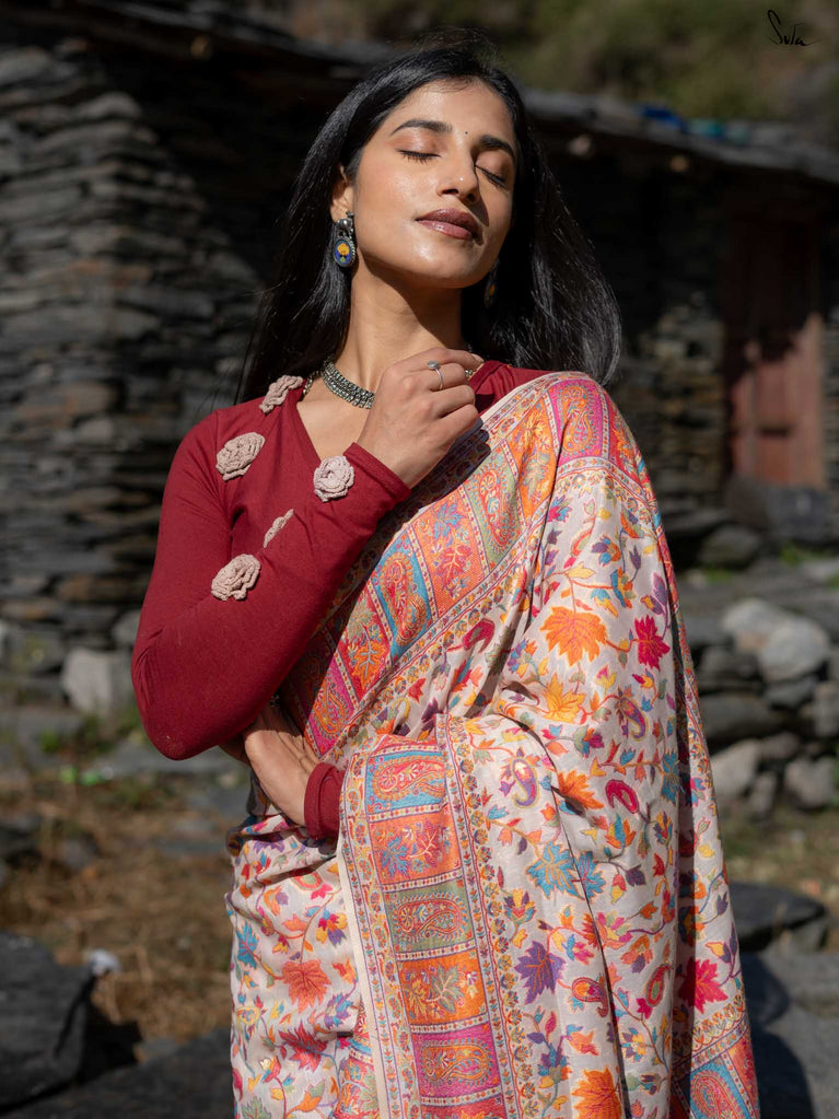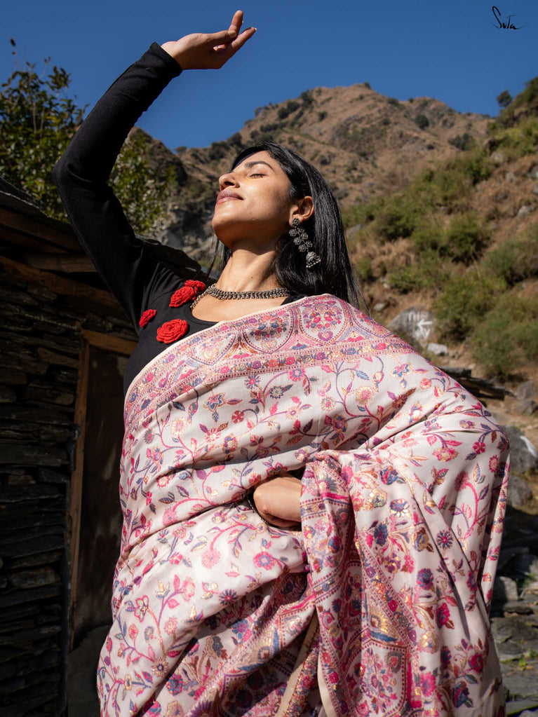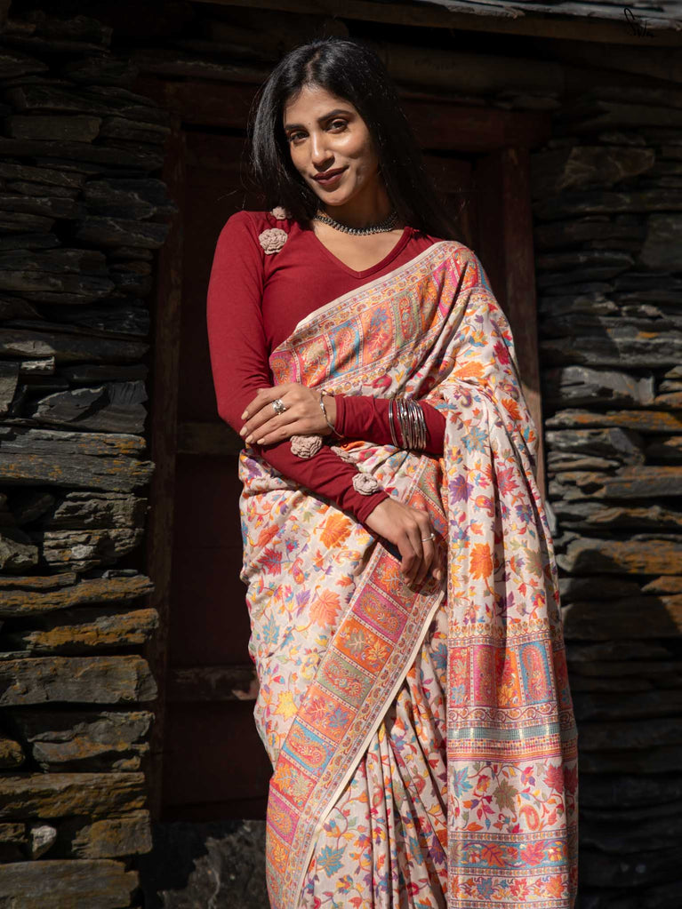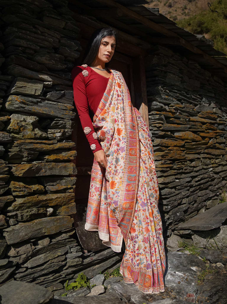 Willow Pashm is as graceful as a willow tree by a quiet stream. Made from a blend of pashmina wool and silk blend, it's warm yet light, rooted in tradition yet easy to wear.The off-white base is brought to life with colourful woven motifs, like flowers blooming in the valleys. Soft, calm, and quietly radiant -this saree captures the peaceful beauty of the Himalayas.Perfect for moments that call for gentle elegance, Willow Pashm is all about effortless grace.