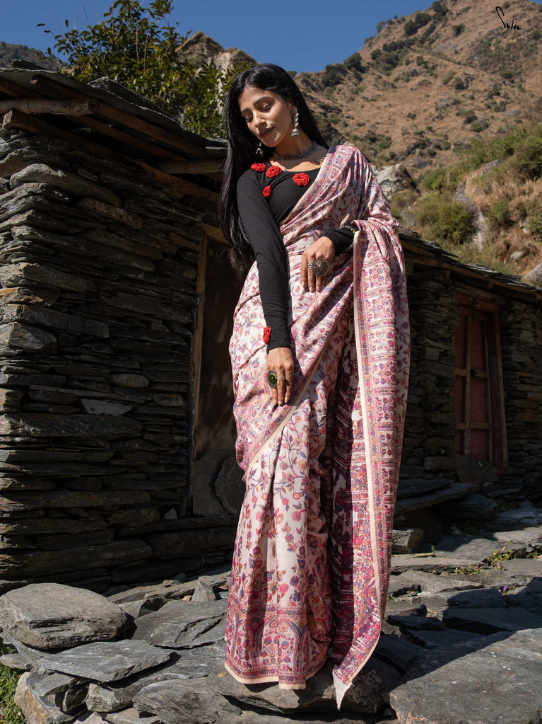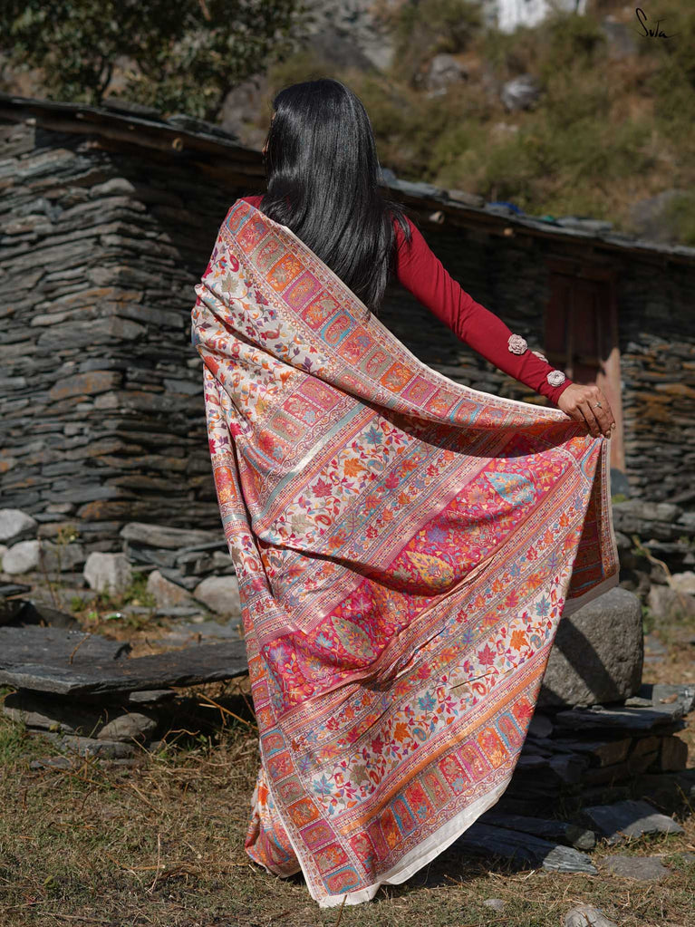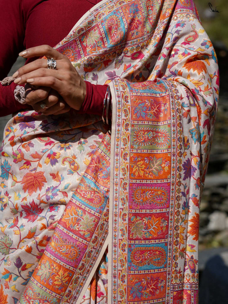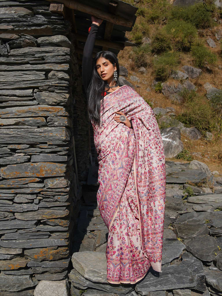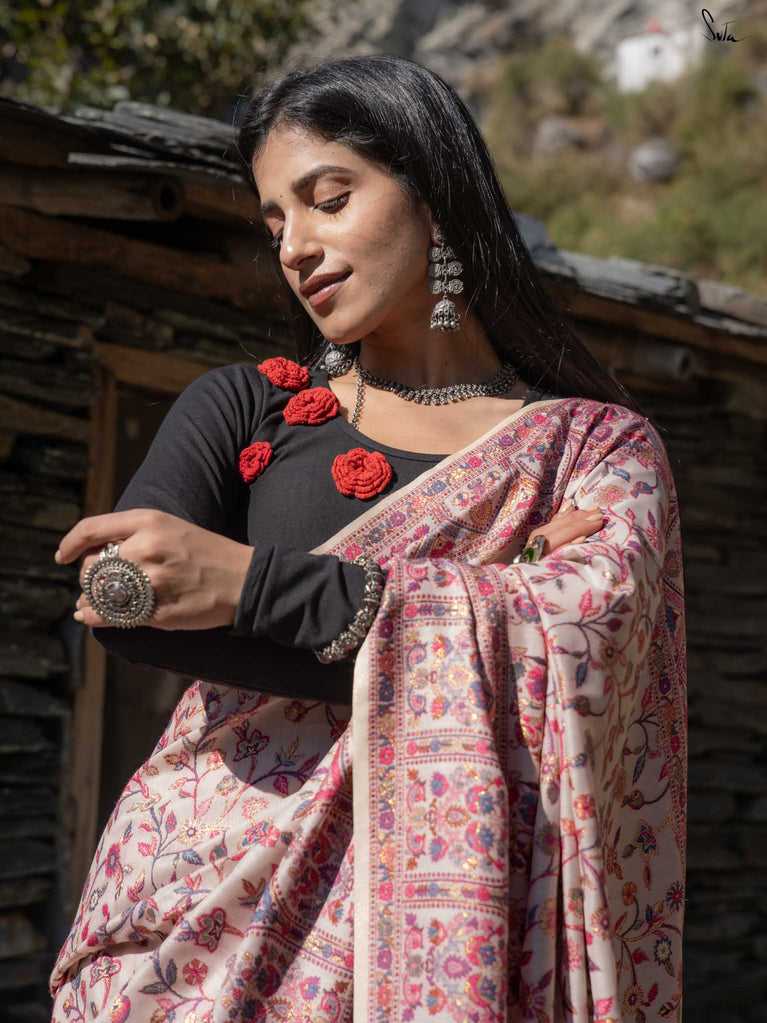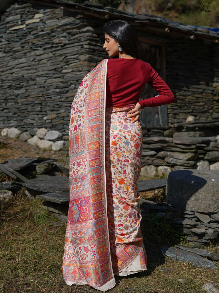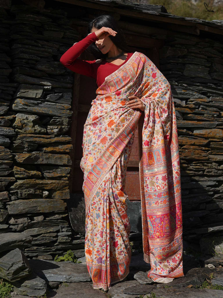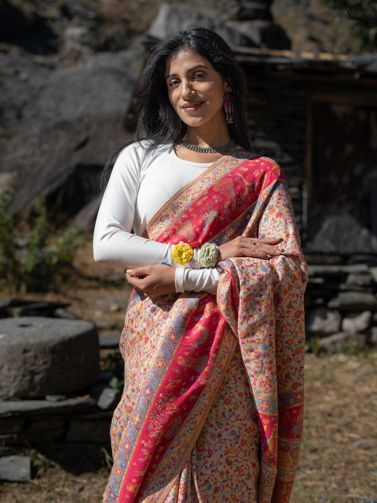 Willow Pashm is as graceful as a willow tree by a quiet stream. Made from a blend of pashmina wool and silk blend, it's warm yet light, rooted in tradition yet easy to wear.The off-white base is brought to life with colourful woven motifs, like flowers blooming in the valleys. Soft, calm, and quietly radiant -this saree captures the peaceful beauty of the Himalayas.Perfect for moments that call for gentle elegance, Willow Pashm is all about effortless grace.