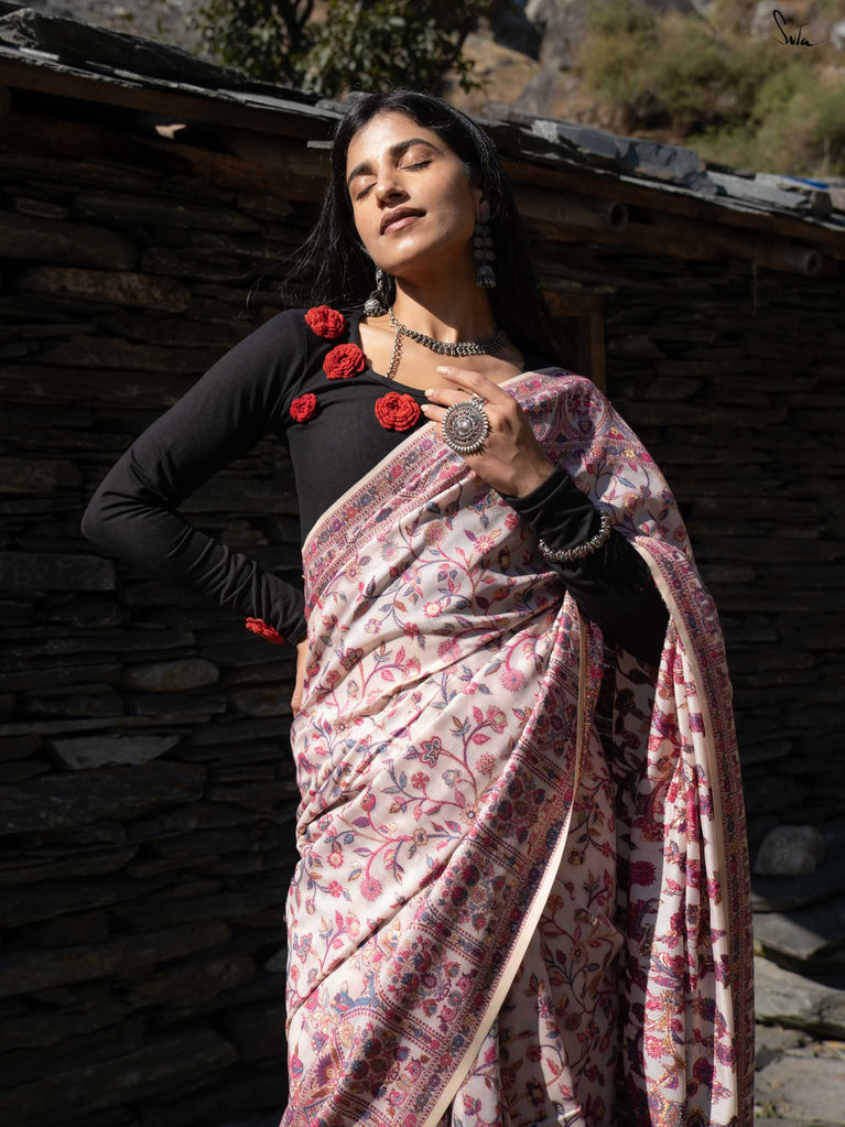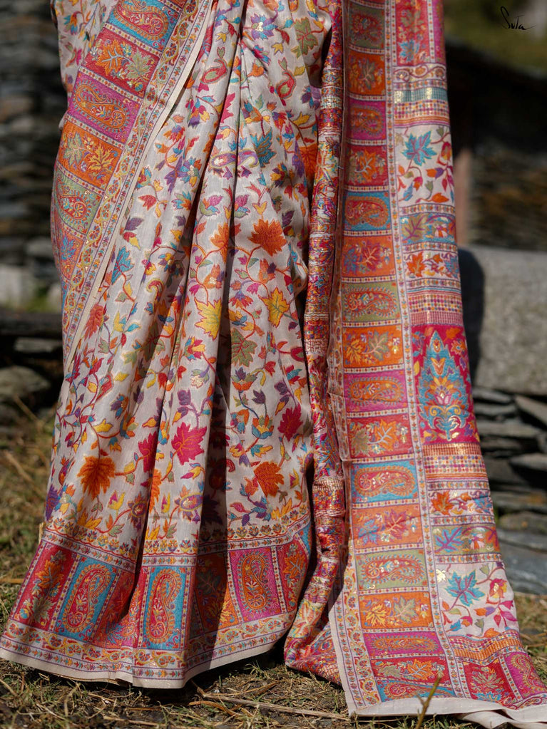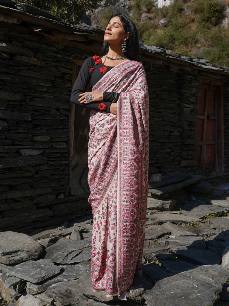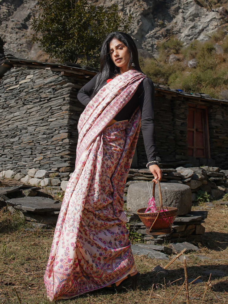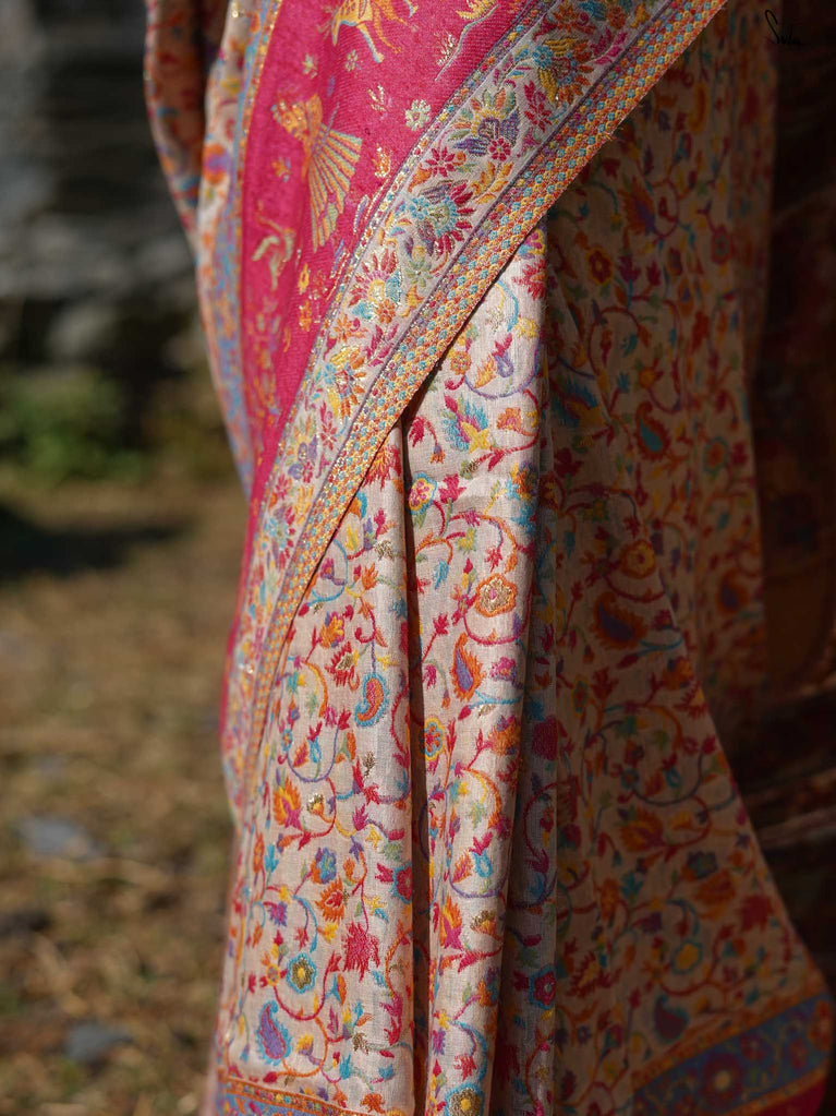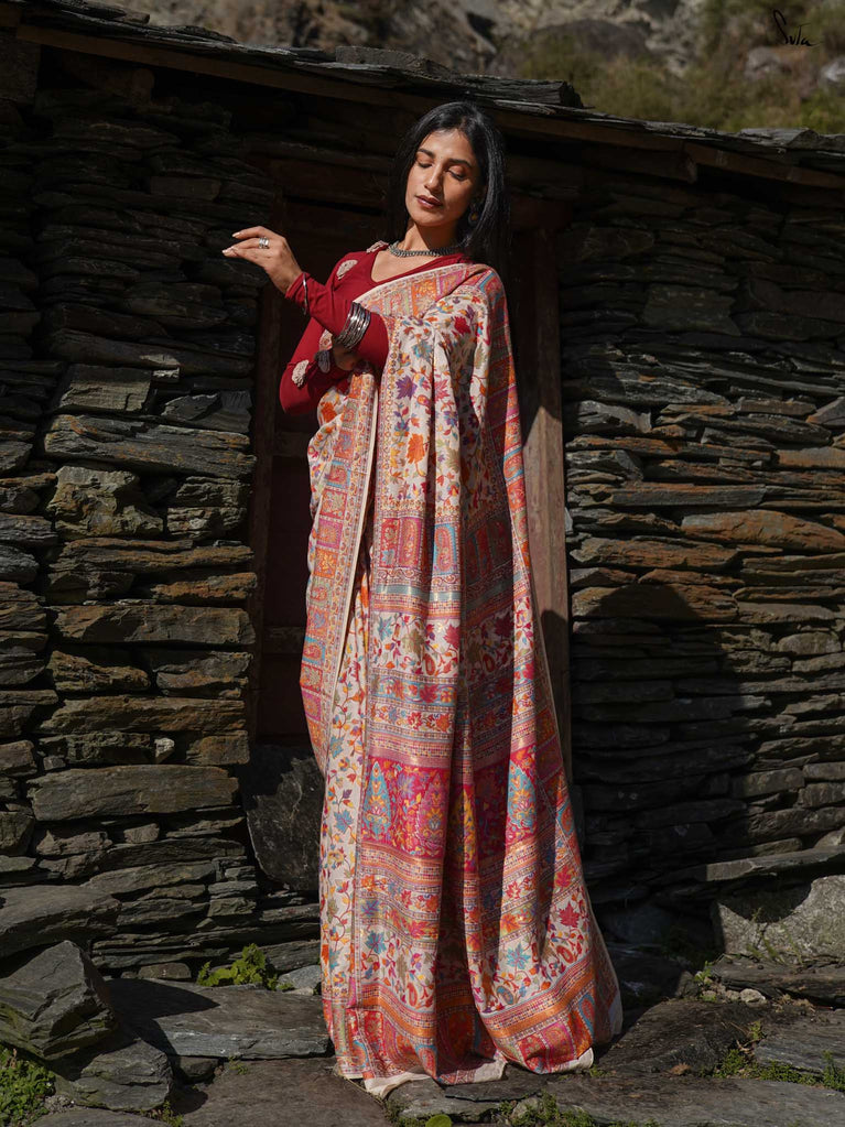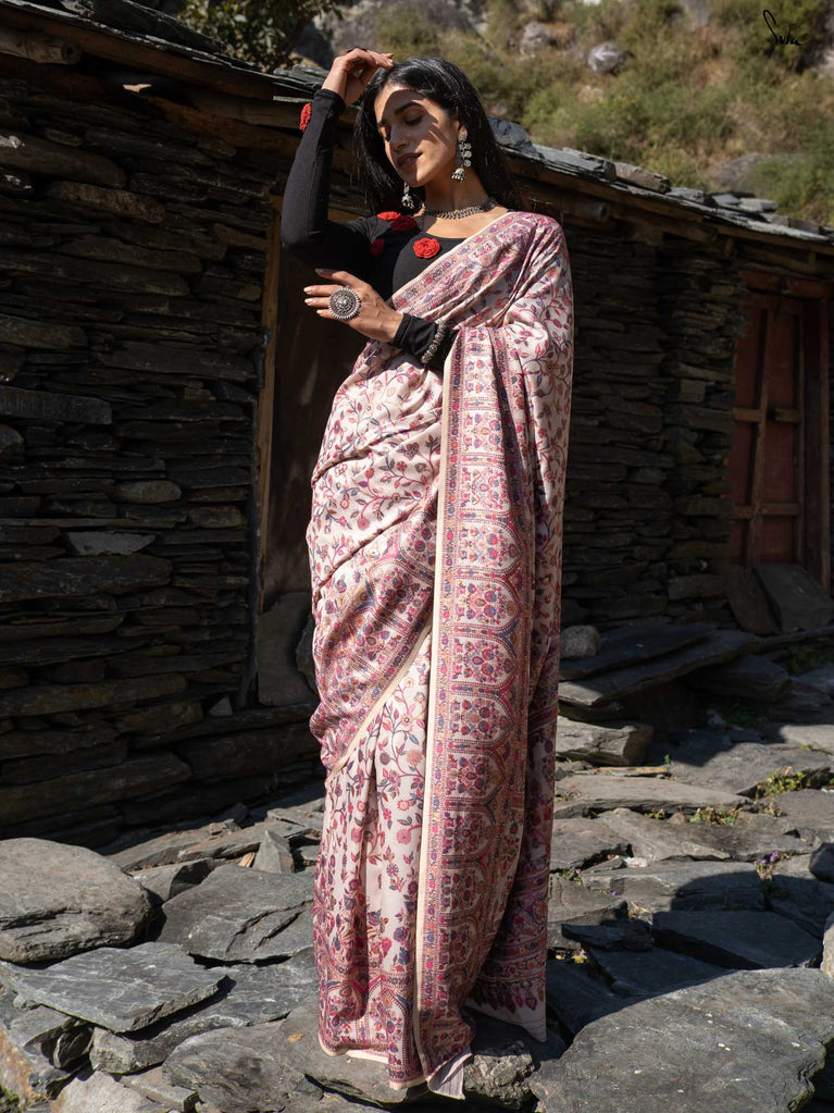 Willow Pashm is as graceful as a willow tree by a quiet stream. Made from a blend of pashmina wool and silk blend, it's warm yet light, rooted in tradition yet easy to wear.The off-white base is brought to life with colourful woven motifs, like flowers blooming in the valleys. Soft, calm, and quietly radiant -this saree captures the peaceful beauty of the Himalayas.Perfect for moments that call for gentle elegance, Willow Pashm is all about effortless grace.