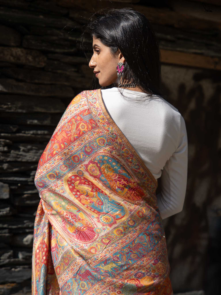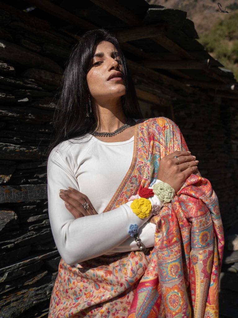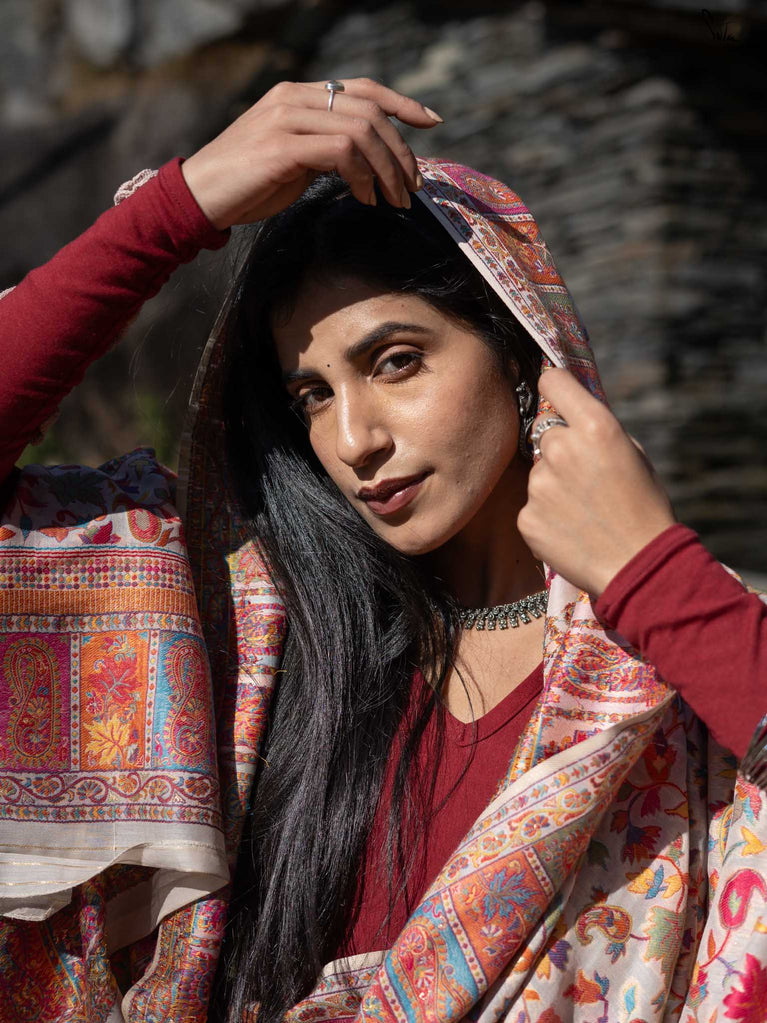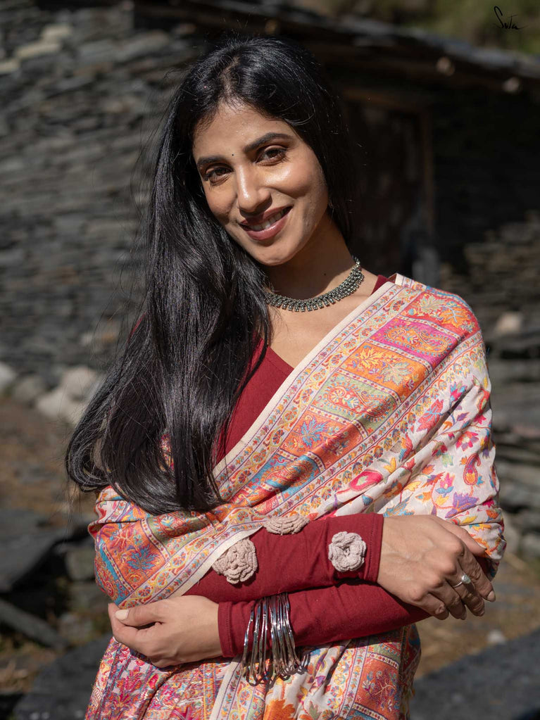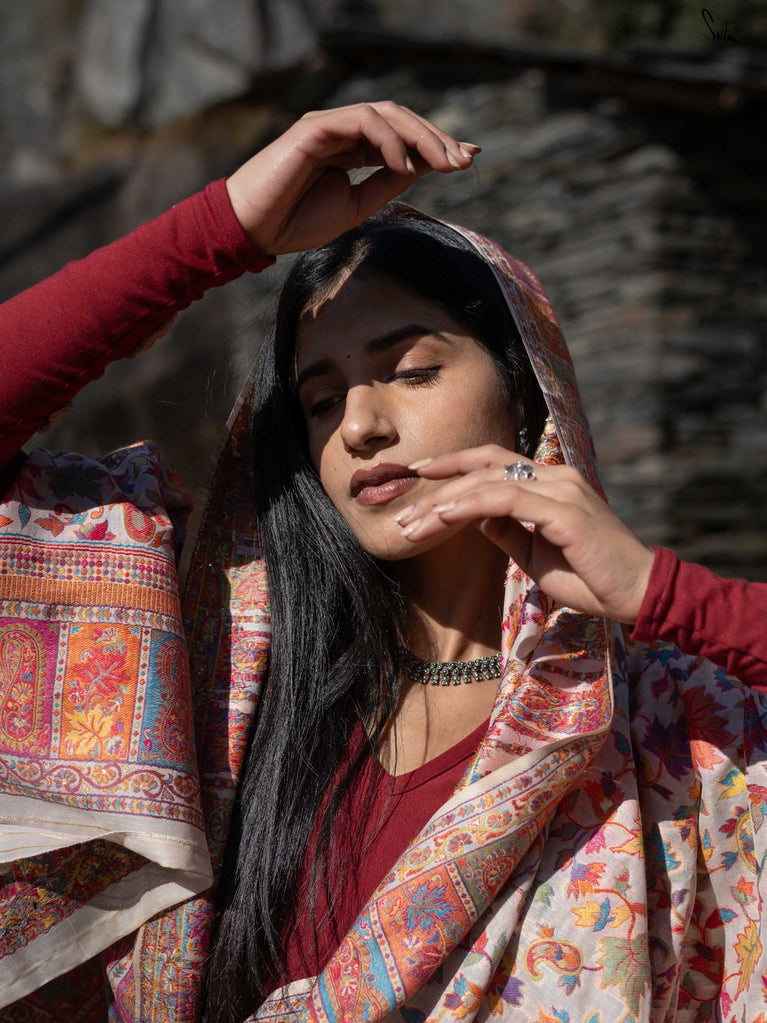 Deodar Pashm takes its inspiration from the Himalayan cedar-strong, rooted, and serene. Made from a soft blend of pashmina wool and silk blend, it feels like warm light on skin.The beige base reflects the quiet beauty of earth, while colourful woven motifs bloom like wildflowers after rain. Graceful and grounded, Deodar Pashm is perfect for the woman who carries quiet strength and endless elegance.