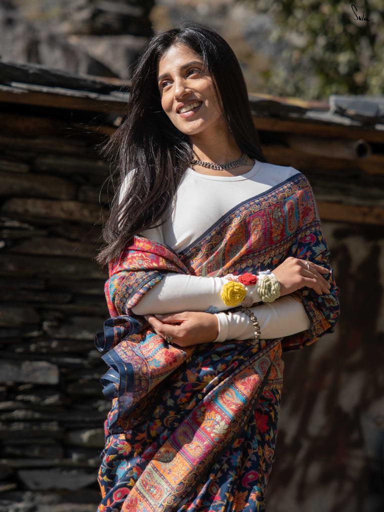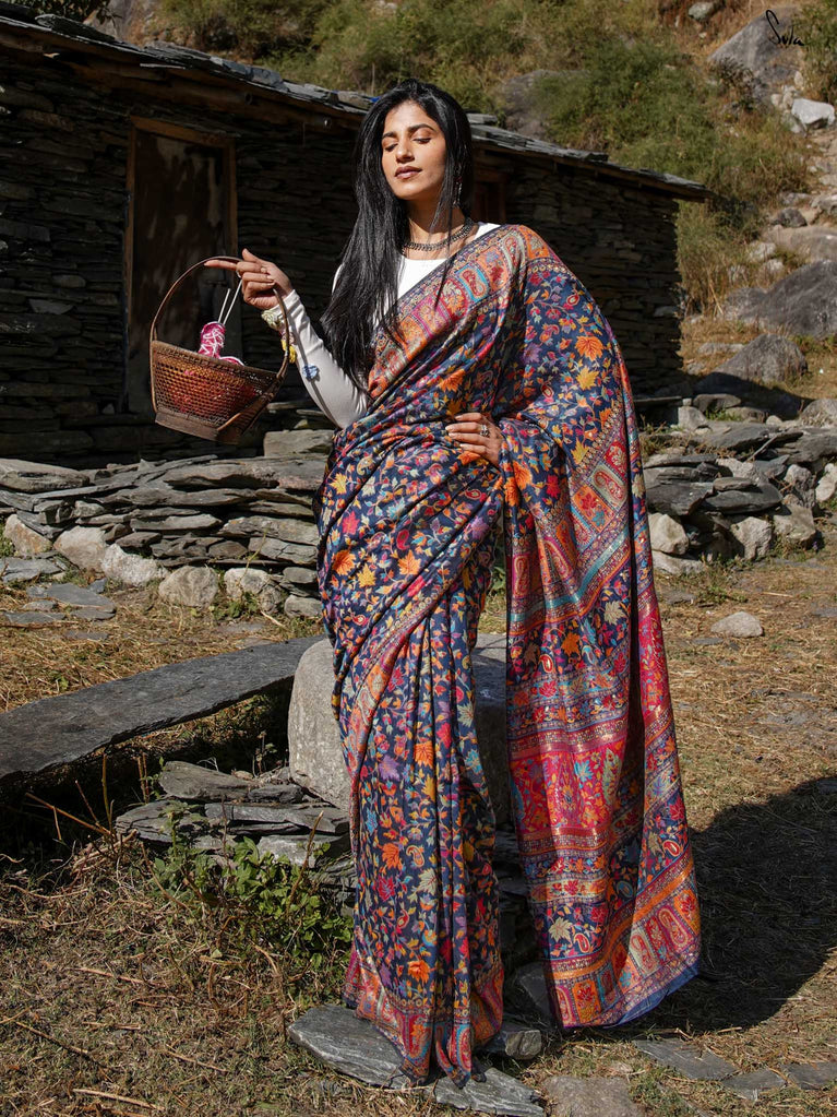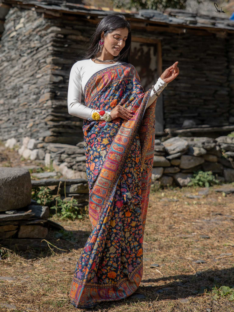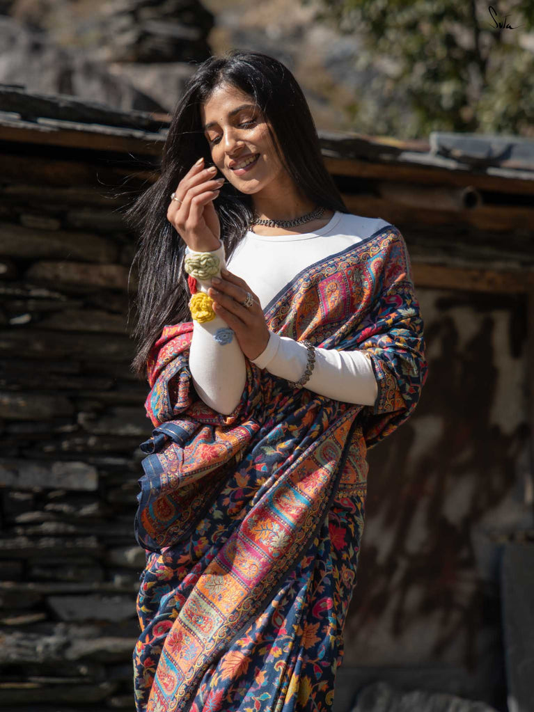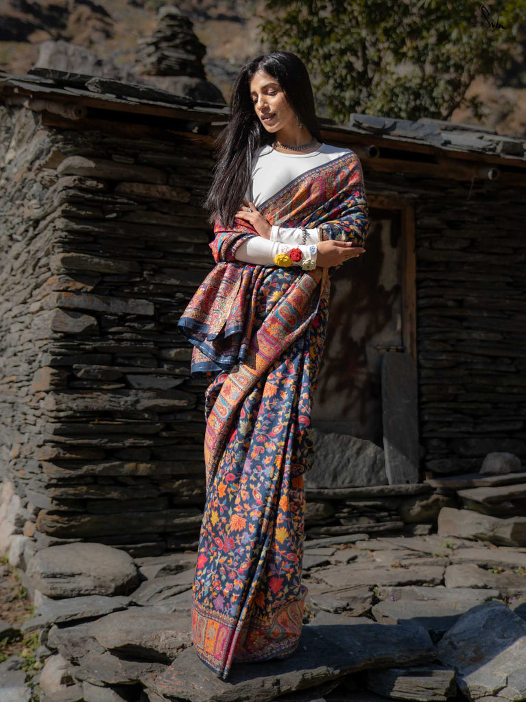 Apricot Pashm feels like apricot flowers opening under a twilight sky. Woven from a soft blend of pashmina wool and silk blend, it’s light, fluid, and effortless to wear.The deep blue base shines with colourful woven motifs, inspired by Kashmiri artistry and serene mountain evenings. Warm, elegant, and easy this saree blends tradition with modern charm.Made for the woman who seeks beauty in softness, Apricot Pashm brings strength wrapped in grace.