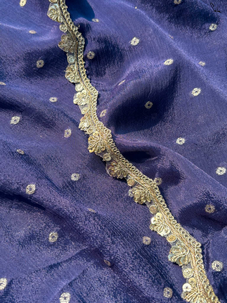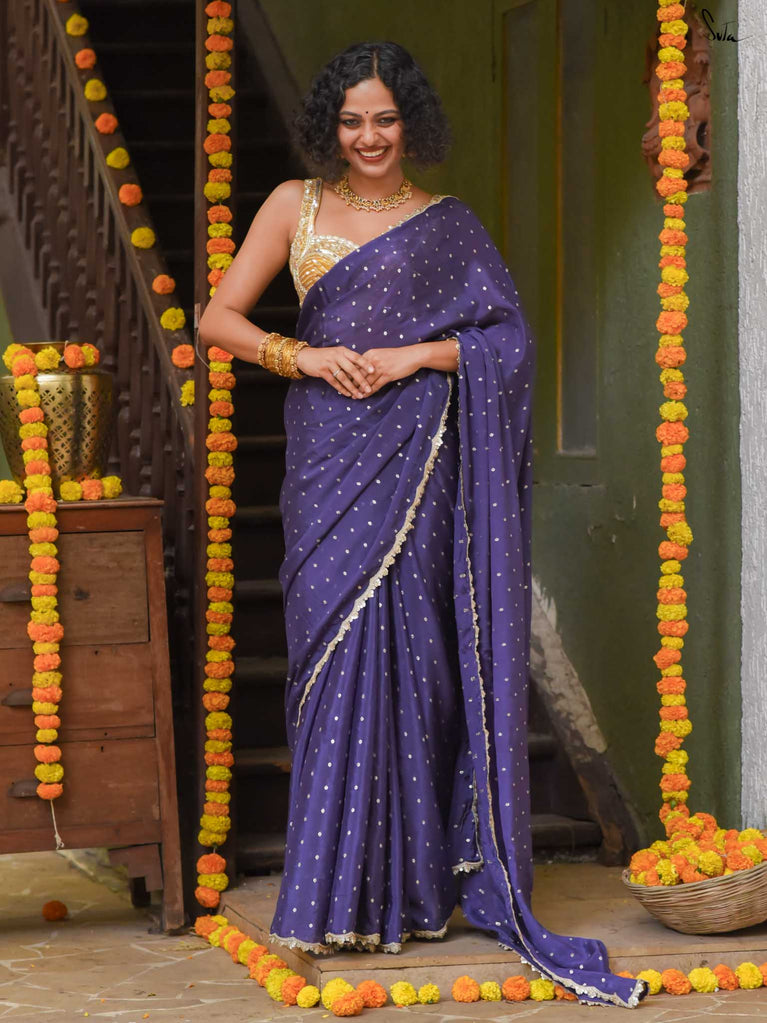 Deep, refined, and effortless - this navy blue viscose-blend saree brings a rich elegance to every occasion. The smooth, fluid drape is dotted with light gold woven buttis, adding a soft glow against the dark base. Finished with an embroidered scallop lace, it carries a polished, timeless charm perfect for evening weddings, receptions, and celebratory gatherings.